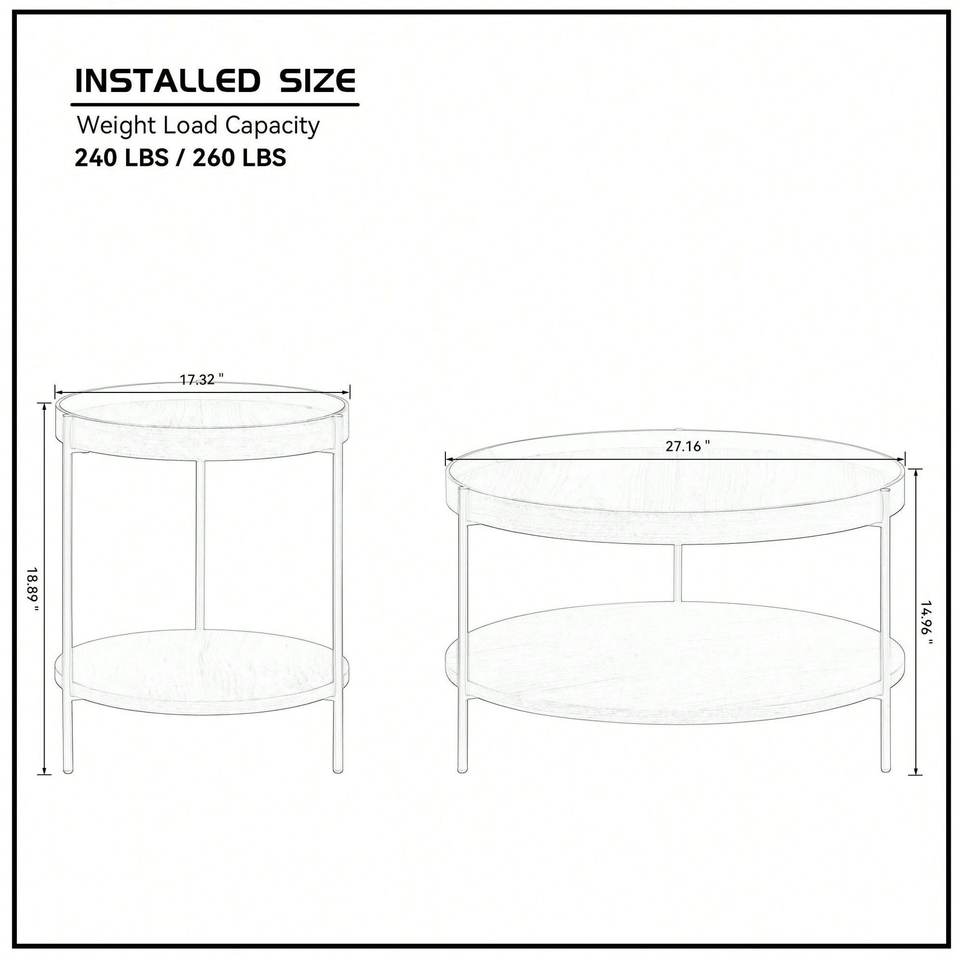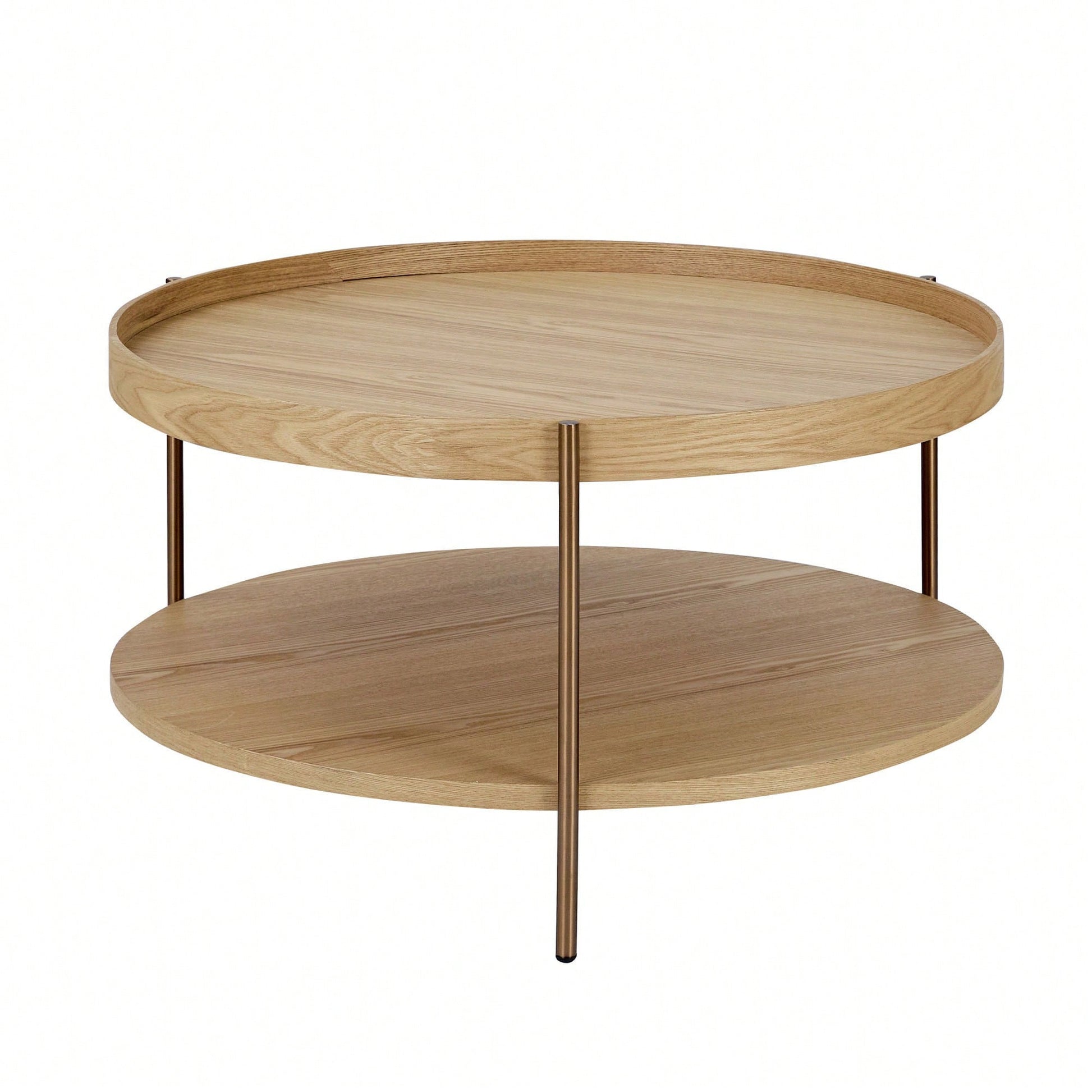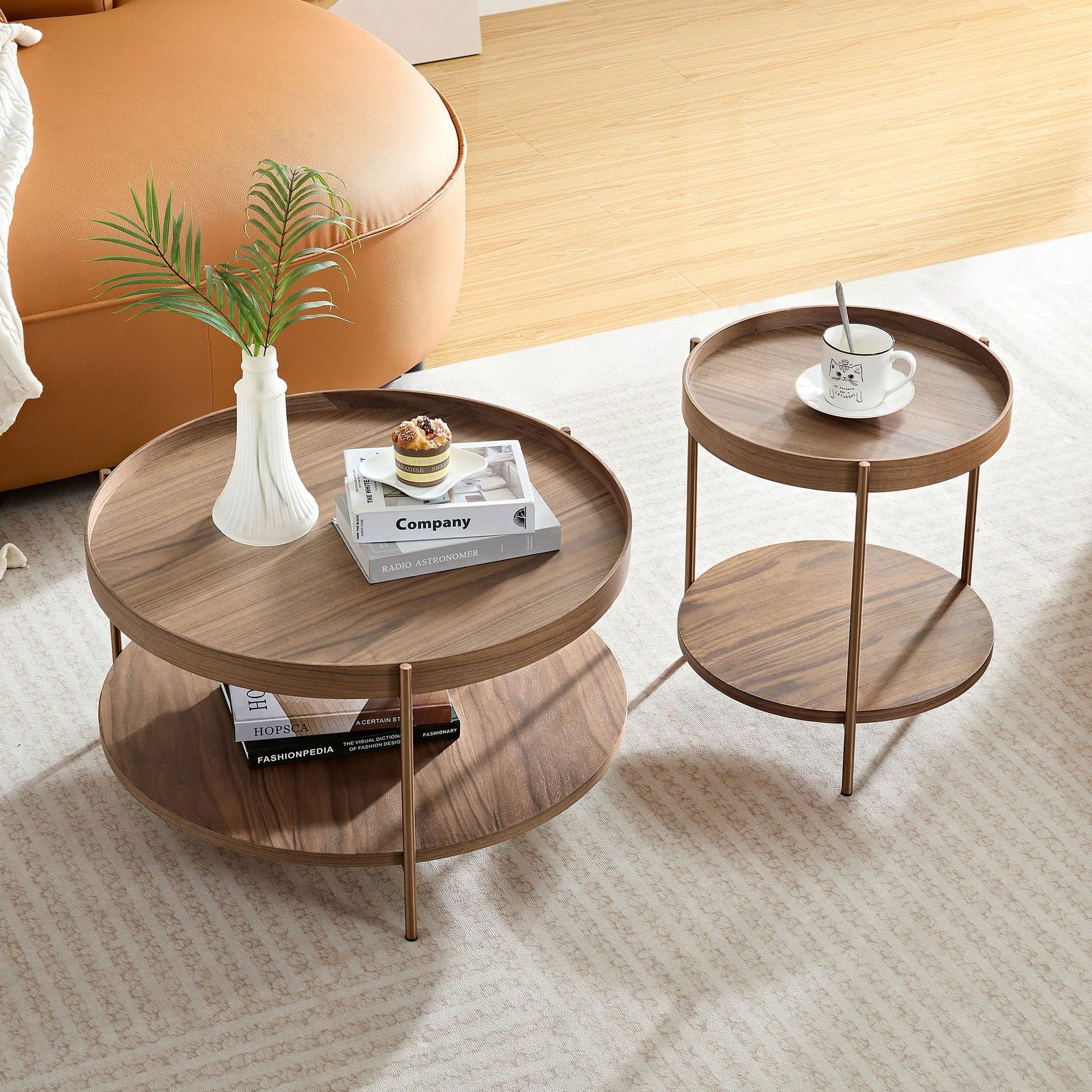 This modern 2-piece round coffee table set is perfect for any living room, bedroom, office, or outdoor space. Designed with a compact size and lightweight structure, these tables can easily be moved and placed in various locations as needed. The two-tier design offers additional storage for books, magazines, and other essentials, while the elegant manchurian ash tabletop adds a touch of sophistication to your decor. The stainless steel legs provide stability and durability, ensuring long-lasting use. The raised edge design enhances safety by minimizing the risk of items falling off the table. Assembly is straightforward with provided hardware and instructions, and the smooth surface allows for easy cleaning and maintenance.