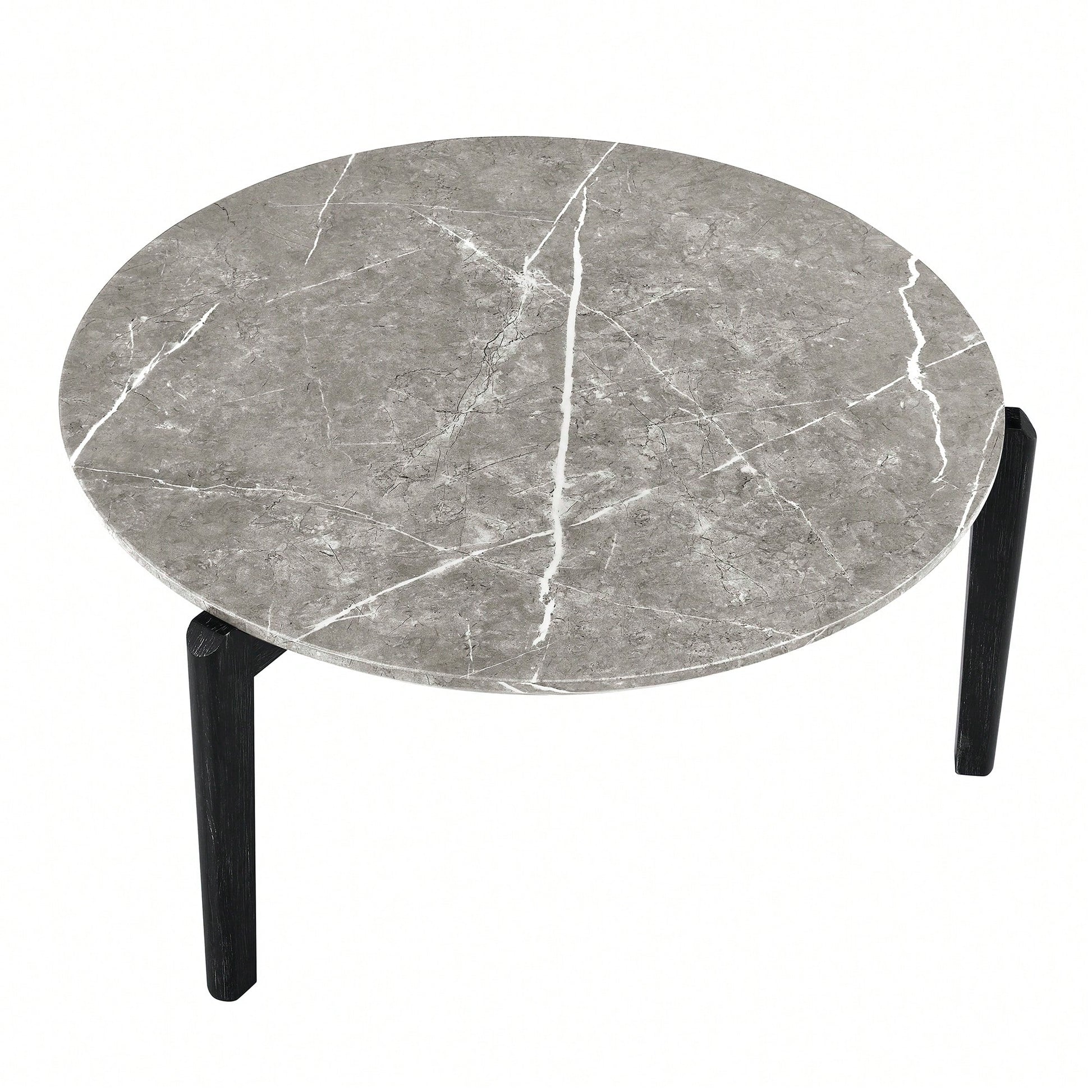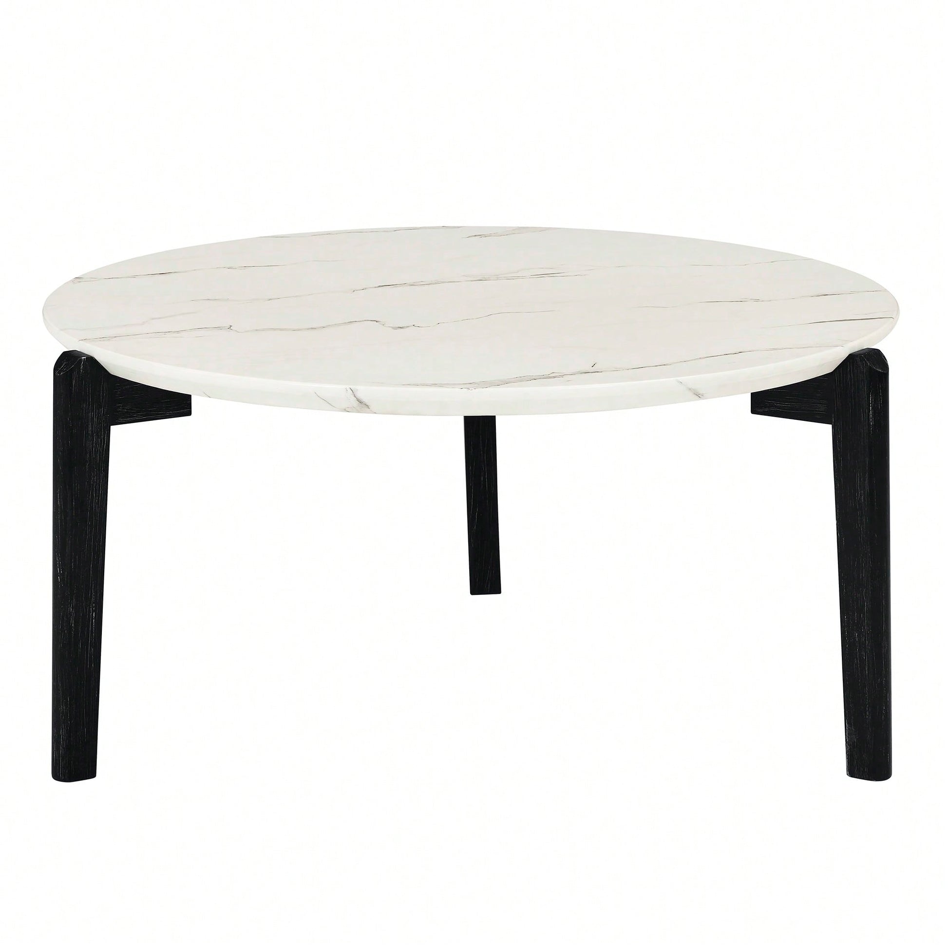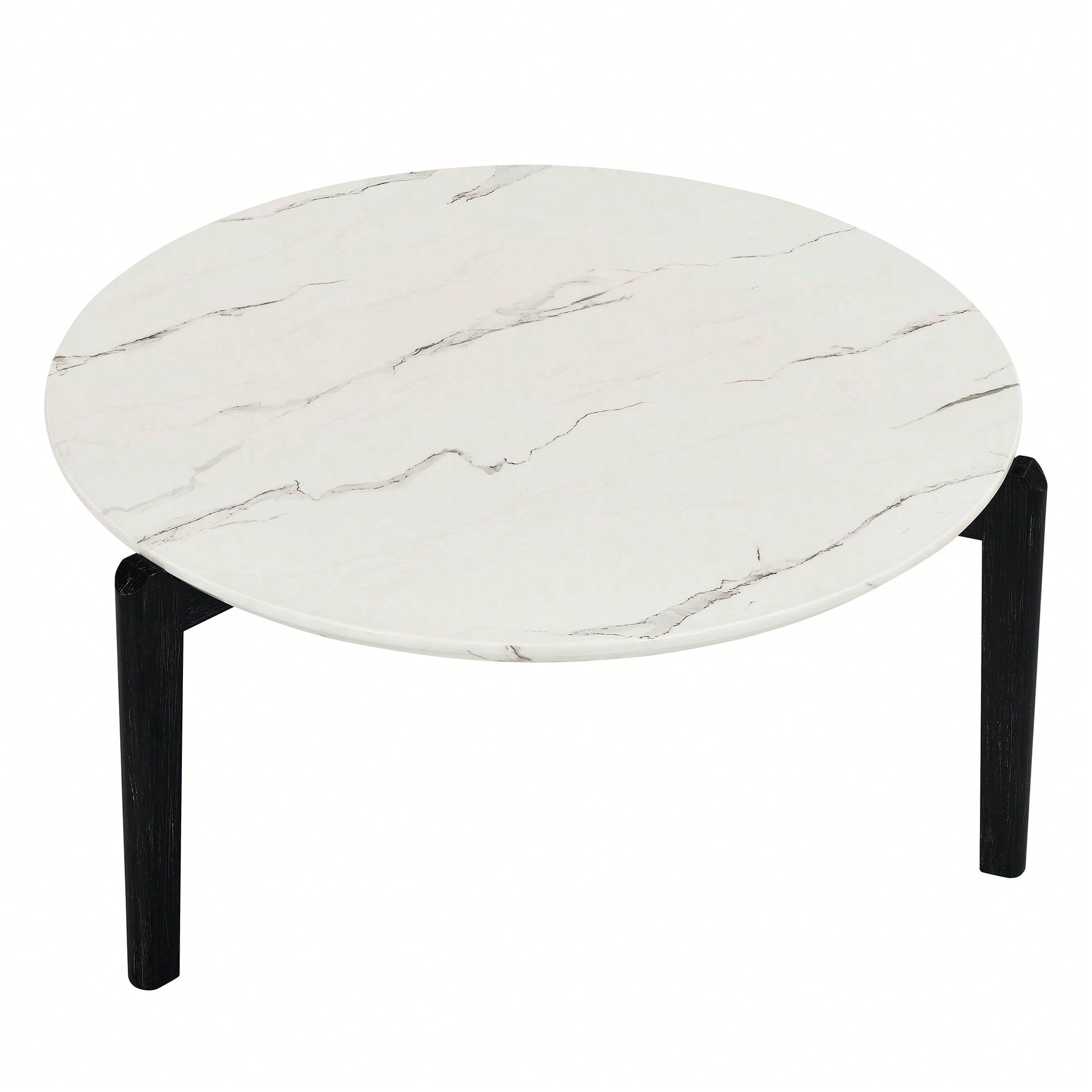 Modern 36 Inch Round Coffee Table With Imitation Marble Top And Solid Rubber Wood Legs For Living Room And Office