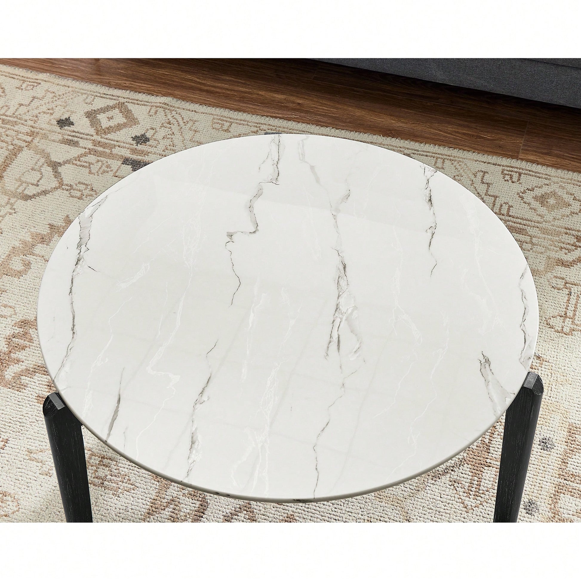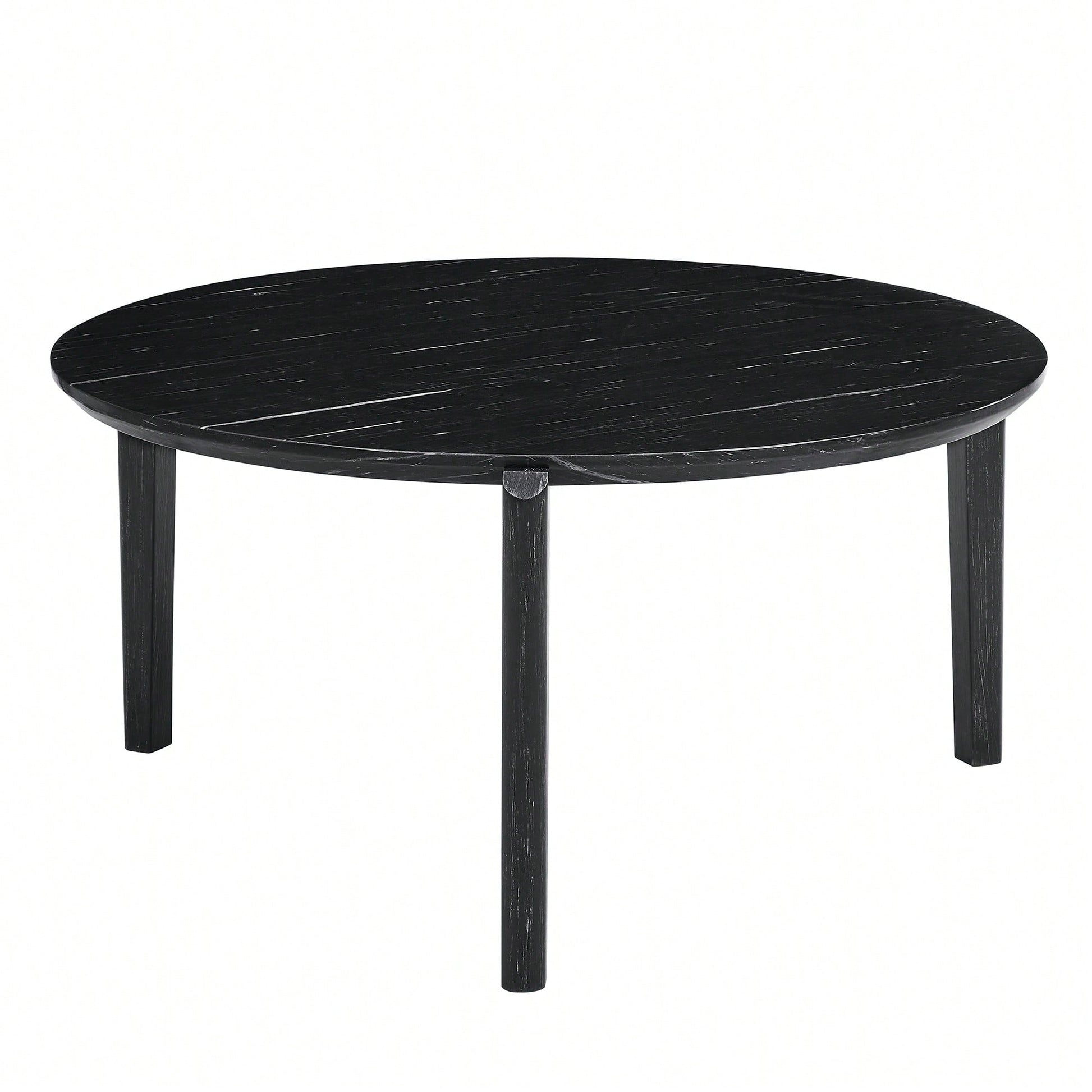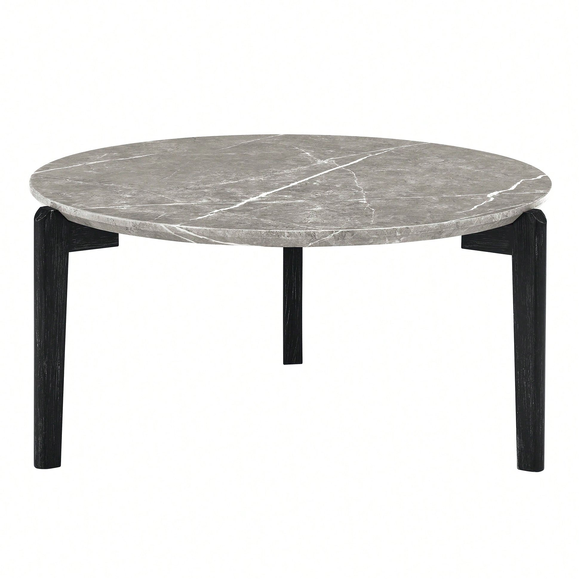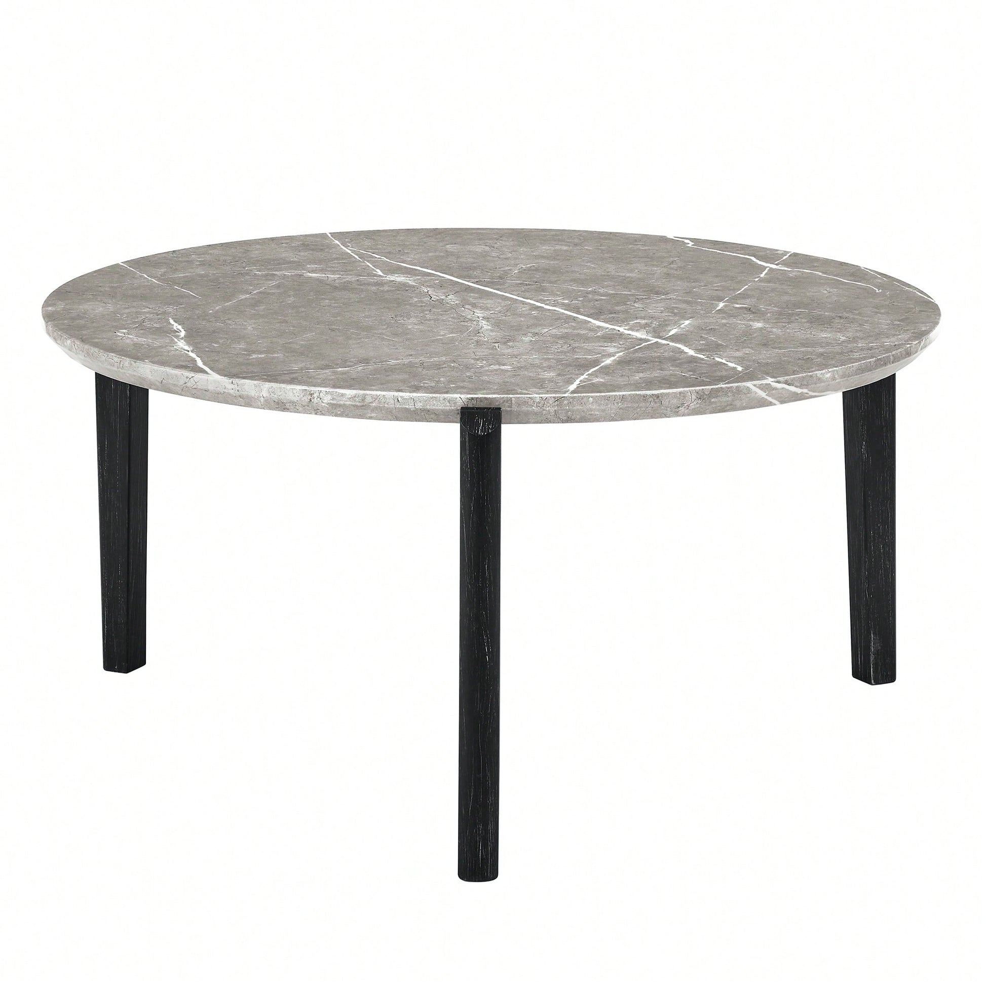 Modern 36 Inch Round Coffee Table With Imitation Marble Top And Solid Rubber Wood Legs For Living Room And Office