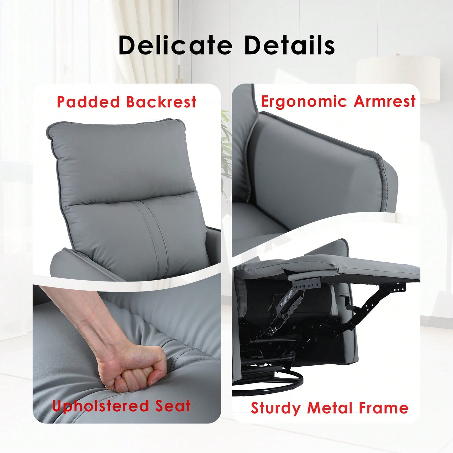 **Key Features:** - 360-degree swivel function for versatile seating and reclining - Rocking motion for relaxation during conversations or movie watching - Pull buckle for easy reclining and adjustable footrest for comfort - Soft PU surface with overstuffed cushions for family-friendly use - Convenient side pockets for storing remote controls and magazines **Product Description:** This modern rocking recliner chair combines style and functionality, making it perfect for any living space. With a 360-degree swivel feature, you can easily turn to engage with others or to enjoy your favorite shows. The chair rocks gently, providing a soothing motion while you relax. The reclining function allows you to stretch out comfortably, and the extendable footrest adds to your lounging experience. Crafted with a soft PU surface and thick high-density sponge cushions, this chair ensures comfort and durability. The sturdy metal and wood frame supports up to 330 lbs, making it suitable for various users. Assembly is straightforward with included instructions, and customer support is available for any questions or concerns. **Specifications:** - Weight Capacity: 330 lbs - Material: PU surface, high-density sponge, metal and wood frame - Features: 360° swivel, reclining, rocking, extendable footrest, side pockets