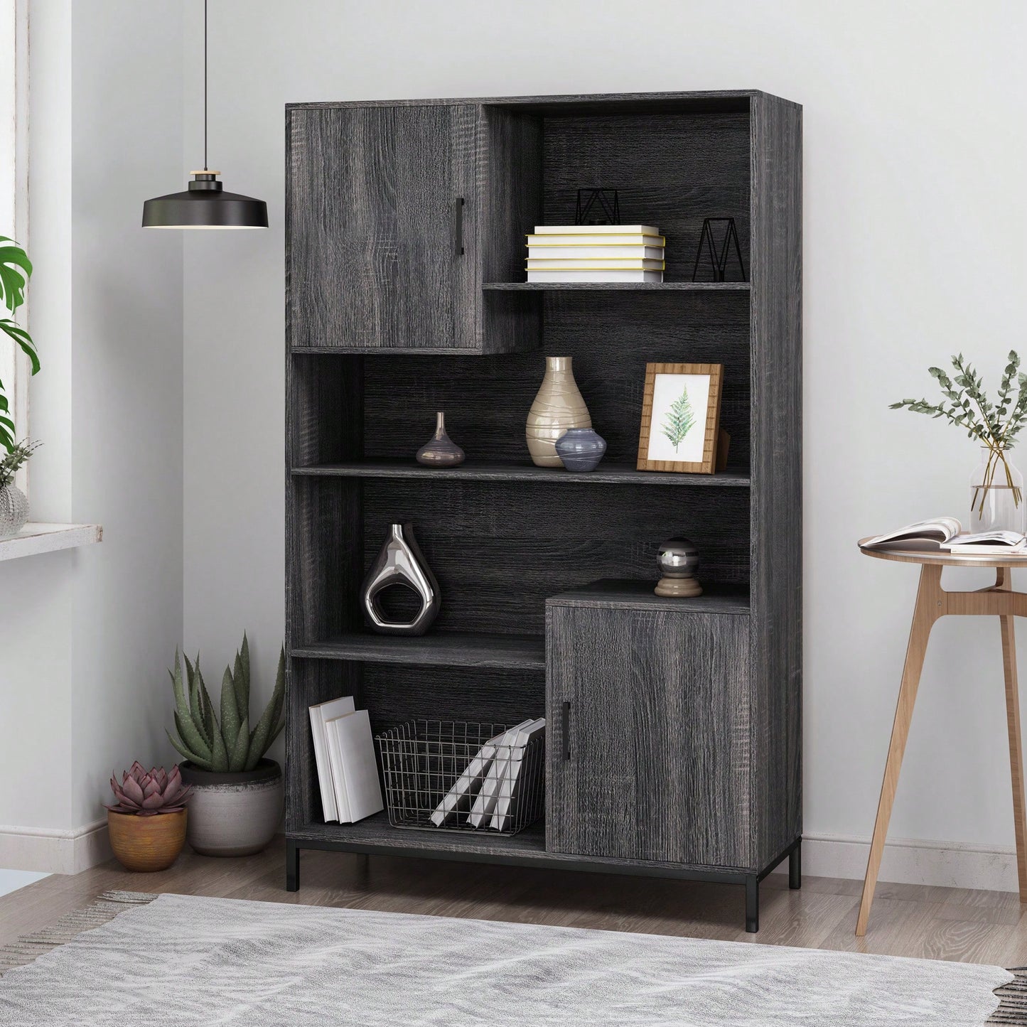 1. Features - Contemporary design with uniquely designed shelves and cabinets - Made from faux wood for a beautiful wood look and moisture resistance - Four shelves and two cabinets for organized storage and display - Sturdy iron legs for durability and support - Sleek black handles for easy access to cabinet doors 2. Product Description This bookcase features a contemporary design that enhances any room with its stylish shelves and artistically placed cabinets. Crafted from faux wood, it combines the aesthetic appeal of real wood with added durability and moisture resistance. With four shelves and two cabinets, it provides ample storage space for organizing and displaying items conveniently. The iron legs offer robust support, while the sleek black handles add a refined touch to the overall look. Some assembly is required, and all necessary tools and instructions are included. Specifications - Material: Faux wood - Number of shelves: 4 - Number of cabinets: 2 - Handle color: Black - Leg material: Iron