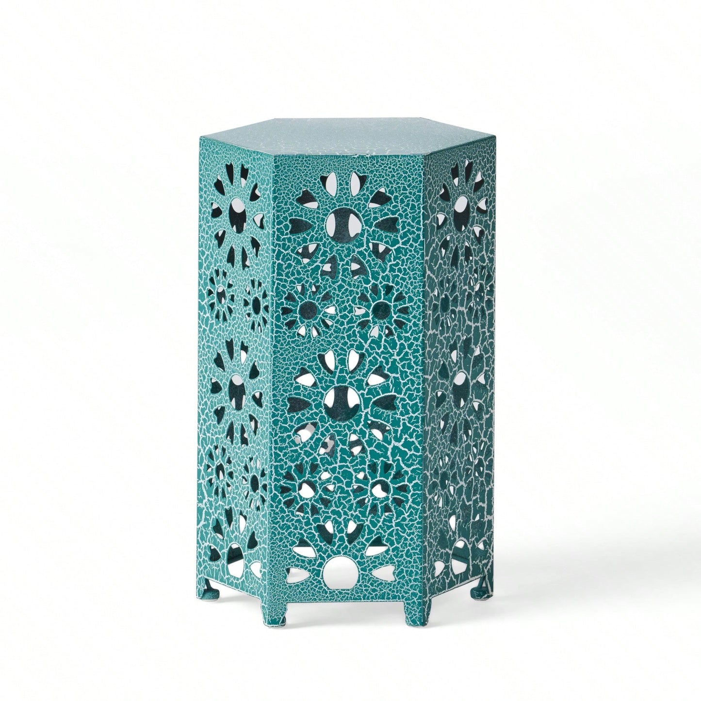 This 12" side table features a modern design with an elegant iron-cut frame adorned with a beautiful floral pattern, adding a touch of glamour to any living space. Its sleek hexagonal structure and hollow framework create an ideal surface for snacks or beverages. The table is ready to use right out of the box, eliminating the hassle of assembly and providing versatility for various occasions. Crafted from powder-coated iron, it ensures exceptional durability and is rustproof for long-term use. With its whimsical design and vibrant colors, this table enhances both indoor and outdoor spaces.