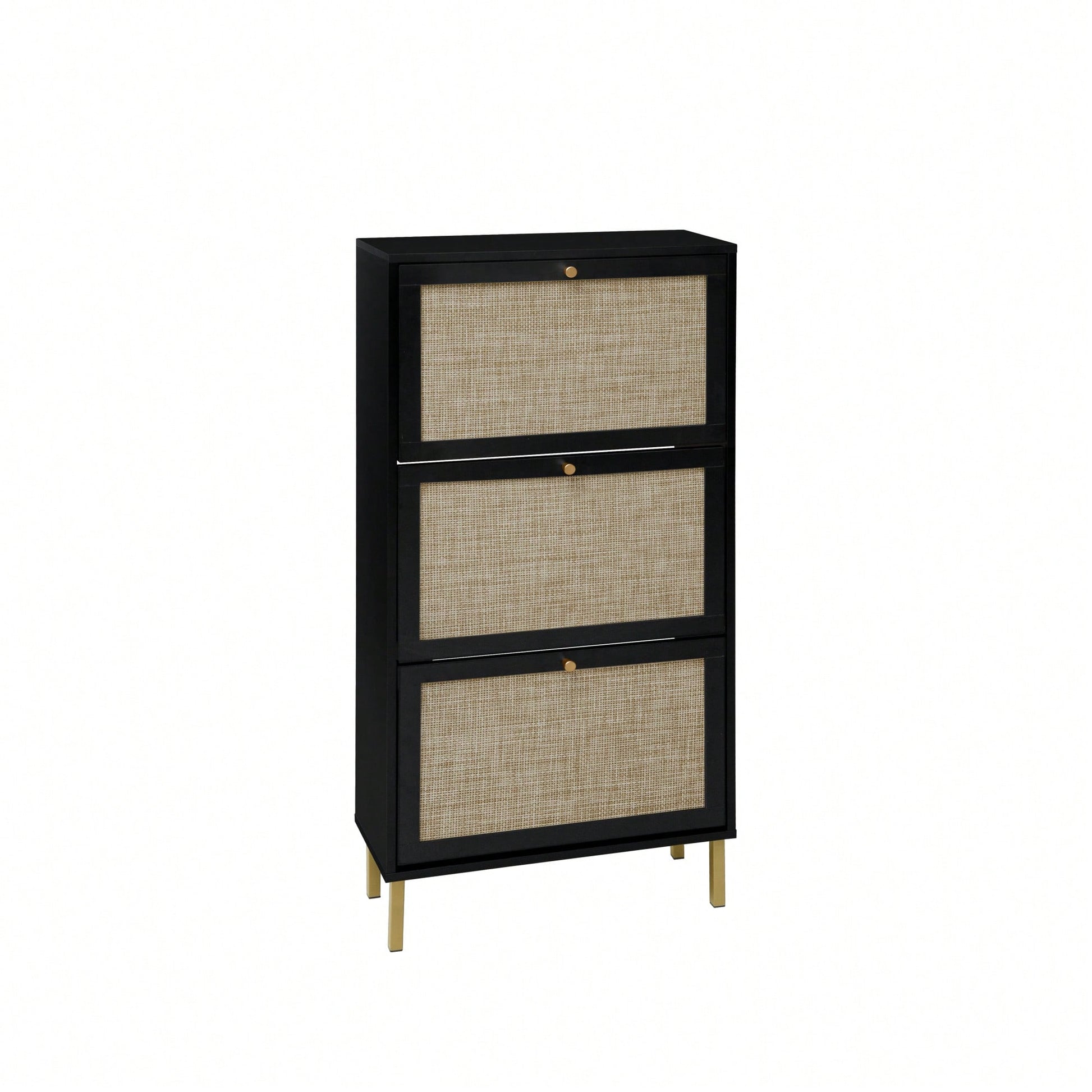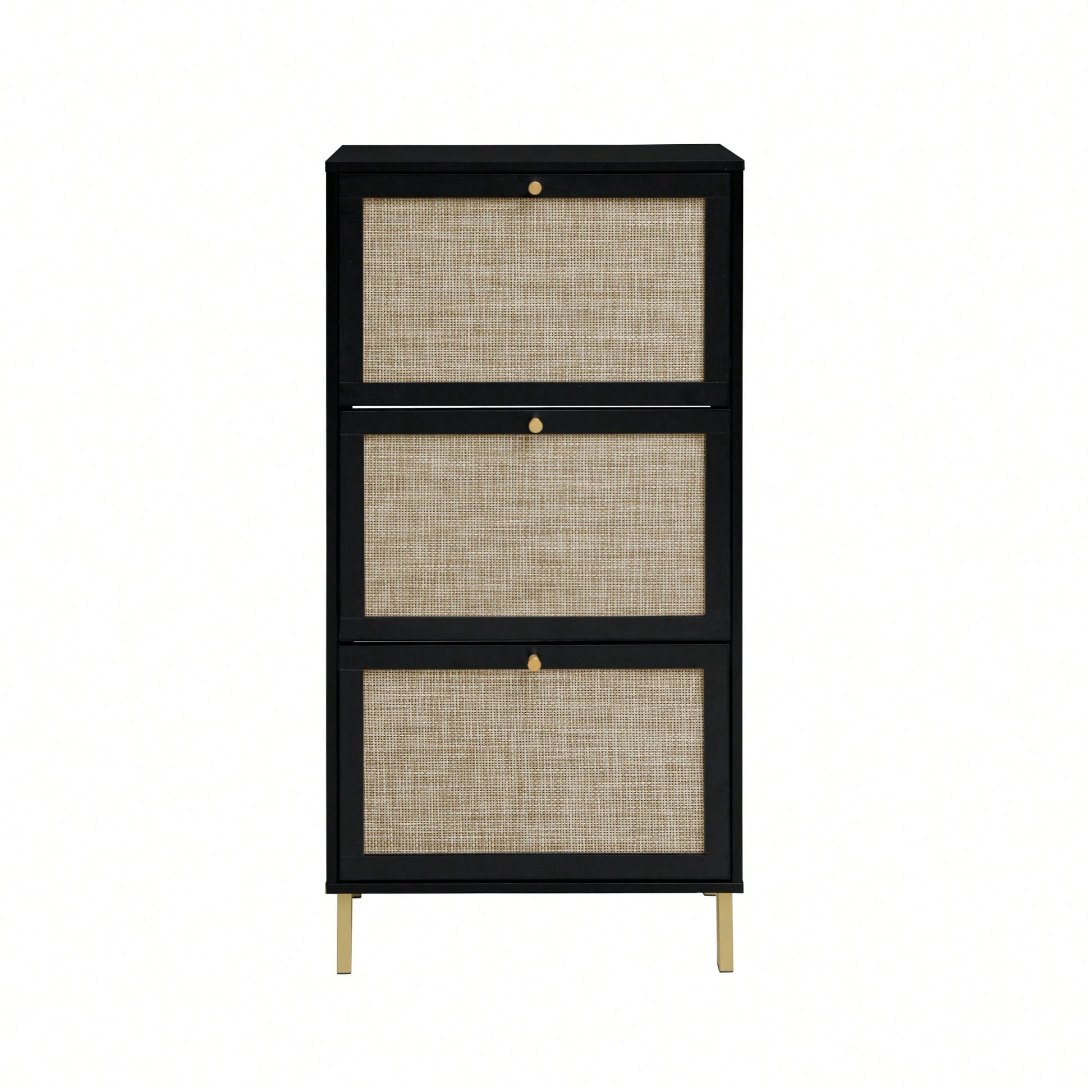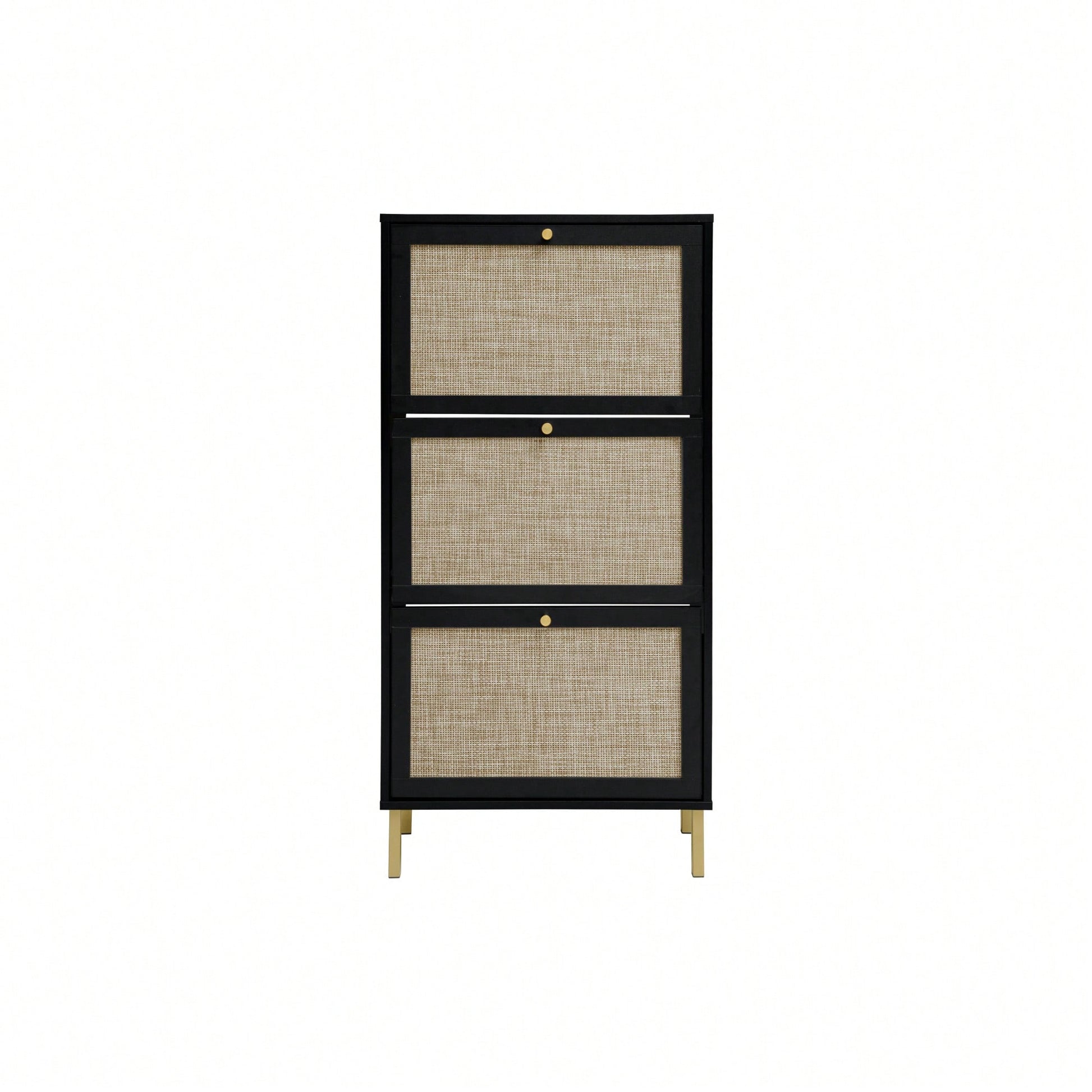 1. Key Features: - Rattan 3 Door Shoe Rack with a modern design - Estimated load capacity of 44 pounds - Engineered rattan offers moisture-proof and durable use - Features gold handles for a comfortable grip - Matte textured metal bases can be wall-mounted or placed independently 2. Product Description: This freestanding shoe storage cabinet is perfect for your entryway, living room, study, or porch. It features a contemporary design with three doors and multiple compartments for organized shoe storage. The engineered rattan material combines natural rattan with spandex, ensuring durability and resistance to moisture and sun damage. The gold handles provide a stylish touch and ease of access, while the independent metal bases offer flexibility in placement. Easy to assemble, this shoe rack is both functional and aesthetically . Specifications: - Load capacity: 44 pounds - Material: Engineered rattan and metal - Assembly: Easy, one-person assembly - Foot pads included to prevent floor scratching