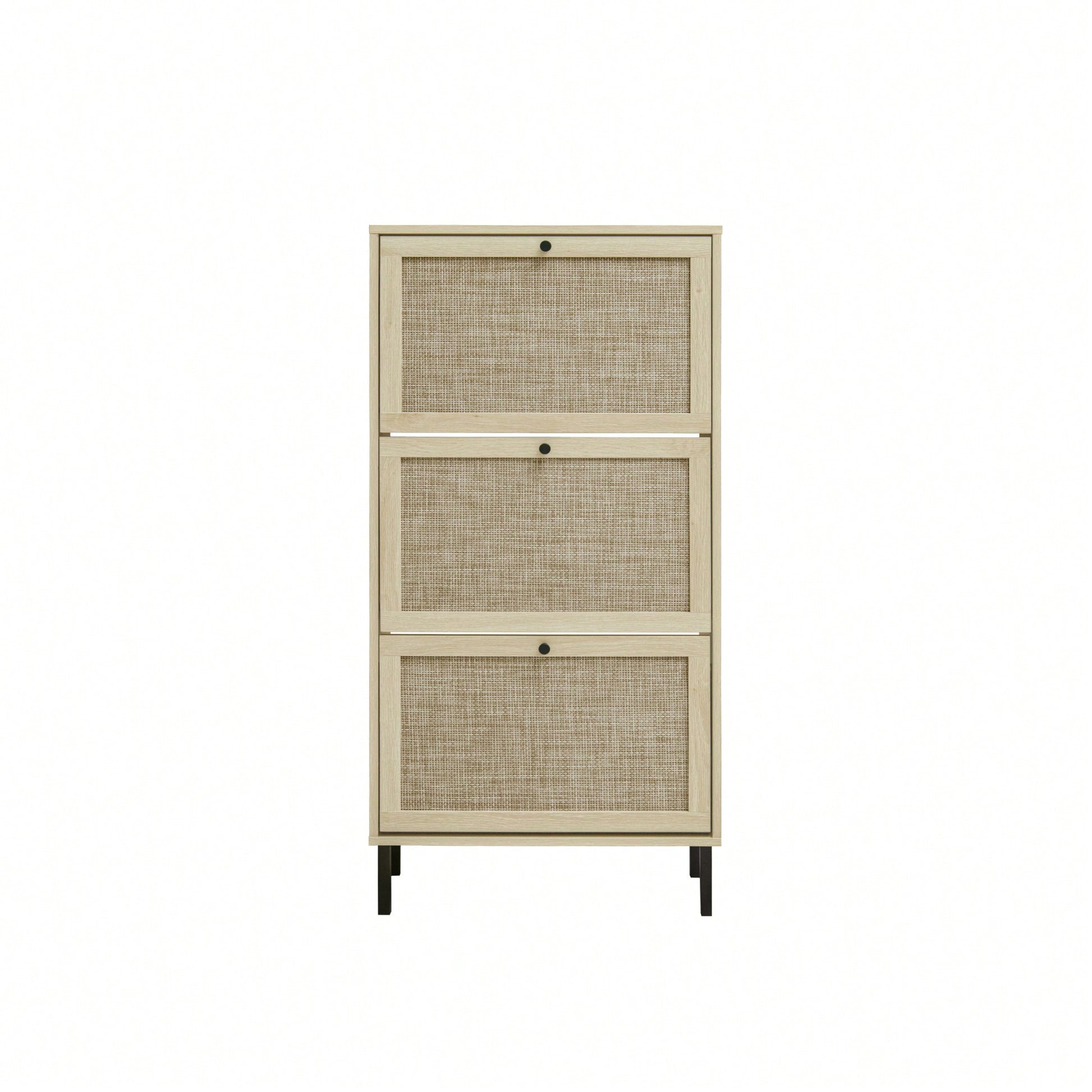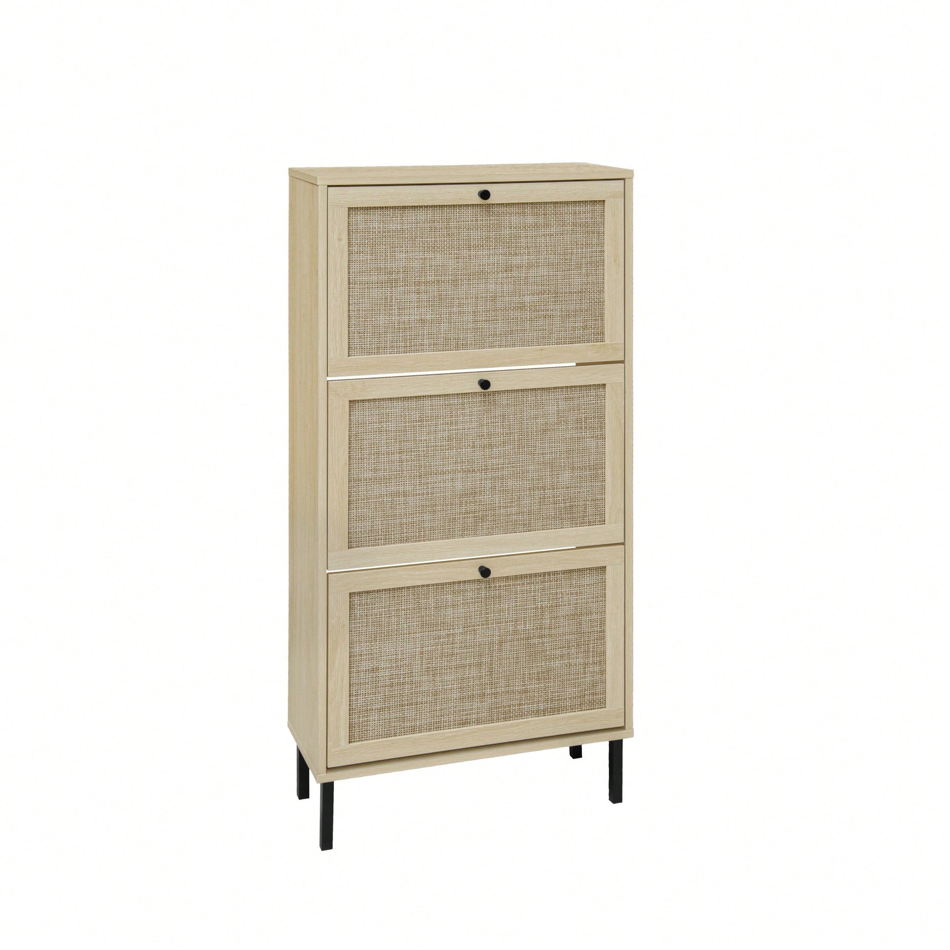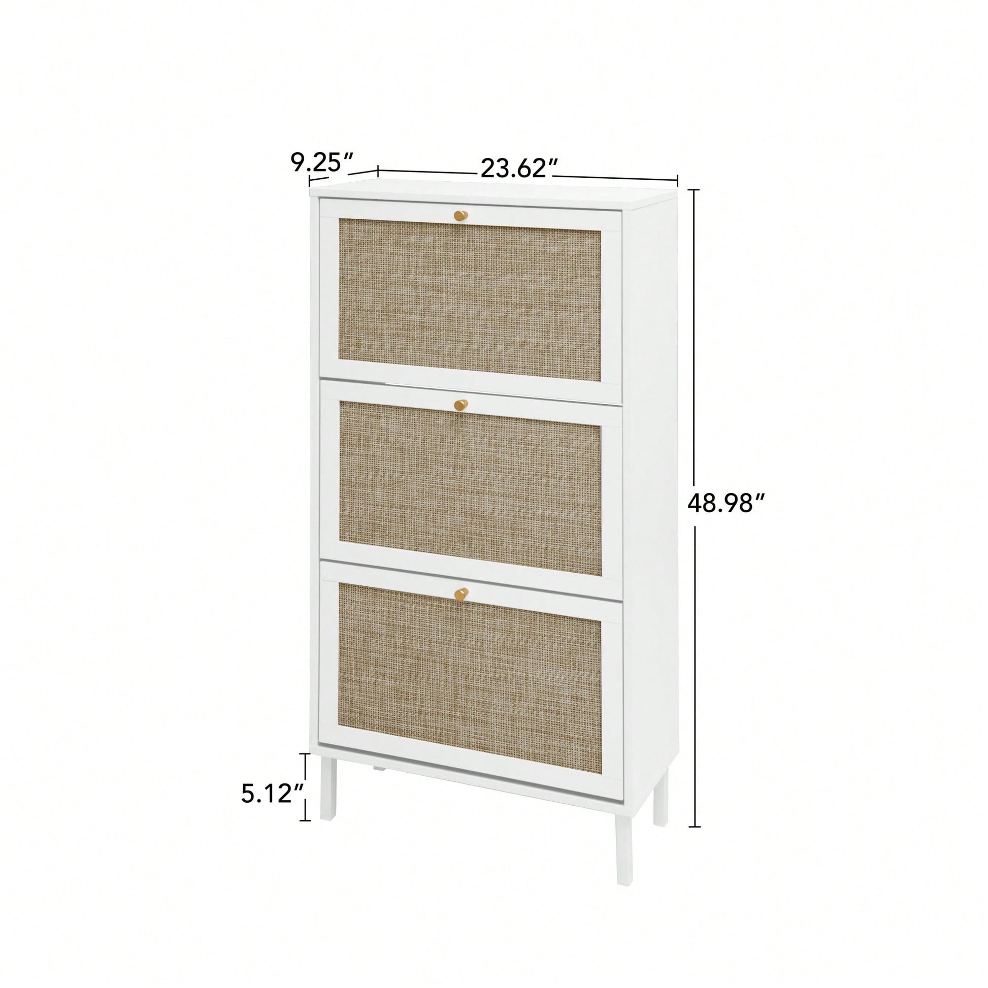1. Key Features: - Rattan 3 Door Shoe Rack with a modern design - Estimated load capacity of 44 pounds - Engineered rattan offers moisture-proof and durable use - Features gold handles for a comfortable grip - Matte textured metal bases can be wall-mounted or placed independently 2. Product Description: This freestanding shoe storage cabinet is perfect for your entryway, living room, study, or porch. It features a contemporary design with three doors and multiple compartments for organized shoe storage. The engineered rattan material combines natural rattan with spandex, ensuring durability and resistance to moisture and sun damage. The gold handles provide a stylish touch and ease of access, while the independent metal bases offer flexibility in placement. Easy to assemble, this shoe rack is both functional and aesthetically . Specifications: - Load capacity: 44 pounds - Material: Engineered rattan and metal - Assembly: Easy, one-person assembly - Foot pads included to prevent floor scratching