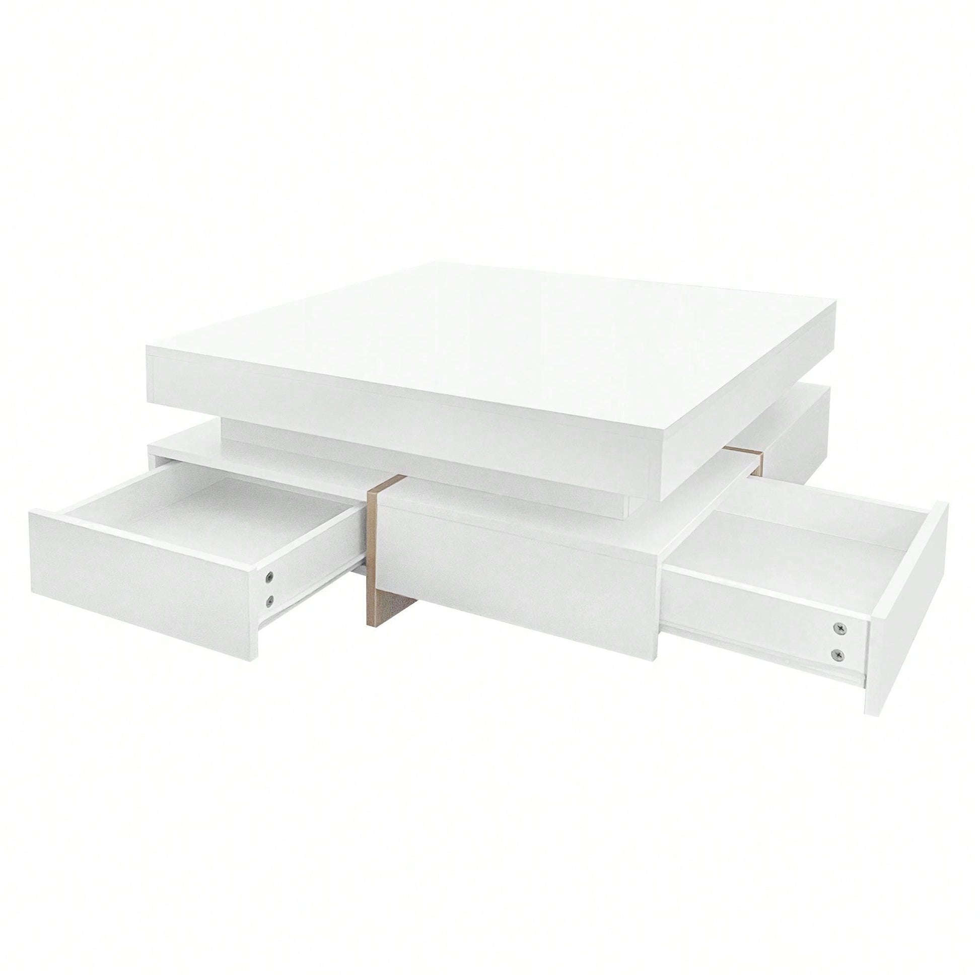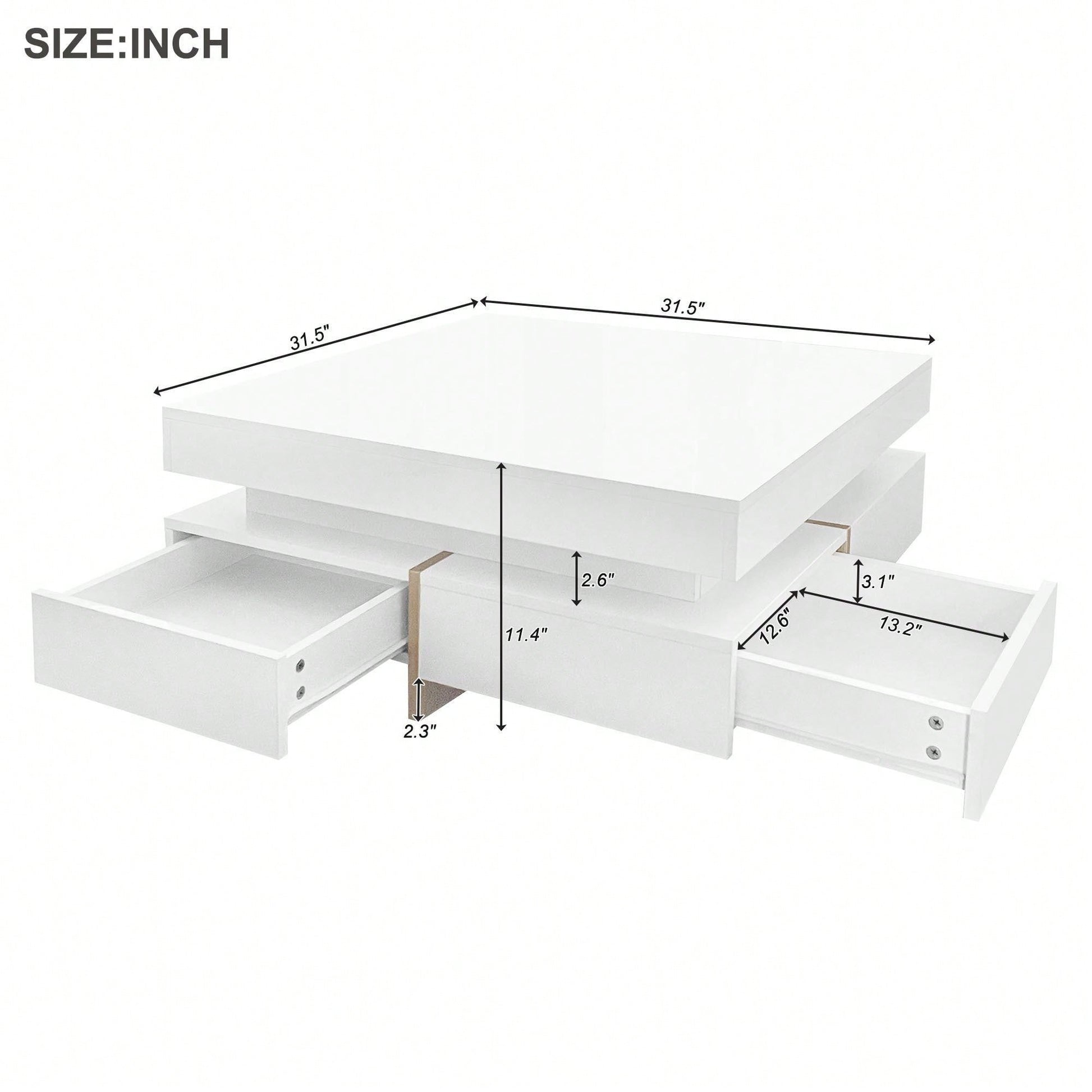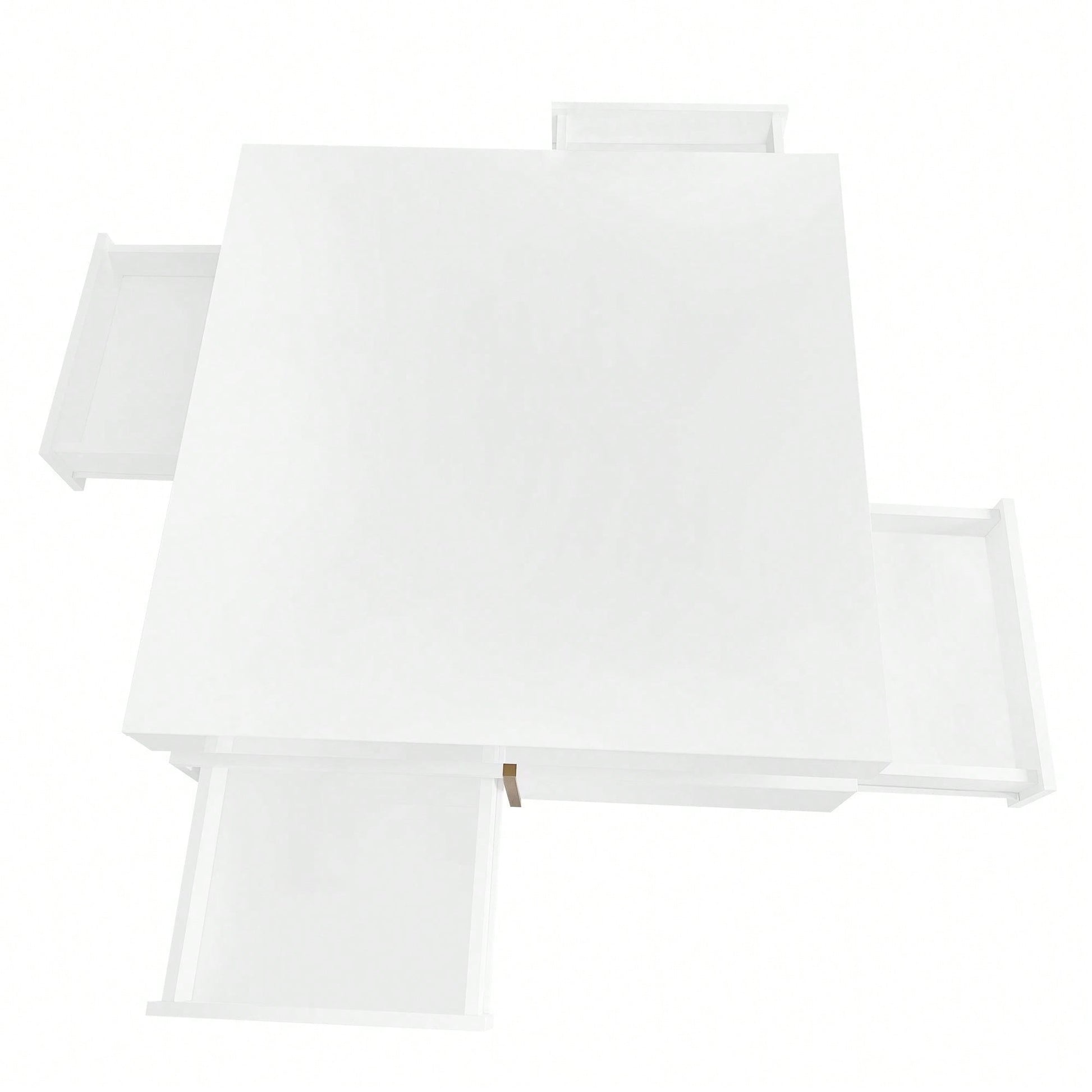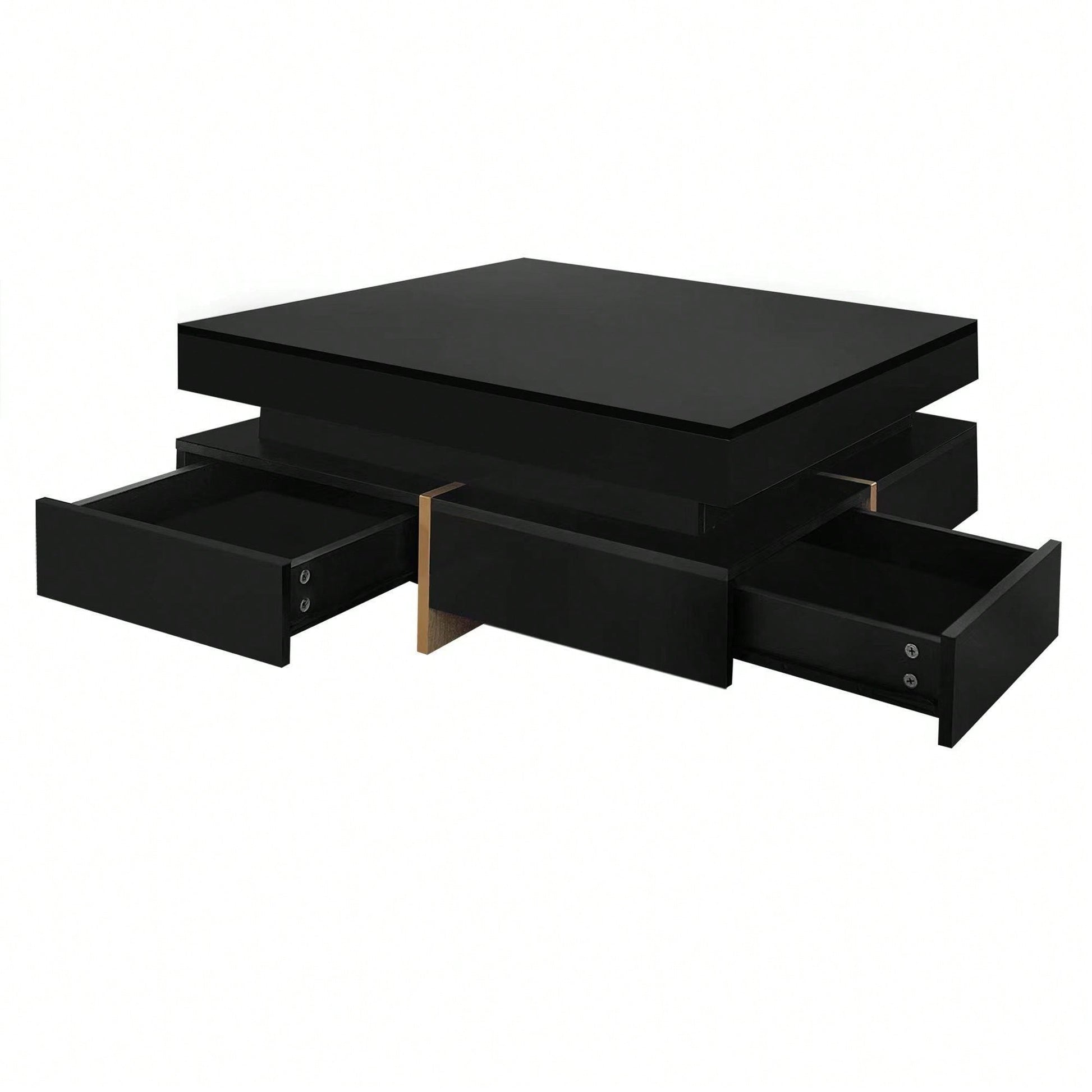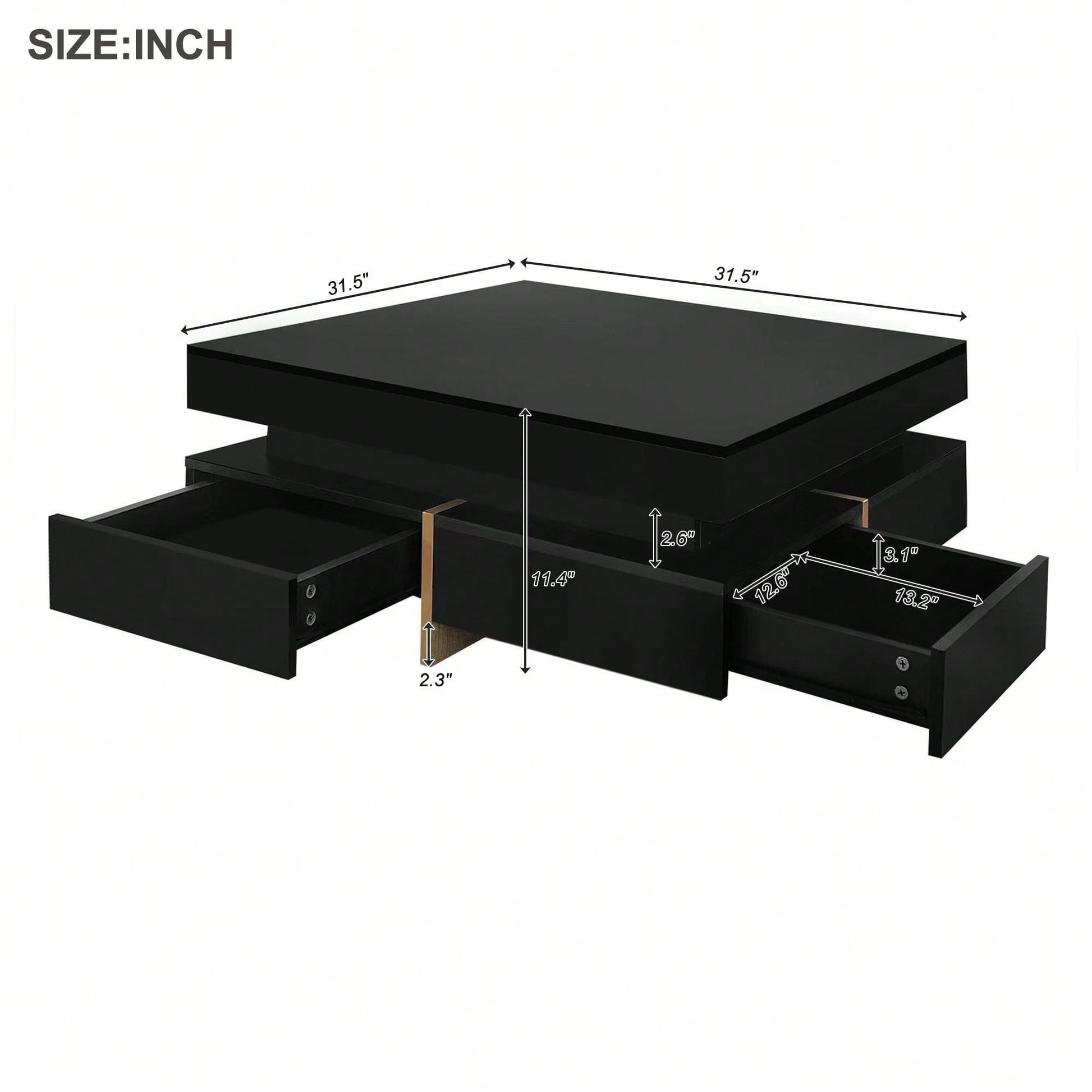 Modern High Gloss Coffee Table With 4 Drawers, Multi-Storage Square Cocktail Tea Table With Wood Grain Legs, Center Table For Living Room