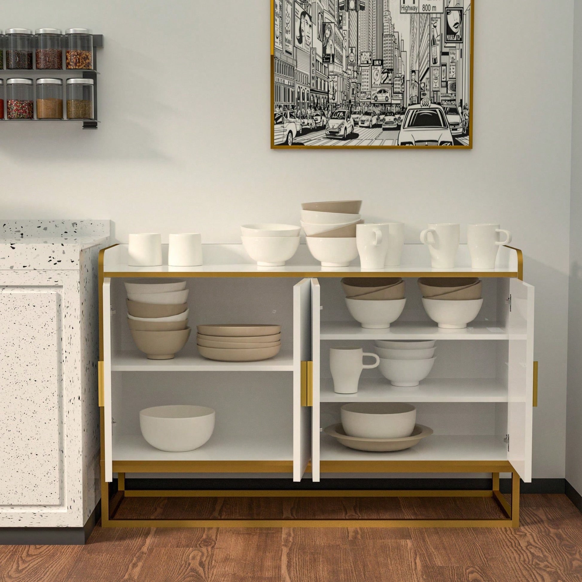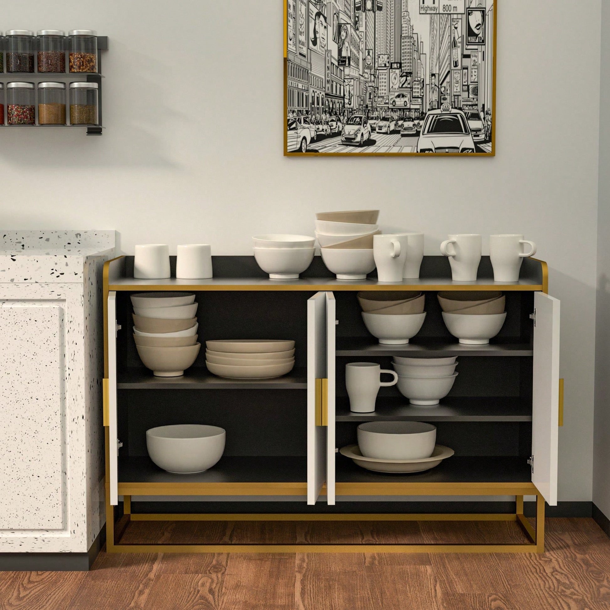 3. Multifunctional Design: This modern buffet cabinet with doors can not only be used as a buffet side cabinet in the kitchen, but also as a TV cabinet in the living room, a console at the entrance or a decorative table in the hallway. In addition, it can also be used as a coffee bar cabinet in the restaurant, allowing you to enjoy a cup of fragrant coffee in the afternoon.