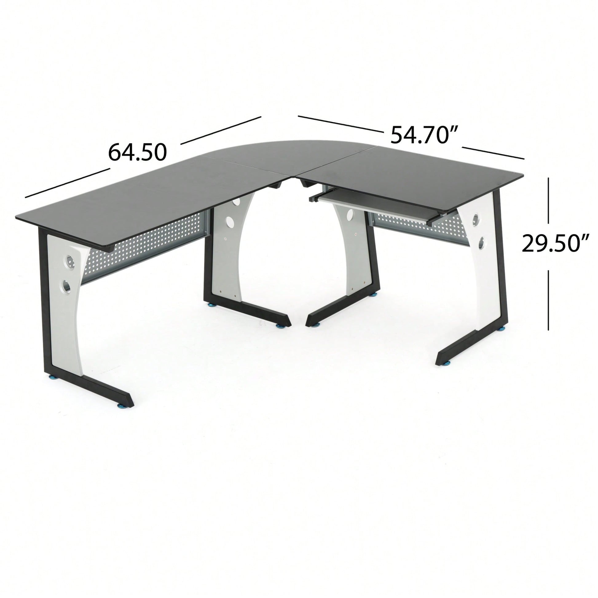 This L-shaped glass office desk is perfect for the modern multitasking worker. Its spacious tempered glass top provides ample space for all your work essentials, while the robust iron legs ensure lasting stability. The sleek design complements any office decor, making it a stylish and functional addition to your workspace.