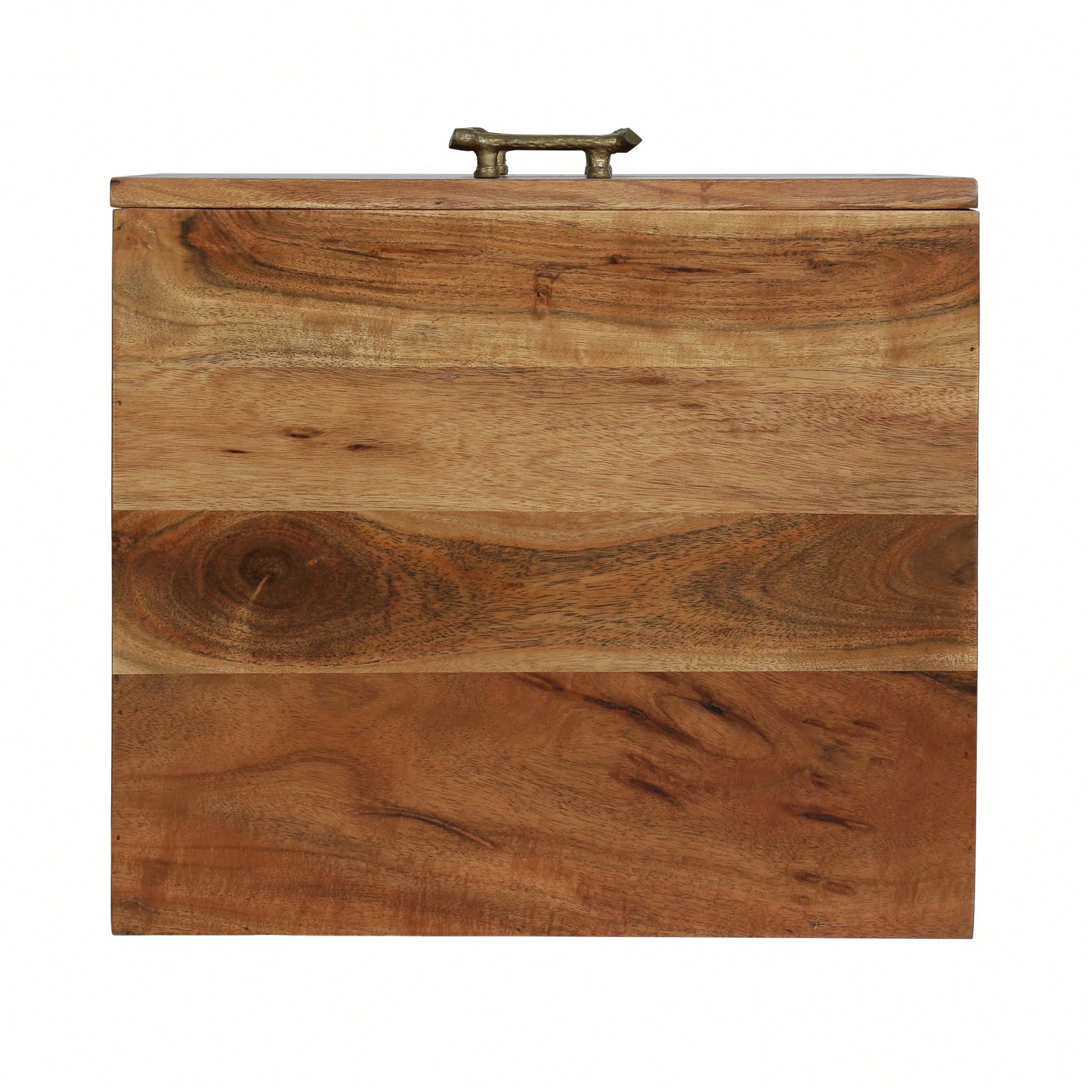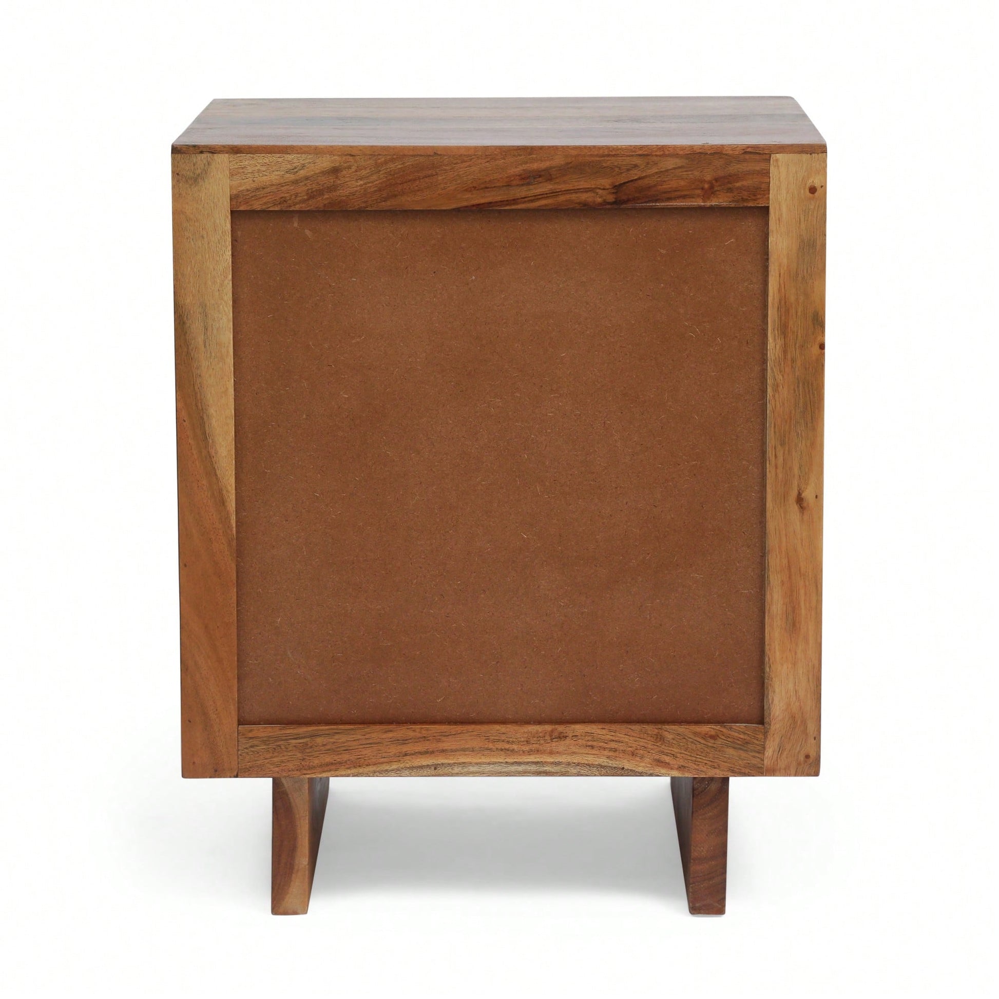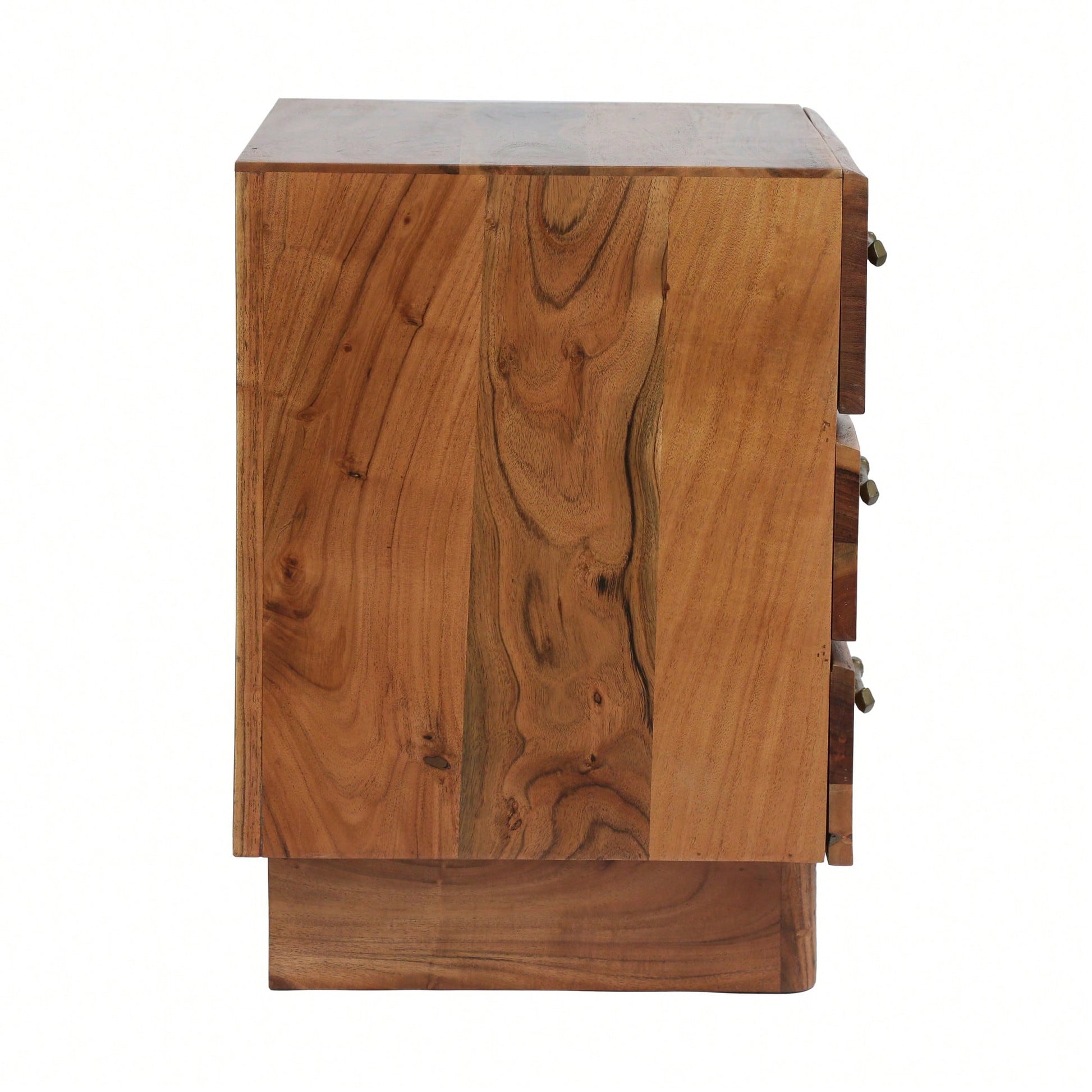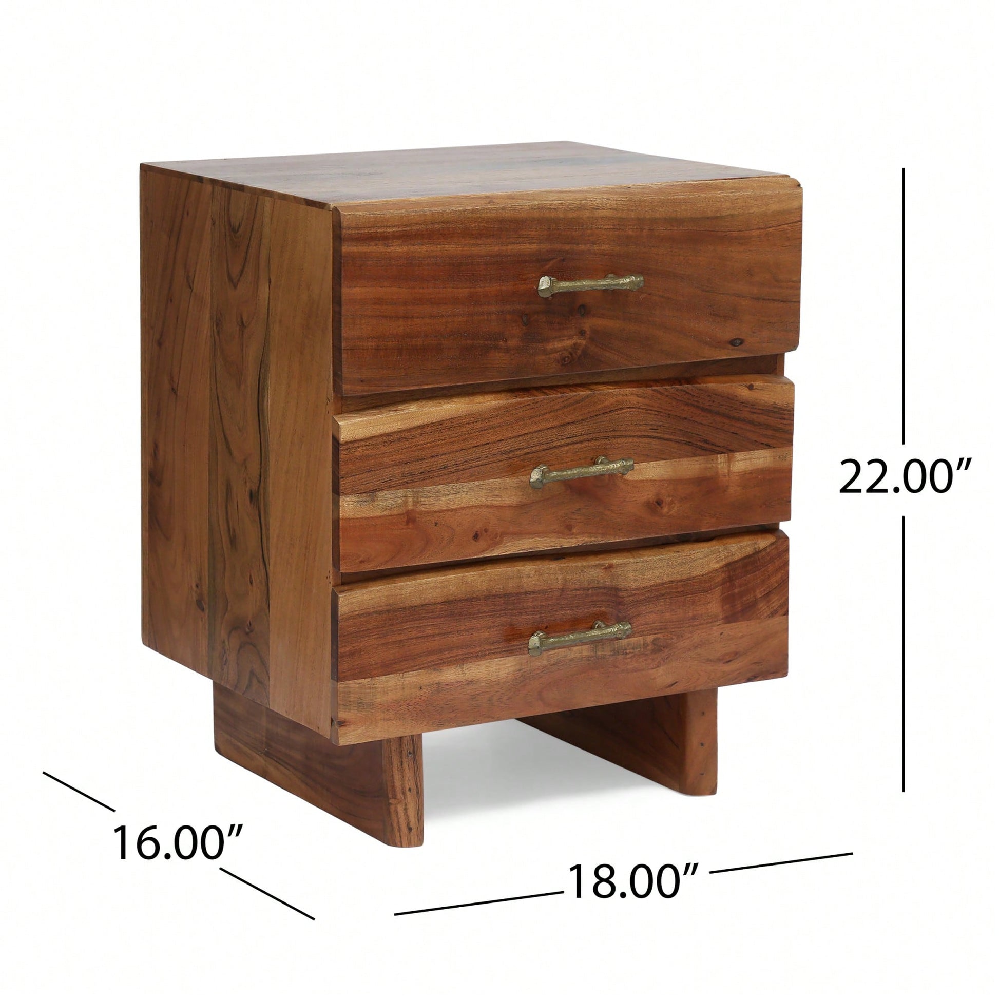 This nightstand features a robust acacia wood frame, complemented by antique brass handles, providing both style and durability. With its handcrafted design, each piece is unique, showcasing natural variations that enhance its charm. The nightstand includes three spacious drawers, perfect for organizing your belongings while adding an earthy boho touch to your decor. Its solid construction ensures it withstands wear and tear, making it a lasting addition to your home.