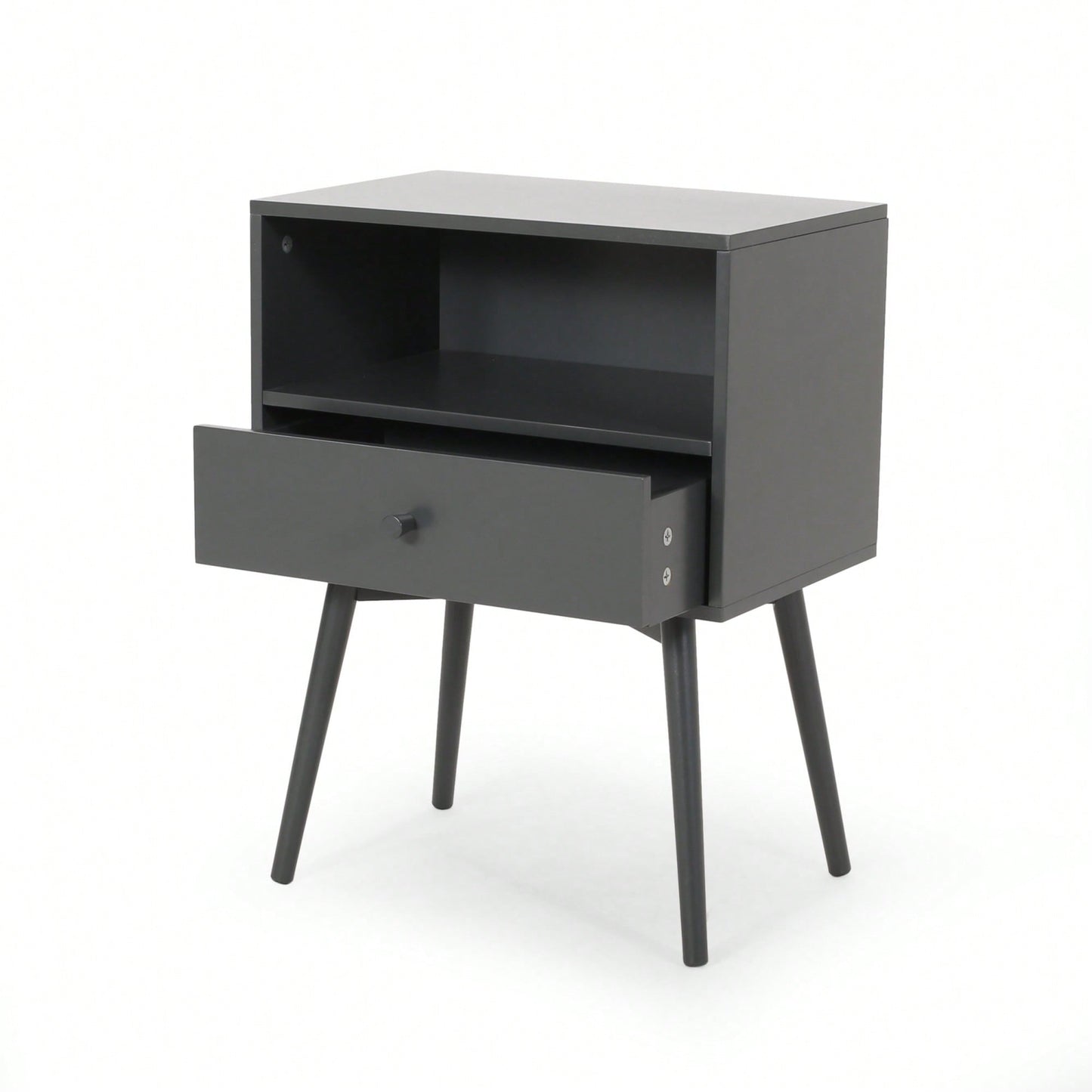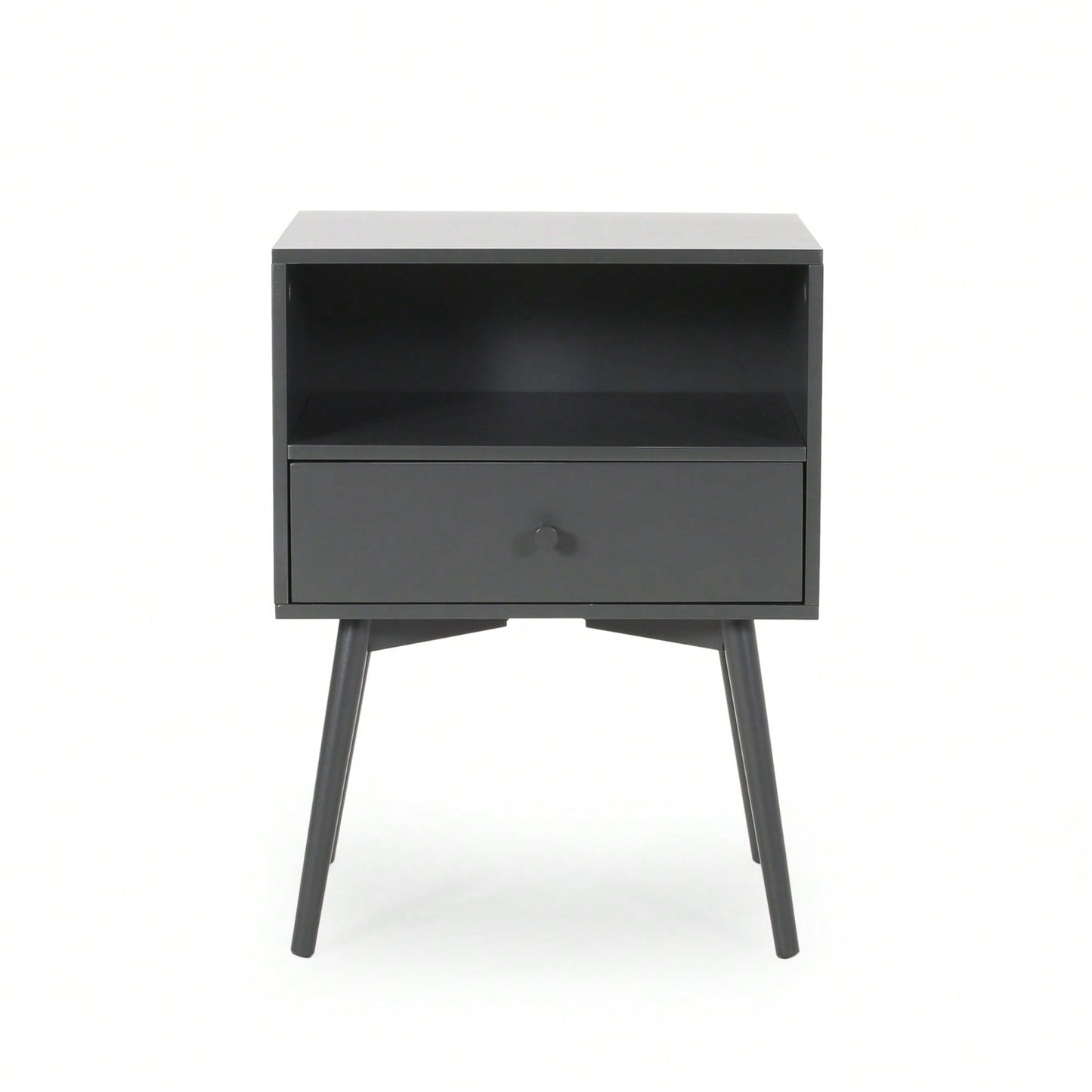 This side table brings a refreshing simplicity to your interior space with its stunning mid-century modern design and outstanding function. Created with a lovely rubberwood structure, this end table offers incredible stability and design that accents your home with a perfect touch of sophistication. Blending iconic splayed legs with a stunning wood frame, this piece reimagines traditional design while providing ample storage space. The friendly rubberwood not only ensures durability but also showcases a beautiful natural grain. With one spacious drawer and an open shelf, you can neatly organize your possessions.