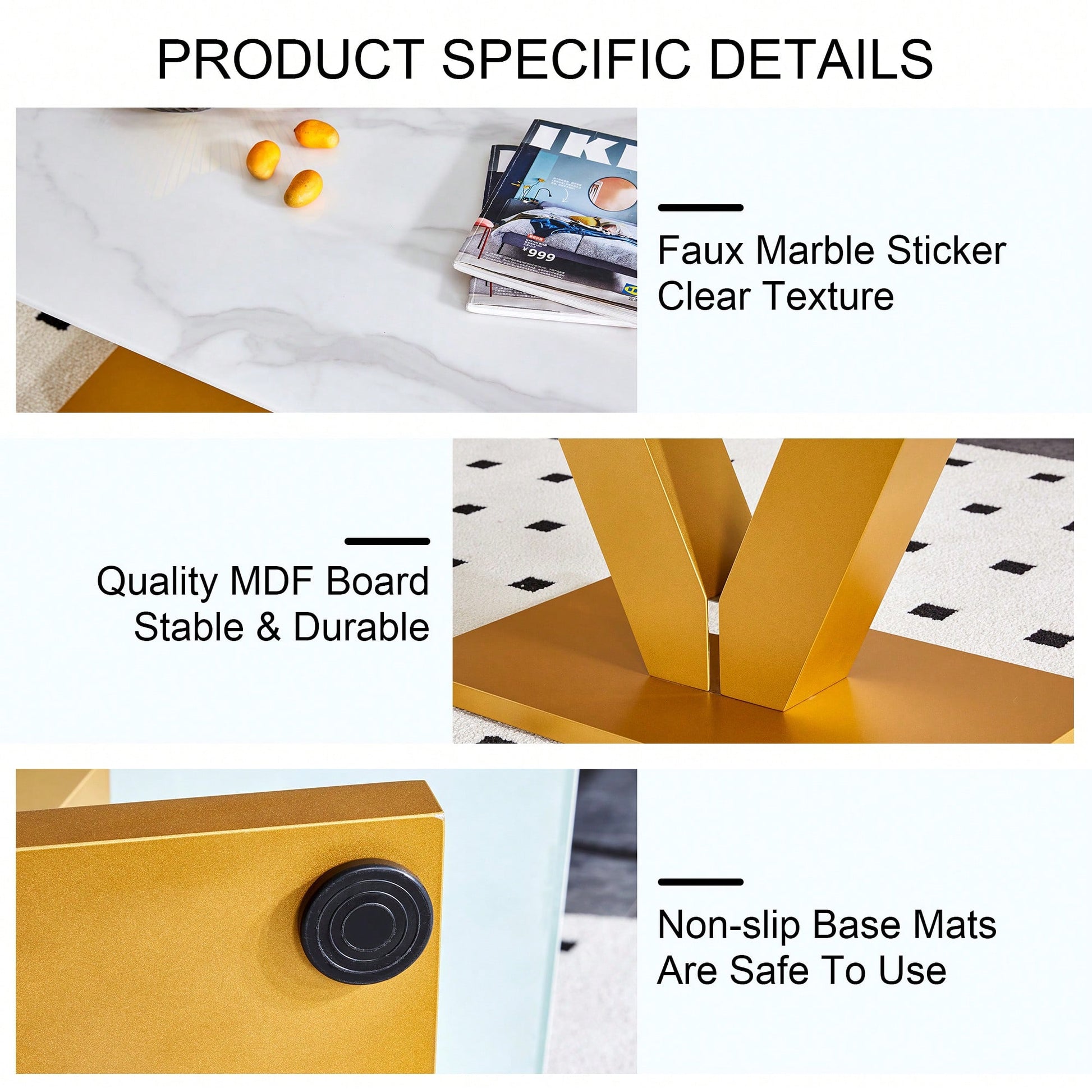 1. Features: - Modern minimalist design with tempered glass tabletop - Golden MDF pillars for a luxurious touch - Premium MDF material for stability and durability - Unique V-shaped gold-painted legs enhance stability - Easy assembly with included instructions and tools 2. Product Description: This modern minimalist coffee table features a sleek tempered glass tabletop adorned with stylish stickers, supported by elegant golden MDF pillars. Its premium MDF construction ensures stability and durability, while the unique V-shaped gold-painted legs add a luxurious flair and enhance the overall stability of the table. The combination of the gold paint's luster and the natural grain of the MDF creates a fashionable and elegant appearance, making it suitable for both living and dining rooms. Assembly is straightforward, taking most people just 10-15 minutes to complete. Specifications: - Material: Tempered glass, MDF - Leg design: V-shaped - Assembly: Tools and instructions included - Assembly time: 10-15 minutes