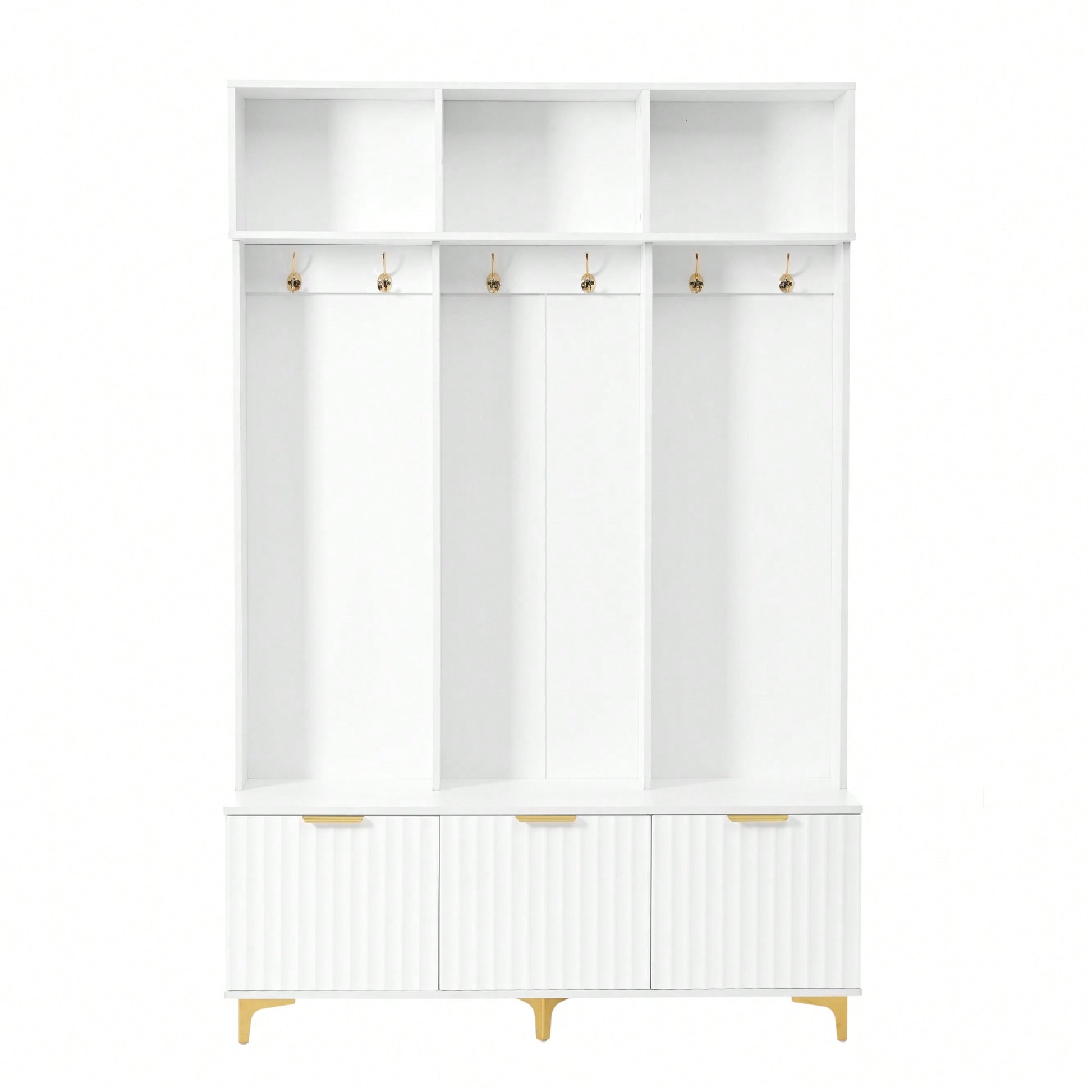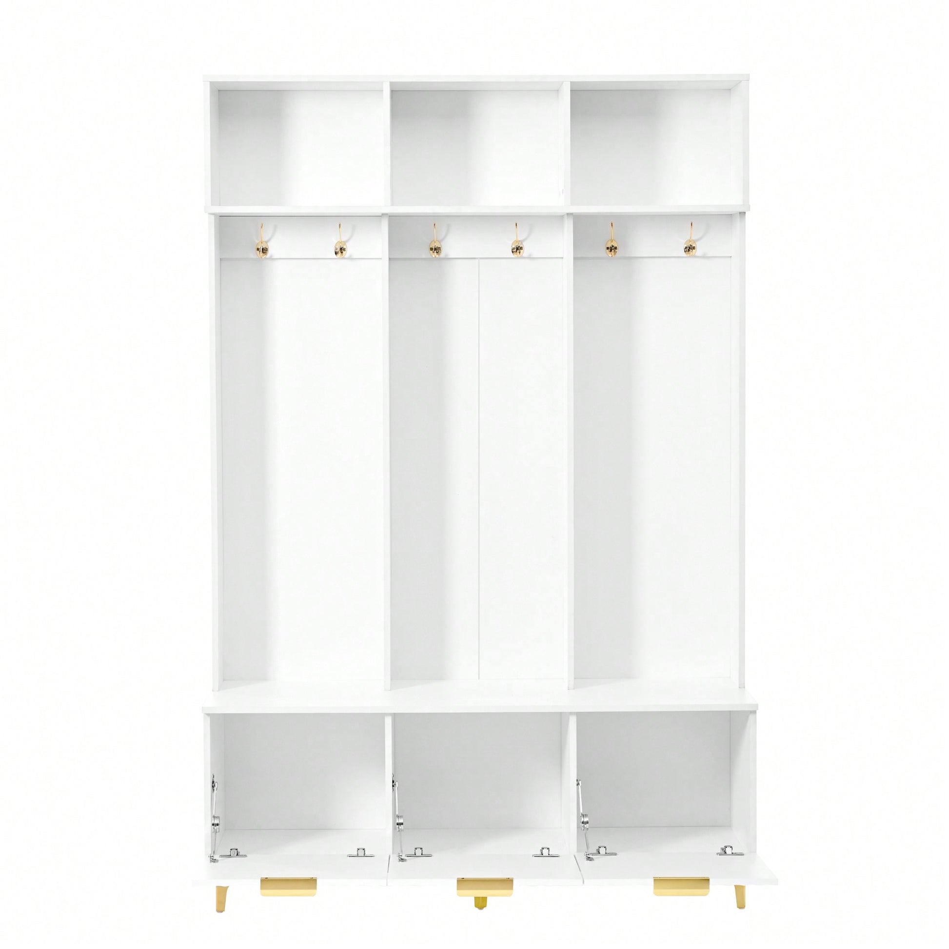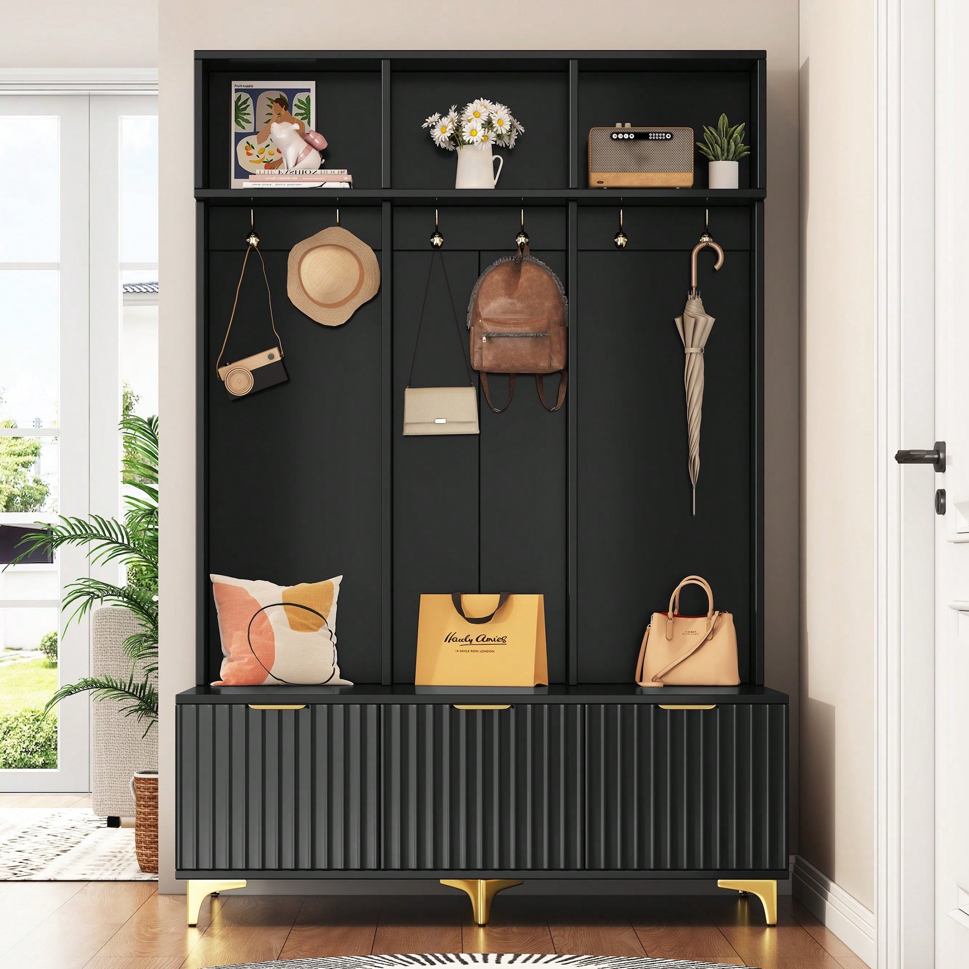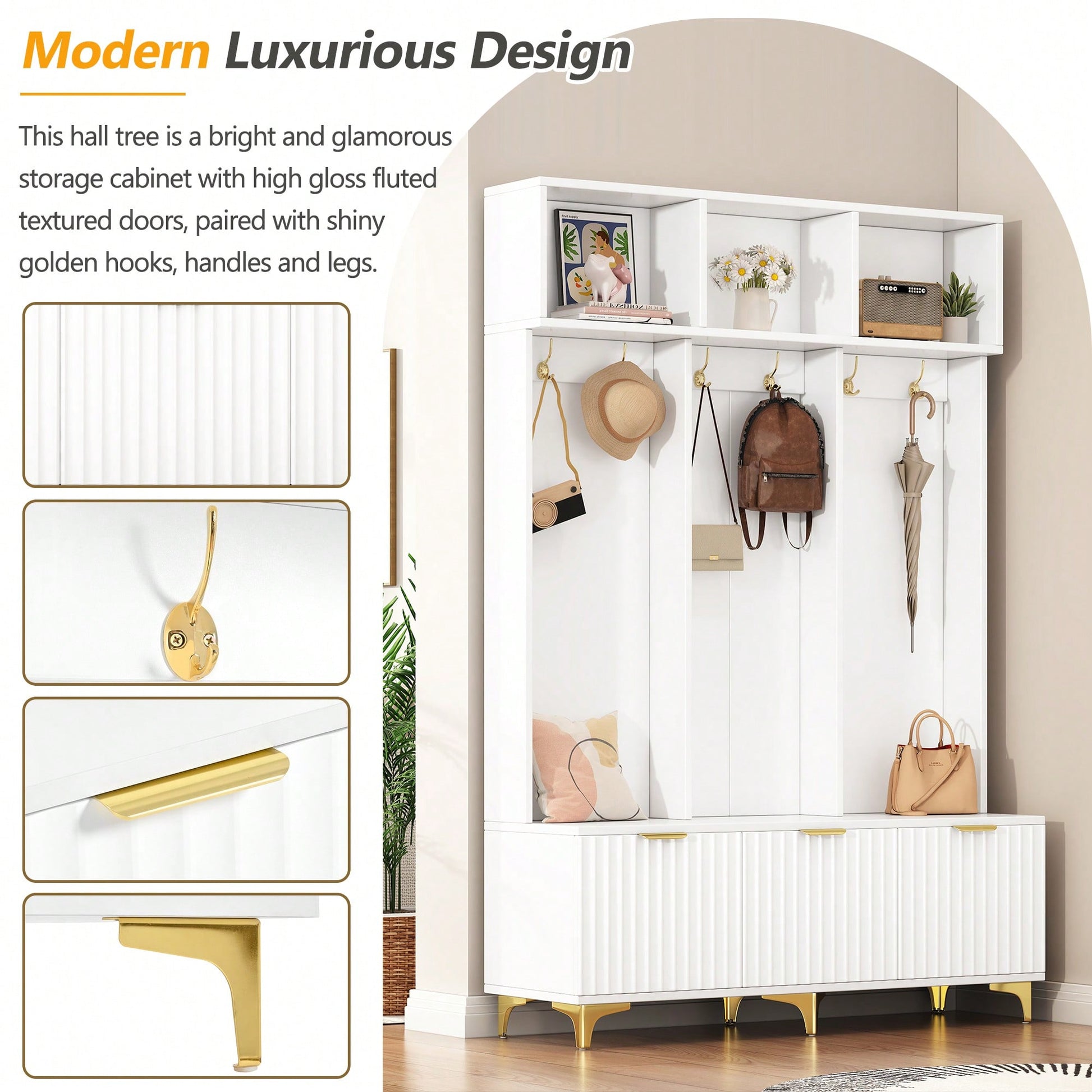 1. Features - Modern and elegant design with high gloss fluted textured doors - Includes 6 gold hooks for hanging coats and accessories - Multi-functional storage with compartments for shoes and other items - Comfortable bench for sitting while putting on or removing shoes - Sturdy construction with durable particle board and metal legs 2. Product Description This modern large storage hall tree is a bright and glamorous addition to any entryway or living space. Featuring high gloss fluted textured doors and shiny golden accents, it enhances your home's decorative style. The versatile design combines coat racks, shoe storage compartments, and multiple cubbies for comprehensive organization. The included bench not only provides extra storage for bags and daily items but also offers a comfortable seating area for convenience when entering or leaving your home. Constructed from sturdy particle board with strong metal legs, this hall tree is built to last, and its reliable pull-down door hinges ensure it withstands frequent use. Specifications - Material: Particle board and metal - Number of hooks: 6 - Type of doors: Pull-down door hinges - Bench included: Yes