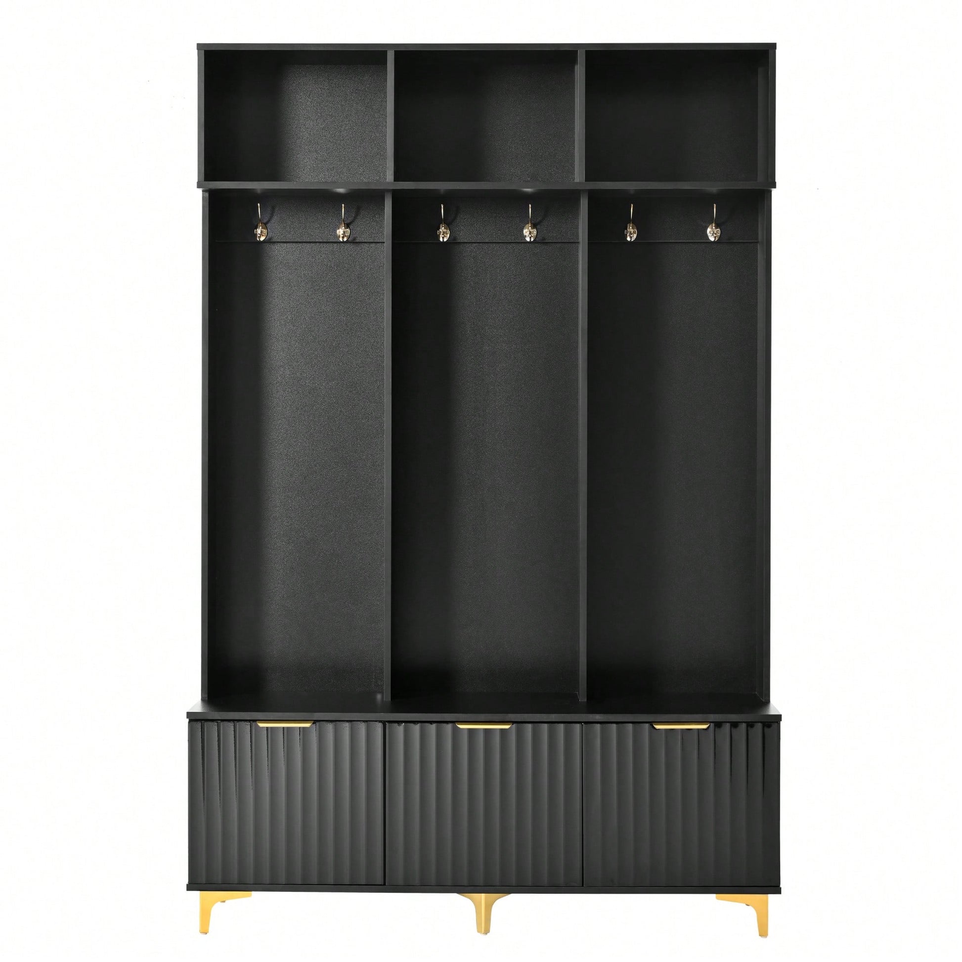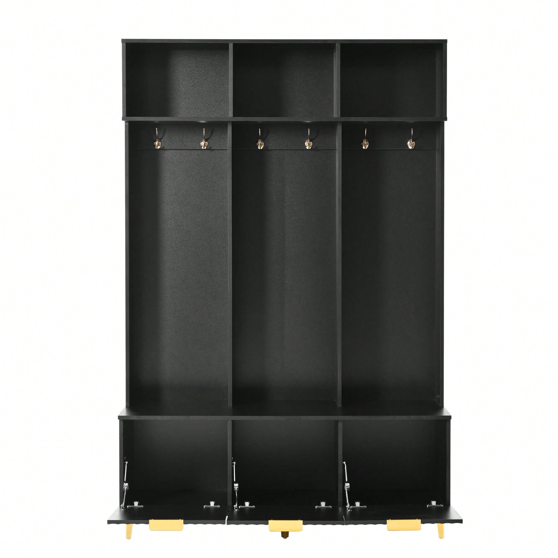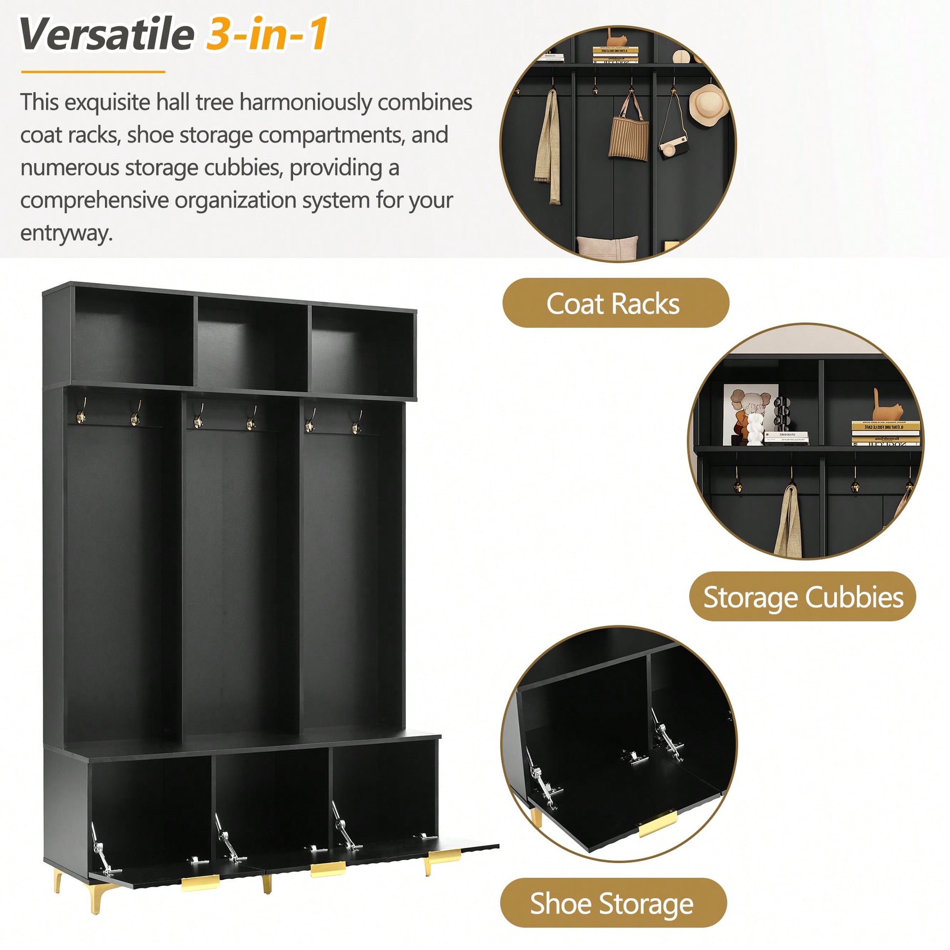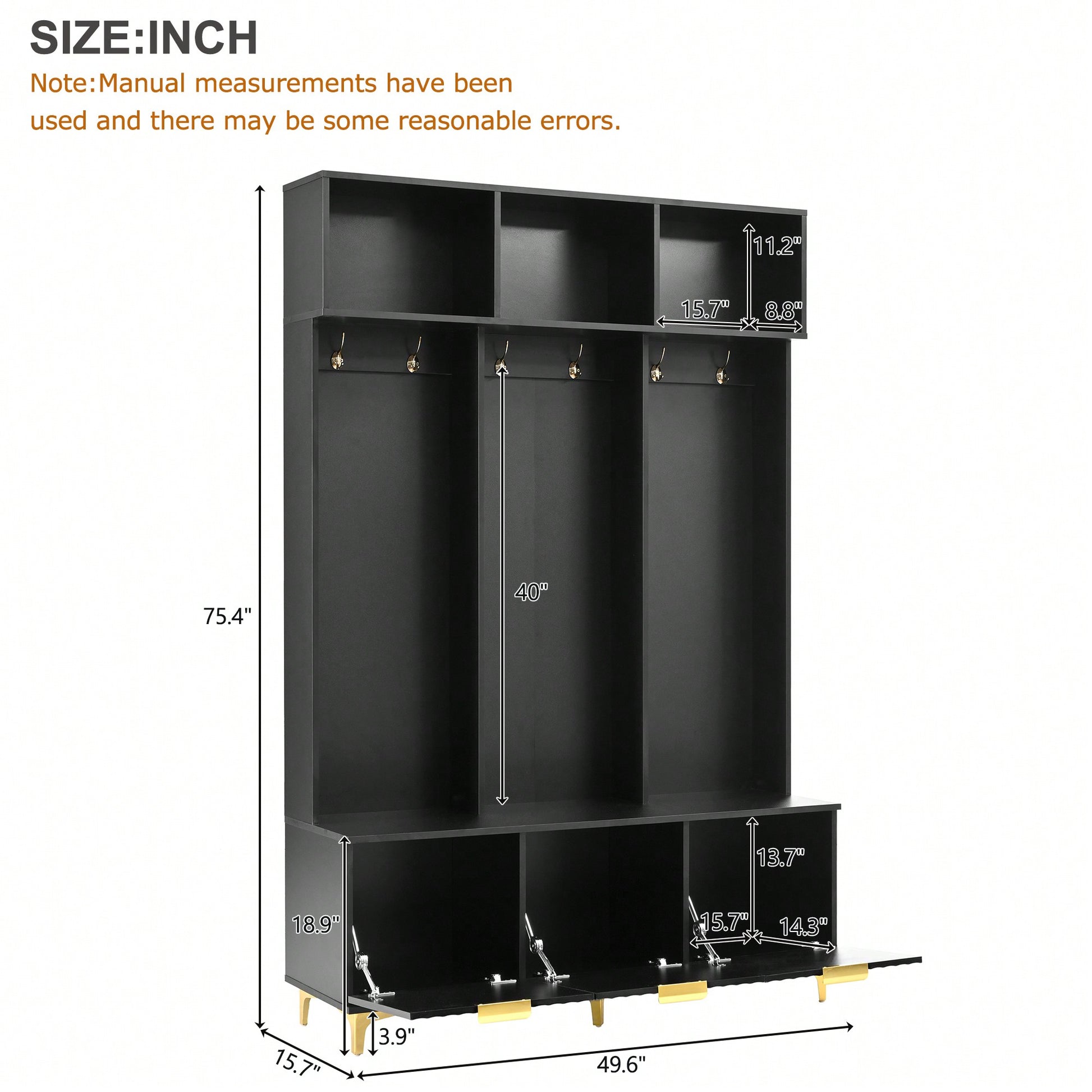 1. Features - Modern and elegant design with high gloss fluted textured doors - Includes 6 gold hooks for hanging coats and accessories - Multi-functional storage with compartments for shoes and other items - Comfortable bench for sitting while putting on or removing shoes - Sturdy construction with durable particle board and metal legs 2. Product Description This modern large storage hall tree is a bright and glamorous addition to any entryway or living space. Featuring high gloss fluted textured doors and shiny golden accents, it enhances your home's decorative style. The versatile design combines coat racks, shoe storage compartments, and multiple cubbies for comprehensive organization. The included bench not only provides extra storage for bags and daily items but also offers a comfortable seating area for convenience when entering or leaving your home. Constructed from sturdy particle board with strong metal legs, this hall tree is built to last, and its reliable pull-down door hinges ensure it withstands frequent use. Specifications - Material: Particle board and metal - Number of hooks: 6 - Type of doors: Pull-down door hinges - Bench included: Yes