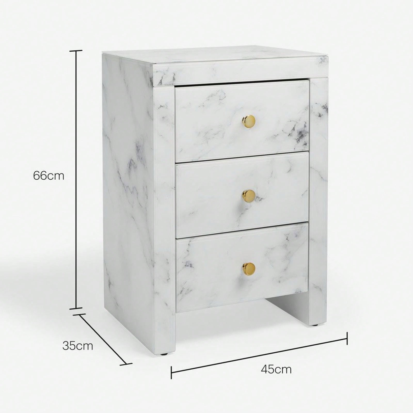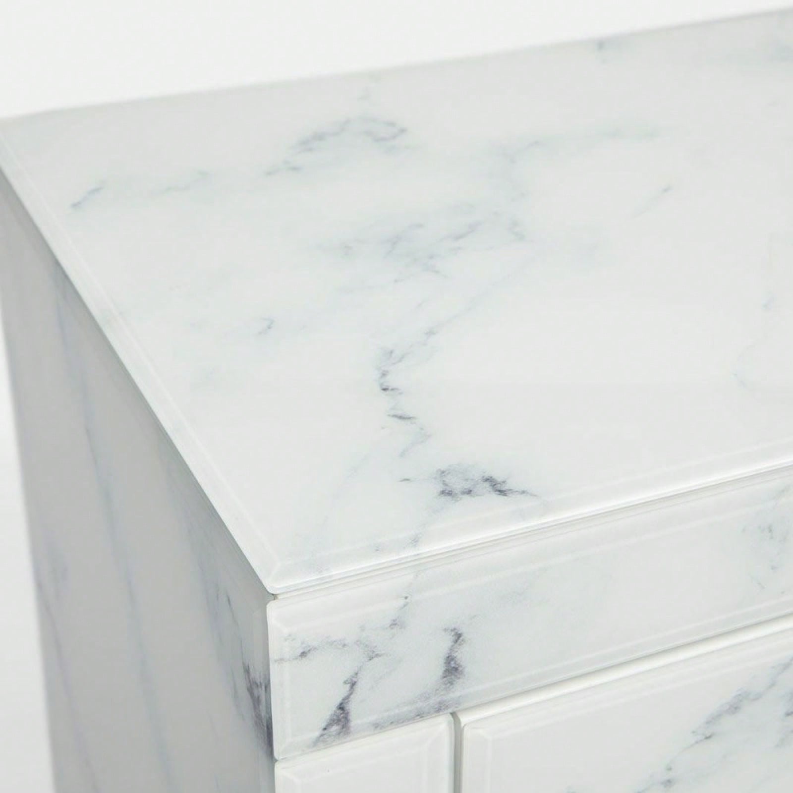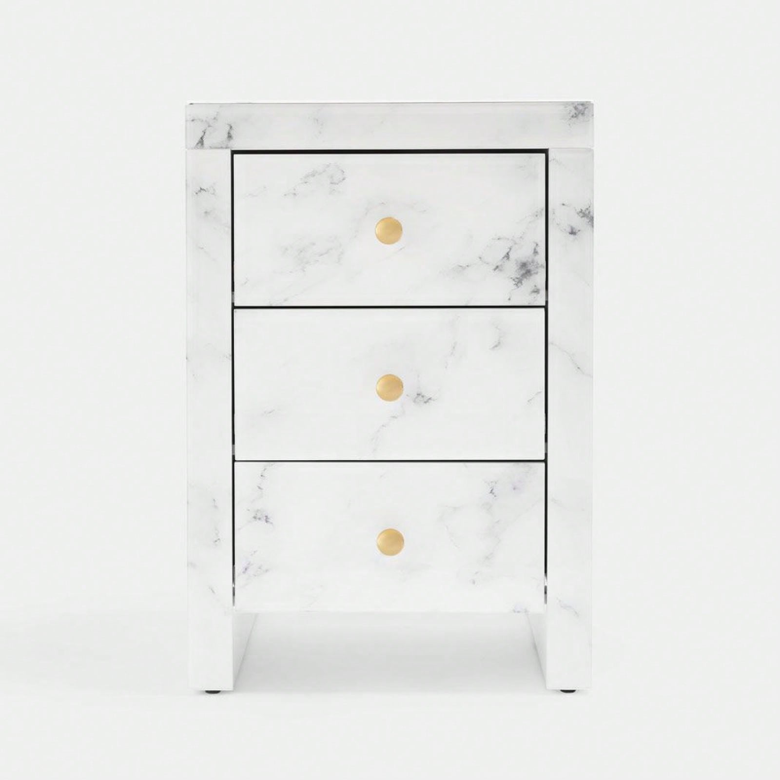 Elegant Marble Pattern Nightstand with 3 Drawers and Tempered Glass Top for Bedroom and Living Room Storage