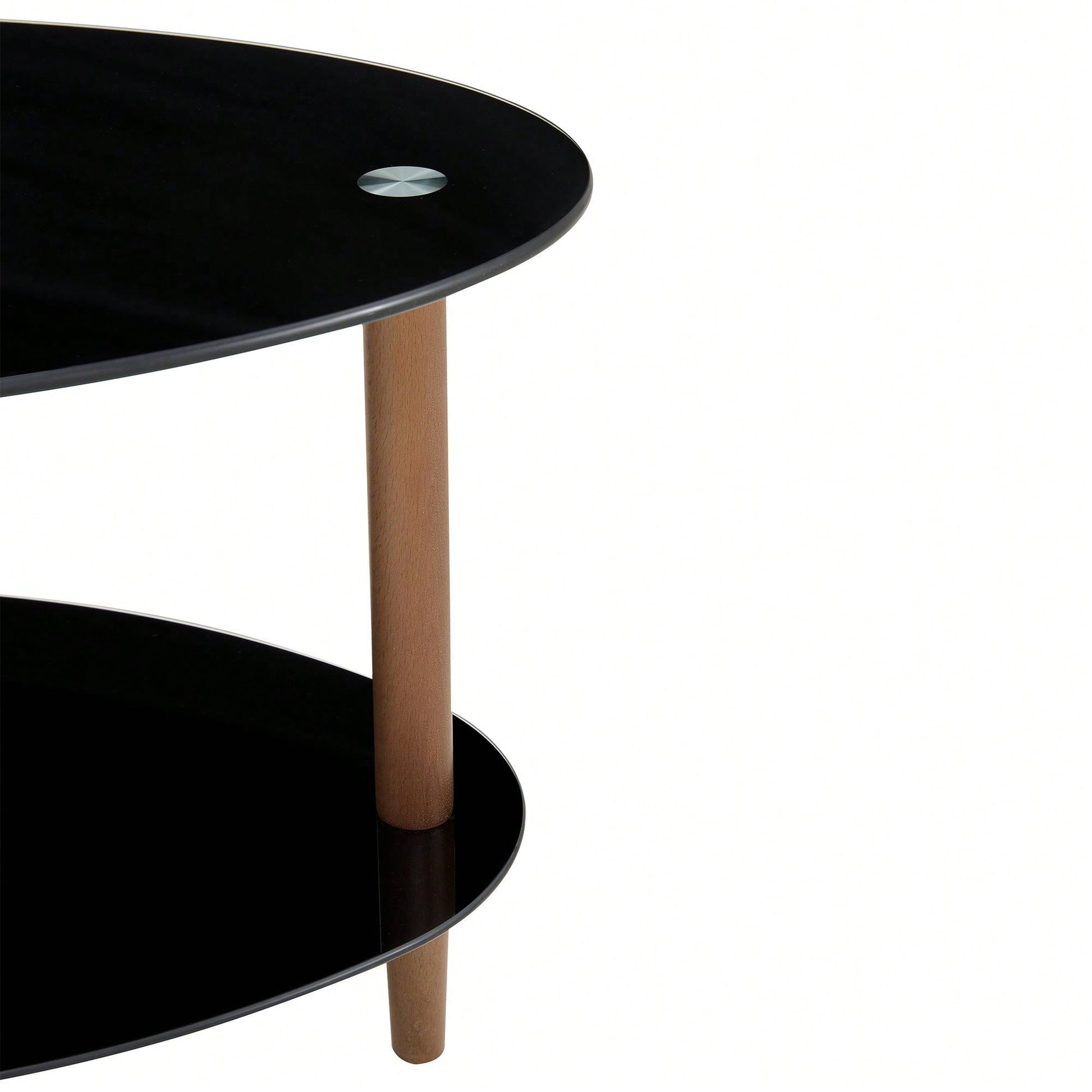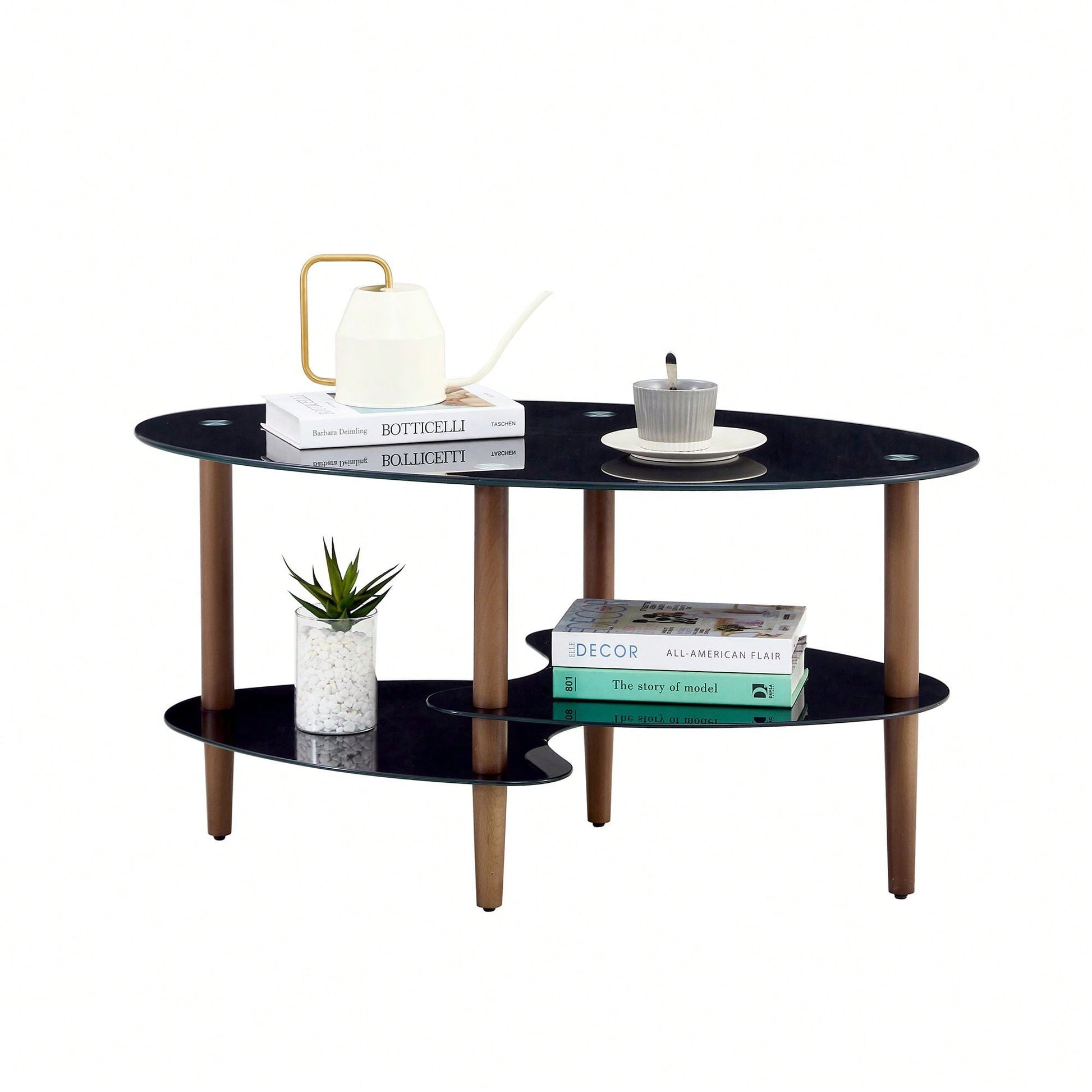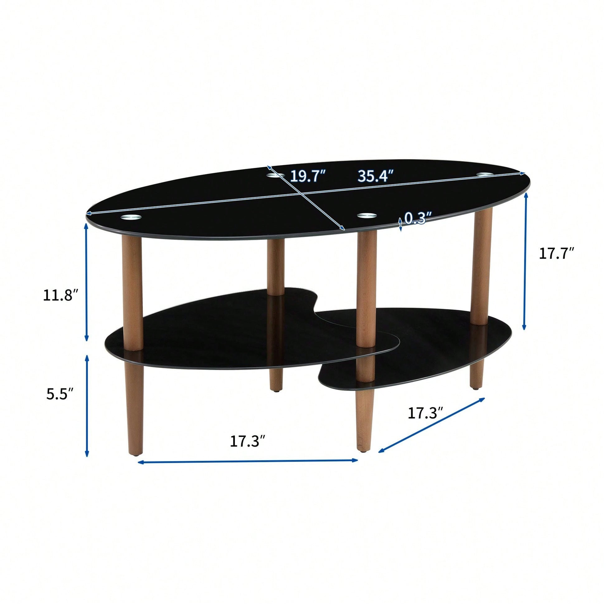 Modern Oval Coffee Table With Tempered Glass Top, Oak Wood Leg, And Storage Space