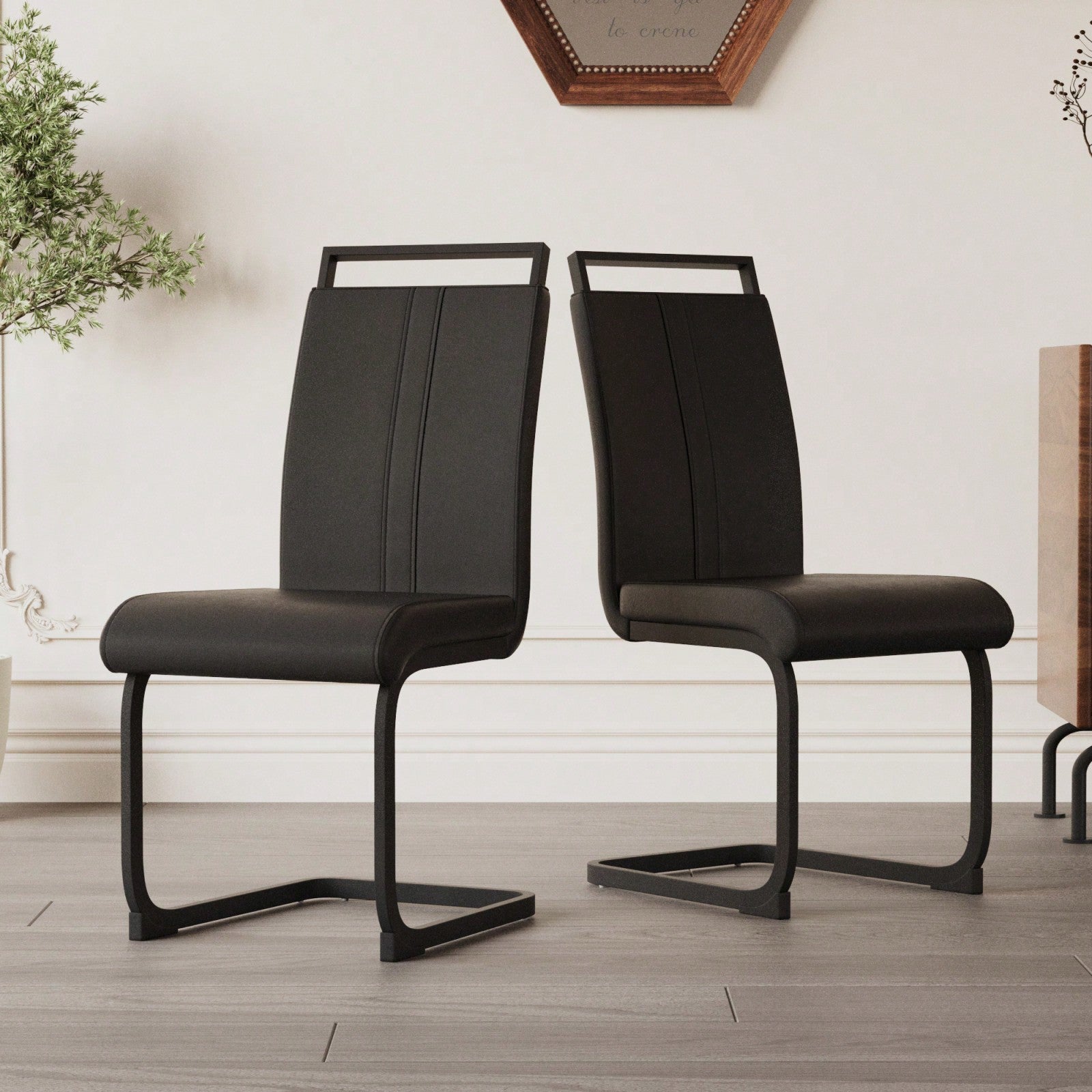 Modern dining chairs featuring a sleek design that serves as a stylish alternative to traditional seating. Upholstered in high-quality faux leather, these chairs offer comfort and elegance for any dining occasion. The sturdy C-shaped black metal legs provide a contemporary touch while ensuring stability and durability. With anti-scratch plastic feet, these chairs protect your floors from damage. The thickened cushion and generously filled backrest ensure comfort during long meals.