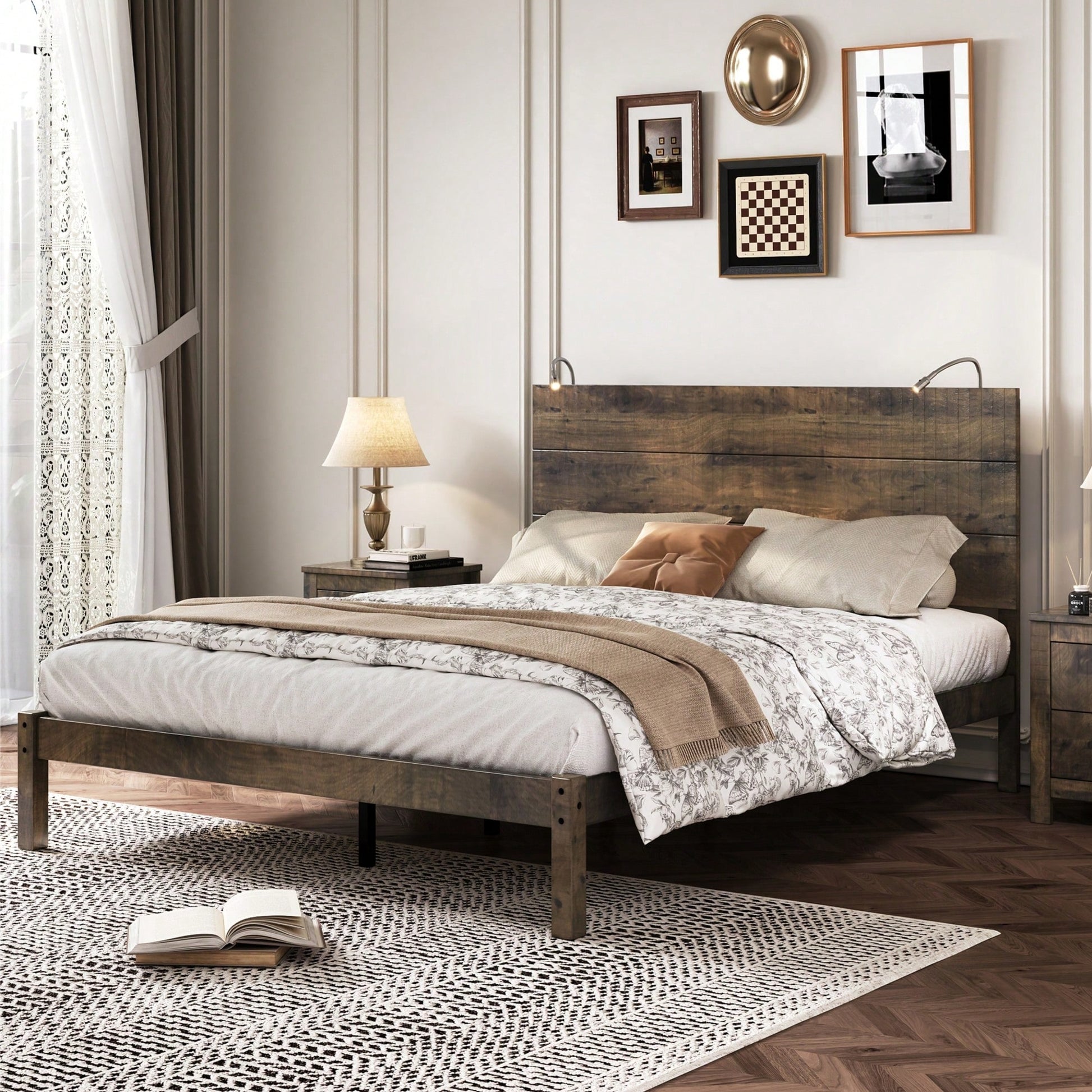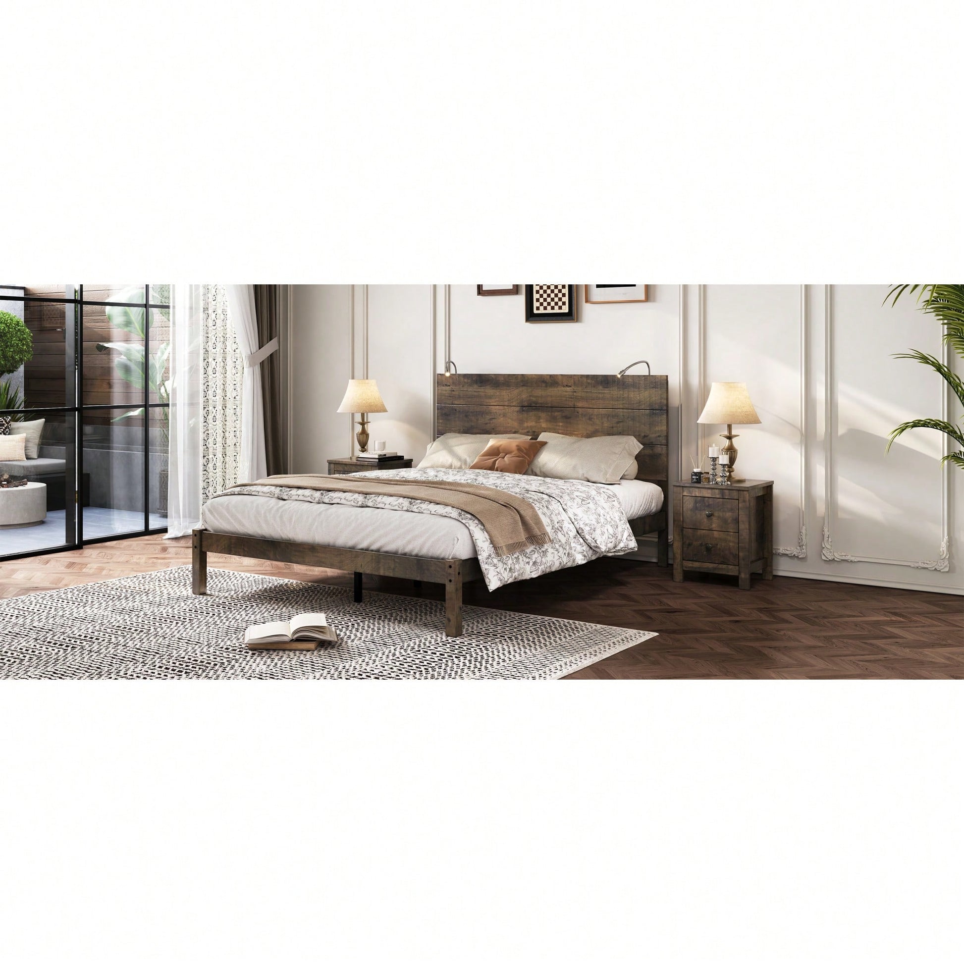 This platform bed features a captivating farmhouse aesthetic that enhances any bedroom with its rustic charm. The built-in bedside lights provide soft illumination, making it perfect for reading or relaxation without the need for additional lamps. Its modern and classic design ensures it fits seamlessly into various interior styles. Constructed from sturdy wood, this bed guarantees durability and comfort, making it a reliable choice for your sleeping space.