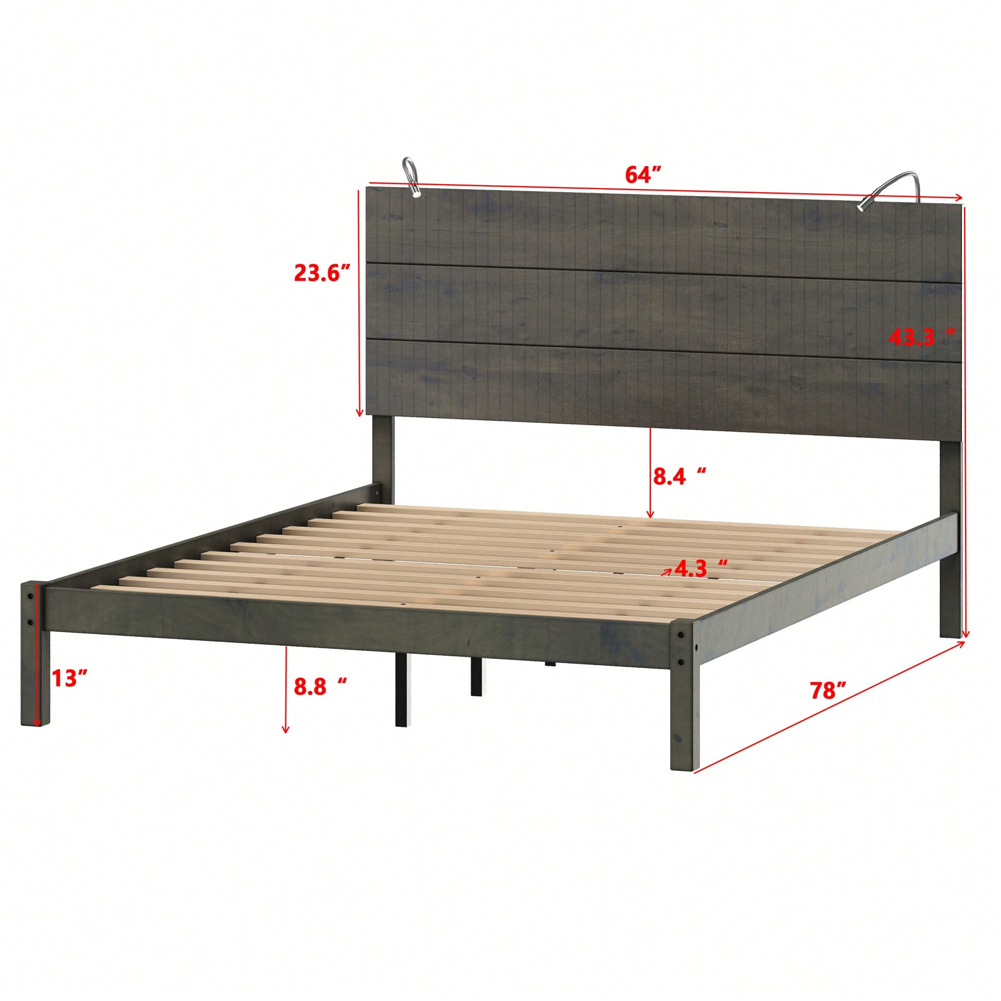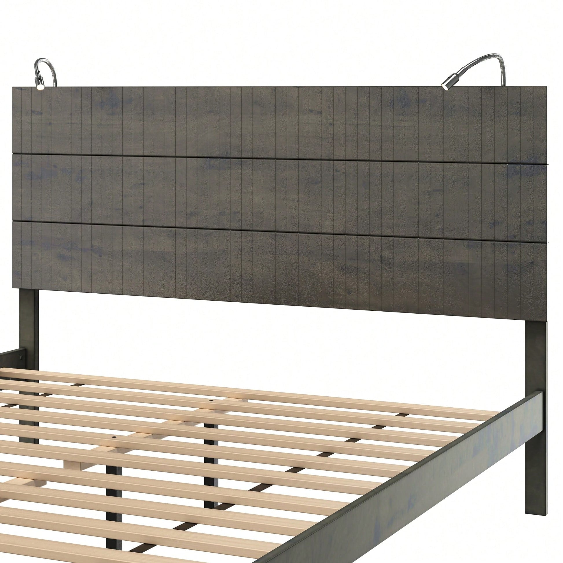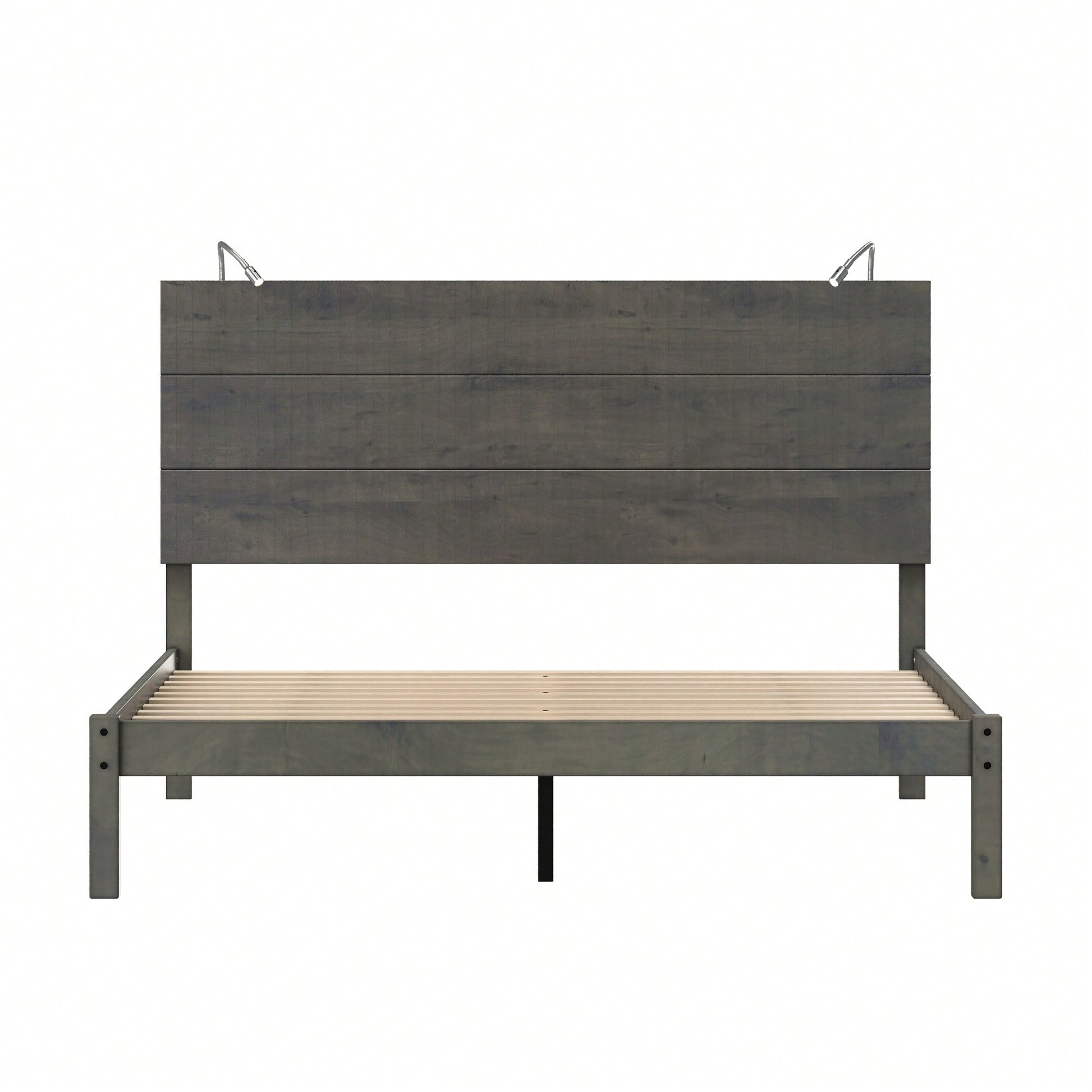 Modern Queen Size Farmhouse Wooden Platform Bed With Antique Gray Finish And Two Bedside Lights