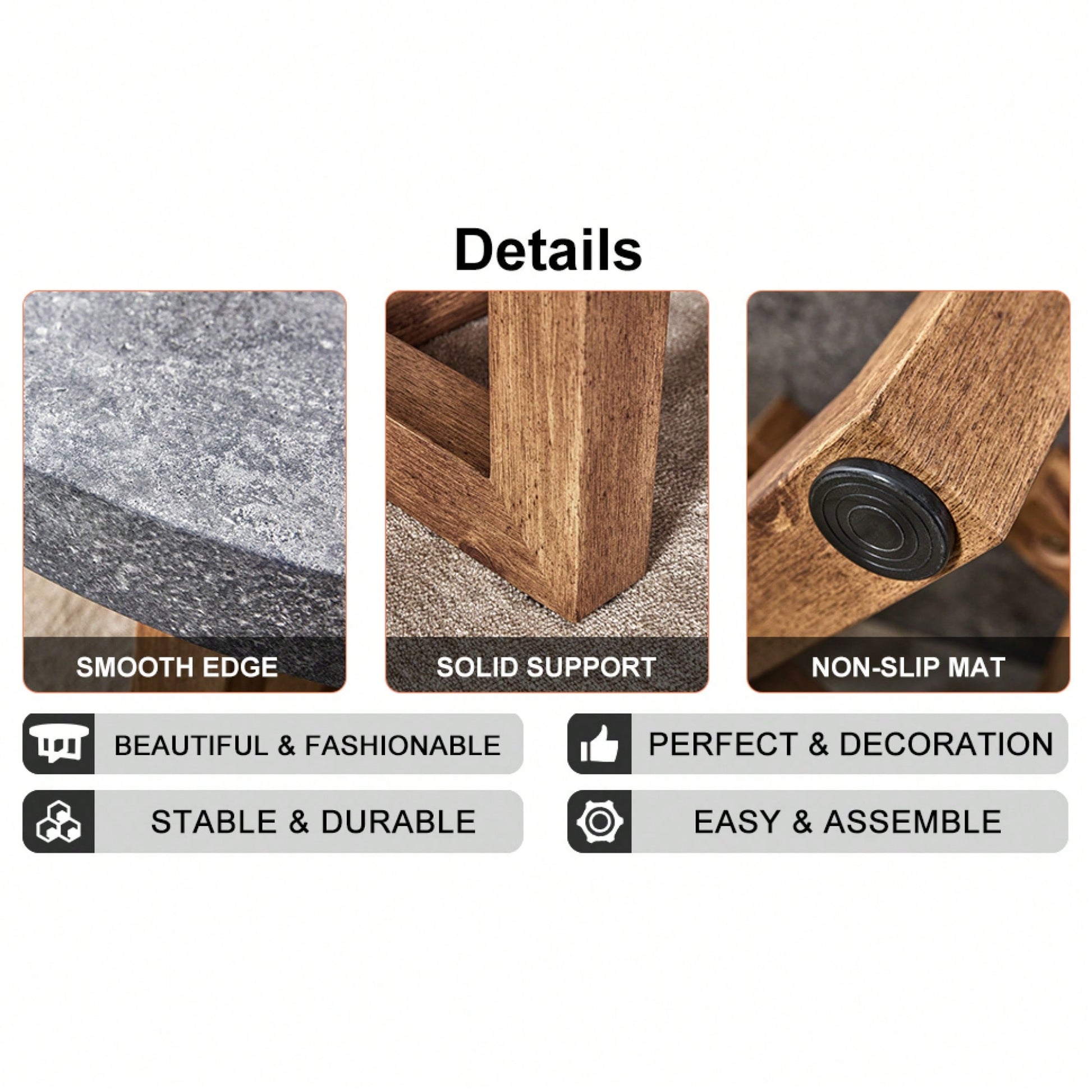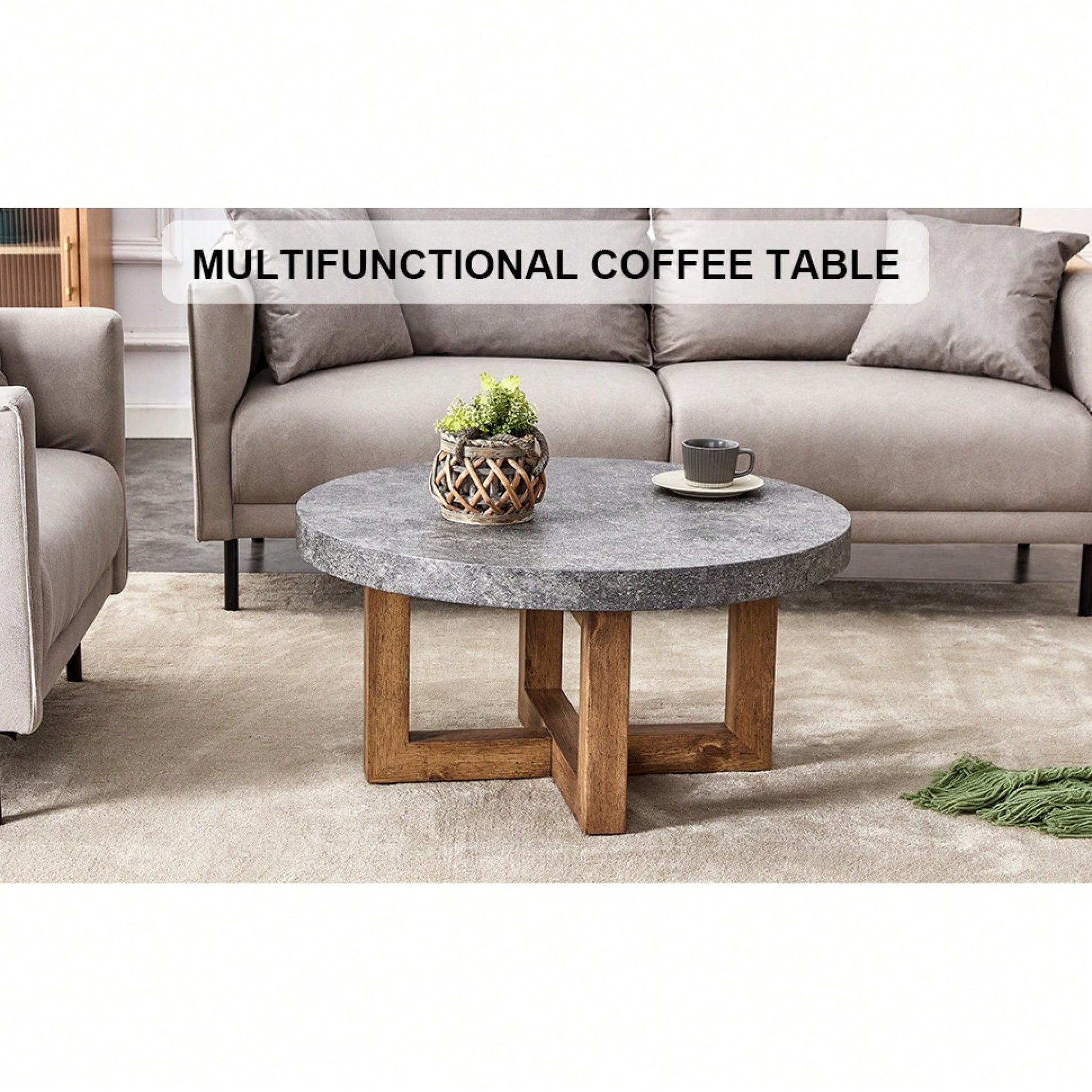 This modern retro circular coffee table features a 31.4-inch diameter, making it an ideal centerpiece for your living room. Crafted from high-quality MDF, it combines durability with an elegant design. The table showcases a cross retro splicing design with a smooth gray textured tabletop that mimics natural stone, adding a stylish touch to any decor. The wooden texture legs complement the tabletop while providing sturdy support. With a thick 2-inch tabletop, this coffee table offers strong load-bearing capacity, perfect for everyday use. The anti-slip bottom pads ensure stability during use, while the smooth edges enhance safety. Assembly is straightforward, taking only 15-20 minutes with included instructions and tools.