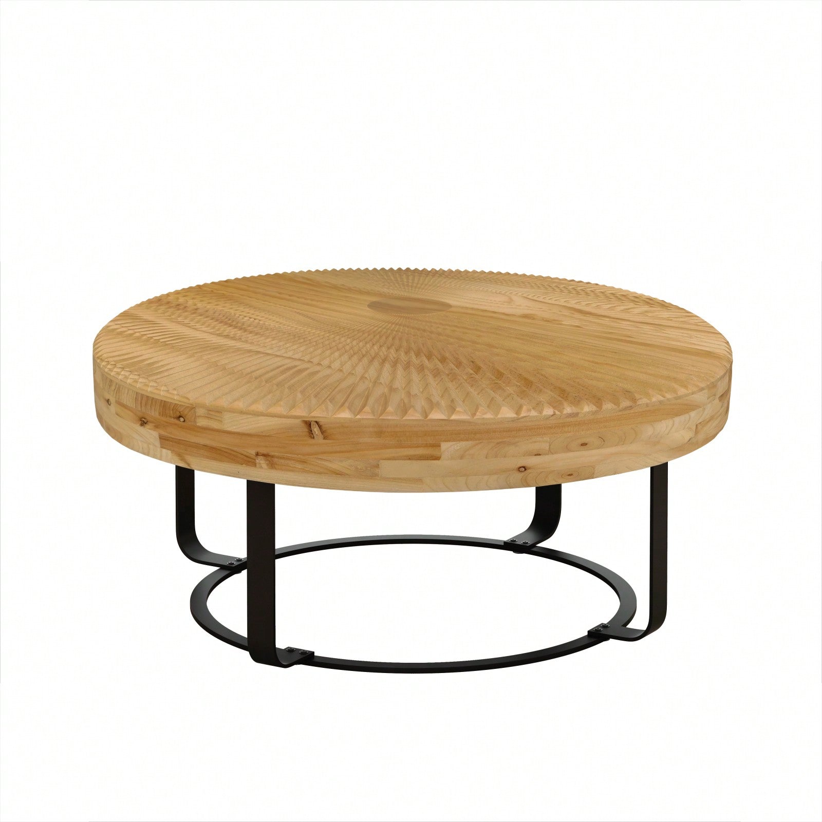 This round coffee table seamlessly blends natural elements with modern design. The tabletop, crafted from carved pine, boasts a unique visual texture, while the six curved metal legs provide sturdy support and a touch of industrial chic. The contrasting materials and sleek silhouette make this table a statement piece for any contemporary living room, reception area, or office. Its durable construction ensures lasting enjoyment for years to come.