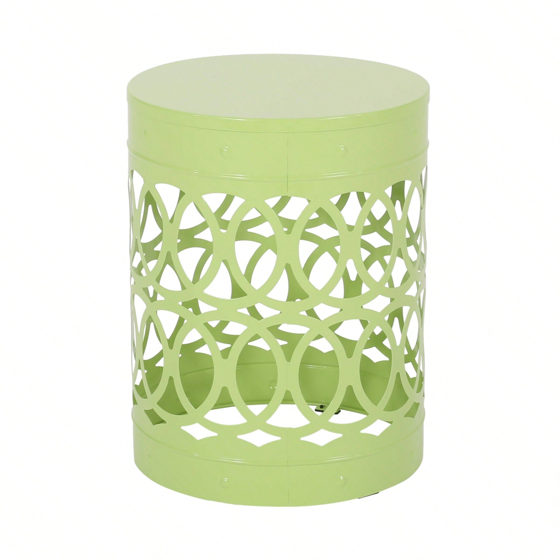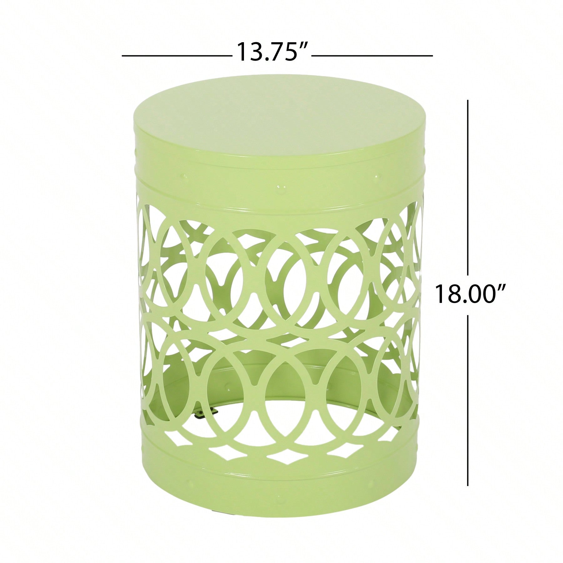 This large metal end table features a modern design with clean lines and a charming cylindrical structure. The elegant iron cut design showcases a beautiful overlapping circle pattern, adding a chic and minimalistic touch to any space. Crafted from durable powder-coated iron, this table is built to withstand regular use while maintaining its stylish appearance. Its sturdy construction ensures long-lasting functionality, making it an ideal accent piece for your home. Best of all, it comes ready to use straight out of the box, requiring no assembly.