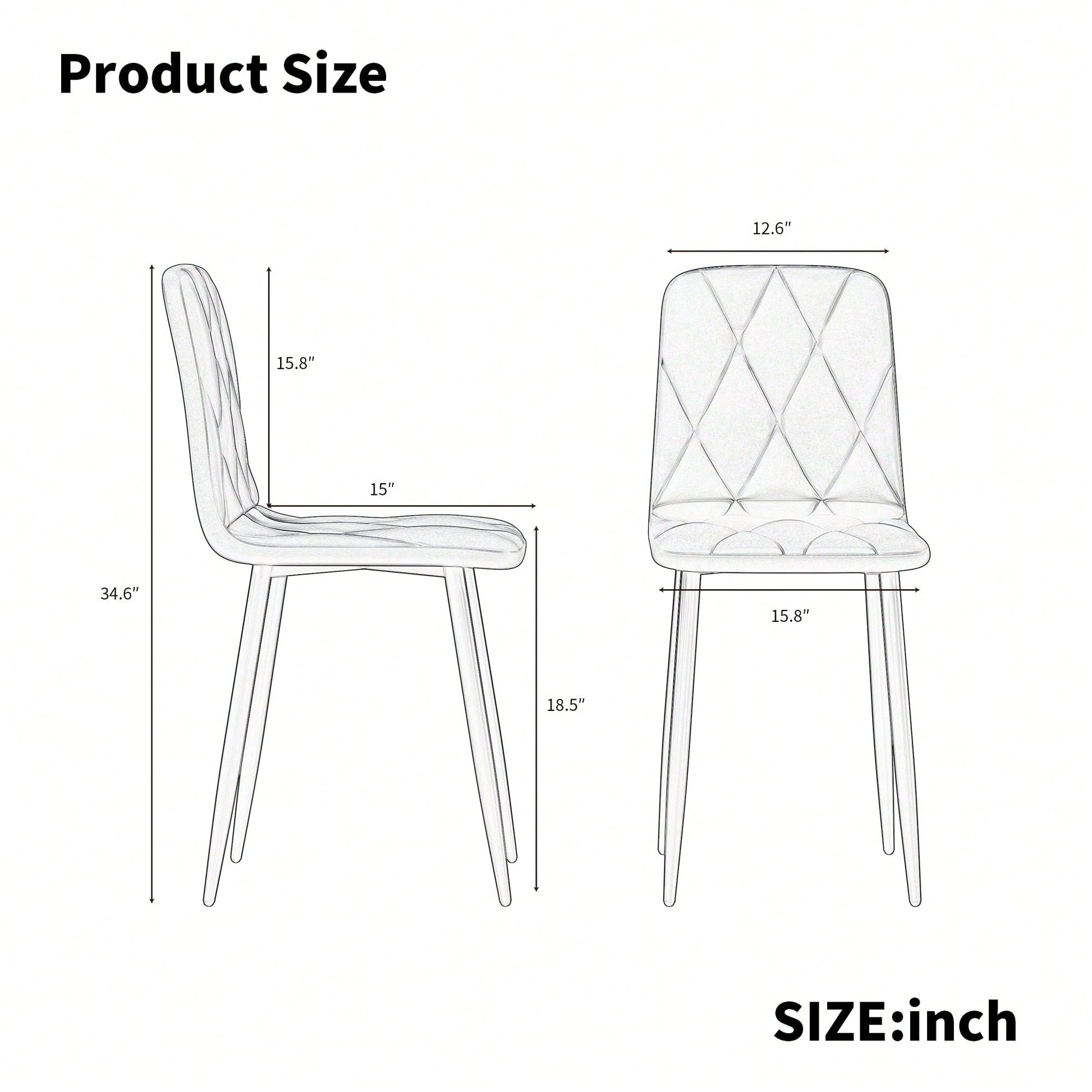 This set of four contemporary dining chairs combines style and comfort, making them a perfect addition to any kitchen or dining area. Each chair features a plush velvet surface wrapped around high-density sponge, providing a smooth and inviting touch. The ergonomic design is complemented by a curved high backrest, ensuring a snug fit that allows for long periods of comfort without stiffness. The chairs are supported by reinforced iron legs, offering enhanced stability while being able to bear a maximum weight of 286 lbs.