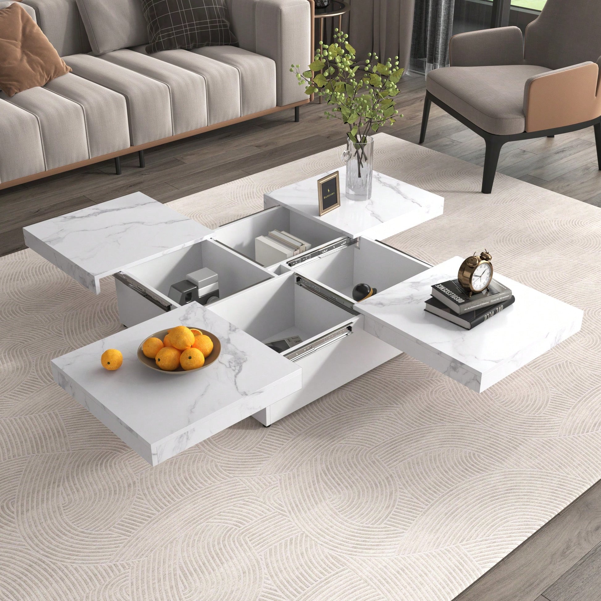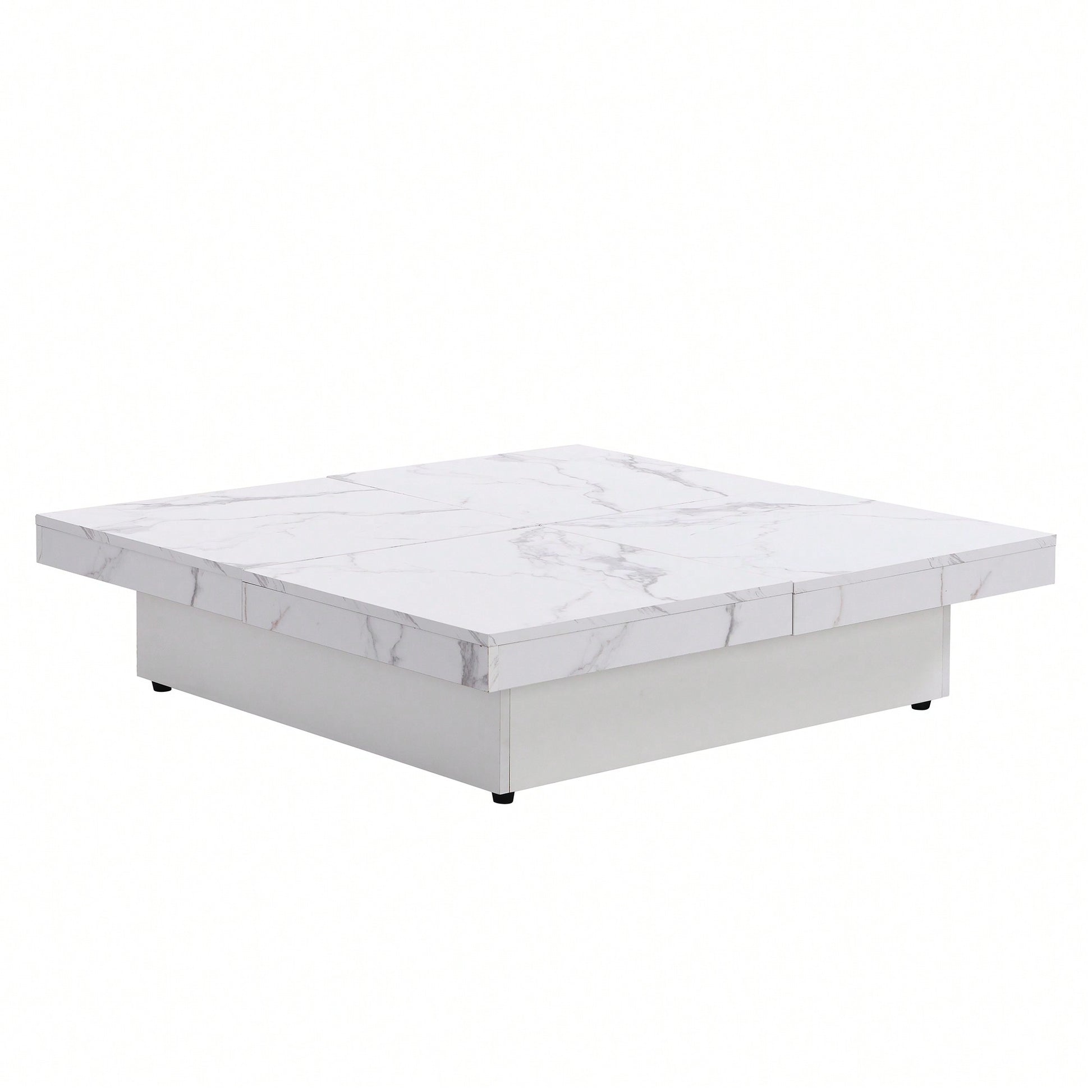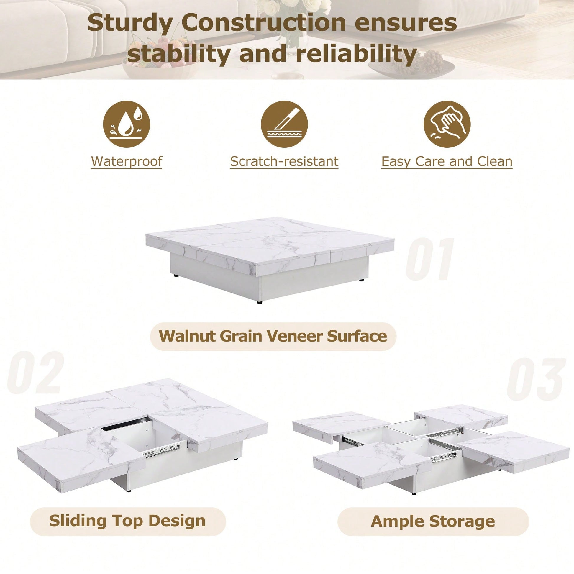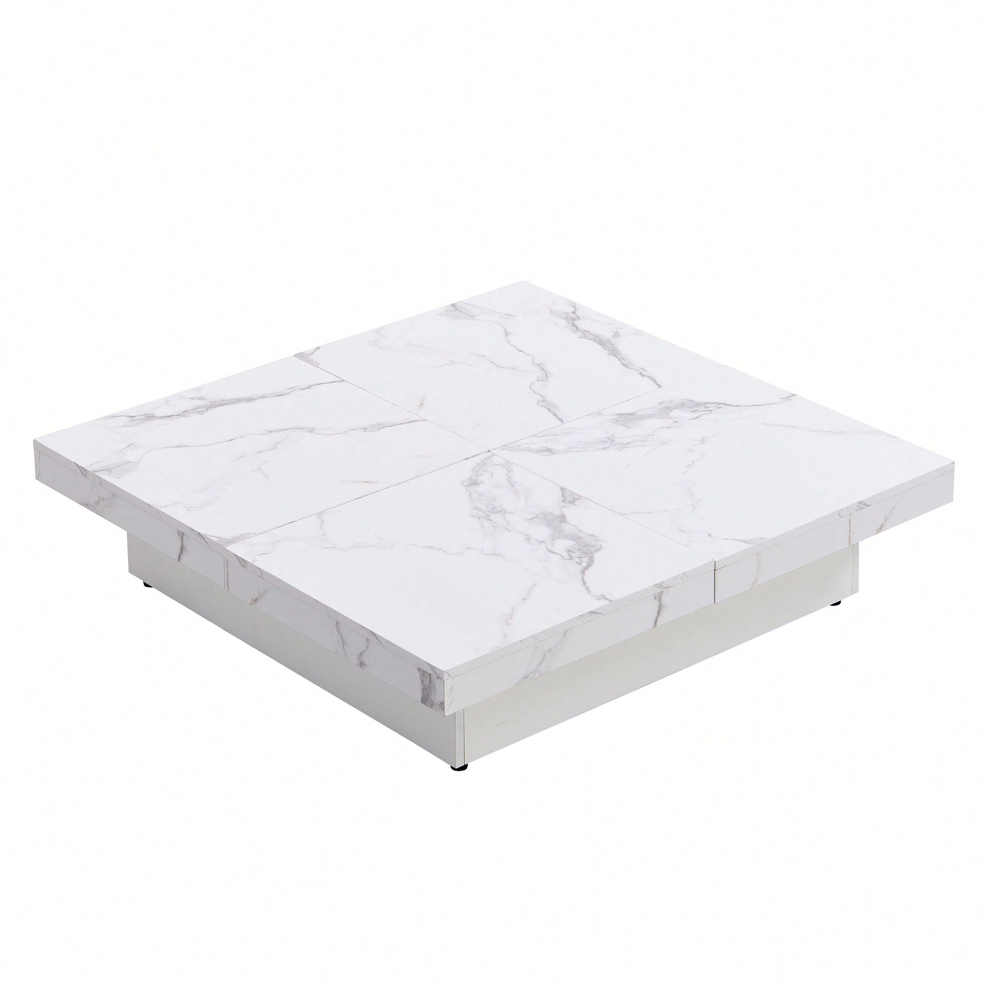 **Key Features** - Elegant marble veneer surface for a sophisticated look - Unique sliding top design for easy access to storage - Ample storage space for books, magazines, and essentials - Durable MDF construction for long-lasting use - Versatile square shape and neutral color to fit various decor styles **Product Description** This coffee table features a stunning marble veneer surface that enhances the elegance of your living space without the high cost of solid marble. The innovative sliding top design provides convenient access to a spacious storage compartment underneath, perfect for keeping your living room organized. Crafted from high-quality MDF, this table is built for durability and stability, ensuring it will remain a reliable piece of furniture in your home. Its versatile design allows it to complement a range of interior styles, making it an ideal addition to any room. **Specifications** - Dimensions: 39.4 inches square - Material: MDF with marble veneer surface - Color: White