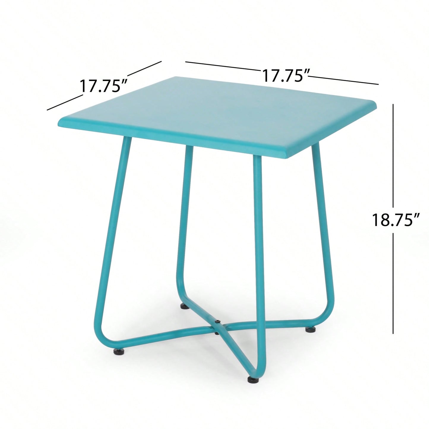 This 18" side table features a modern design with bold, straight legs and clean lines. The symmetrical structure showcases an enclosed base with legs crossing at the bottom to form a chic X-shape. Constructed from durable steel, this table is built to withstand heavy use while maintaining its stylish appearance. The complementing finish adds a refreshing vibe, making it a perfect addition to any space. With its compact size, this end table is ideal for placement next to an outdoor sofa or between seating arrangements.