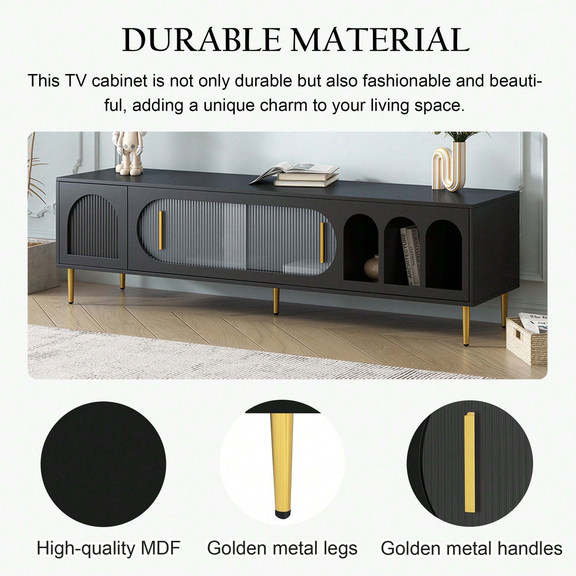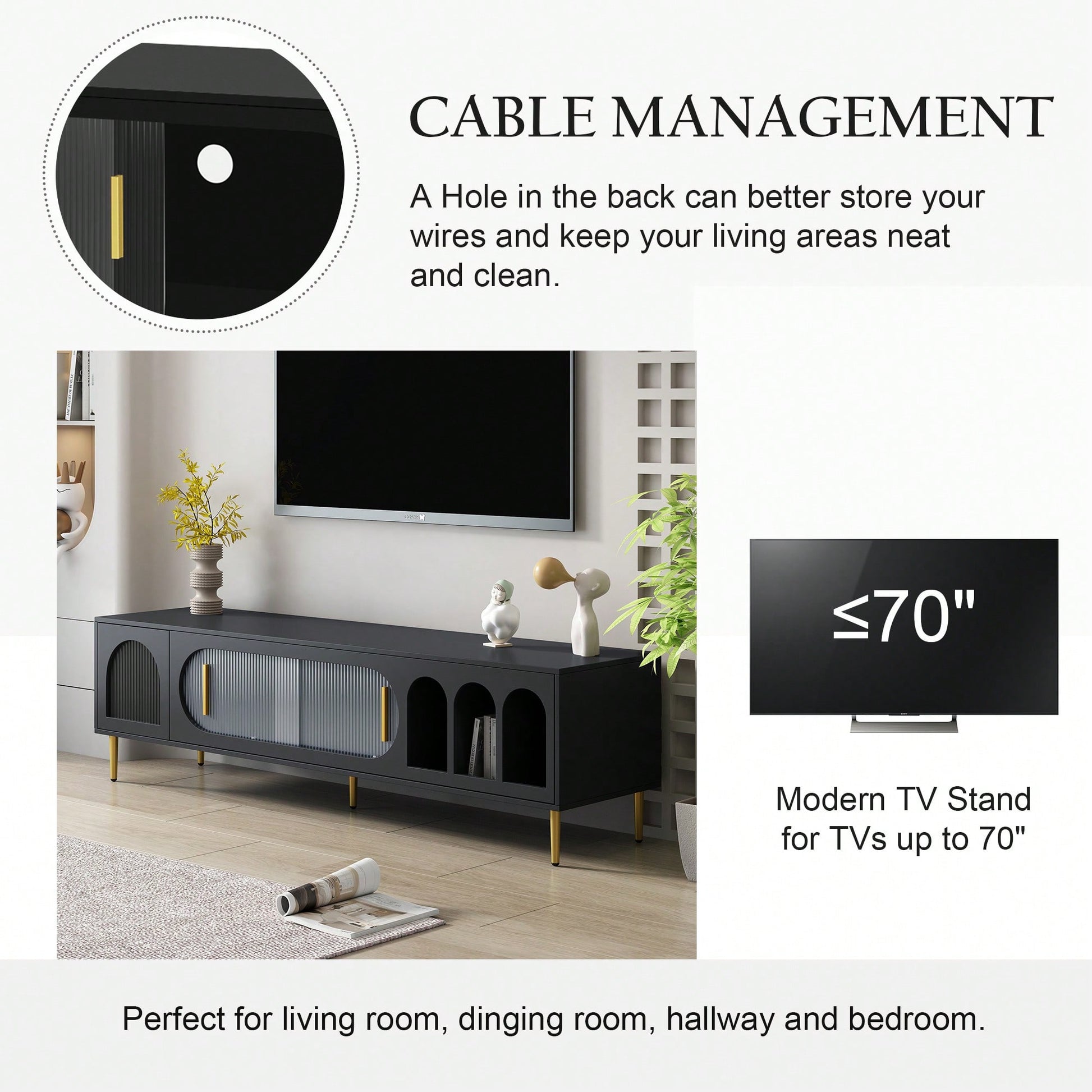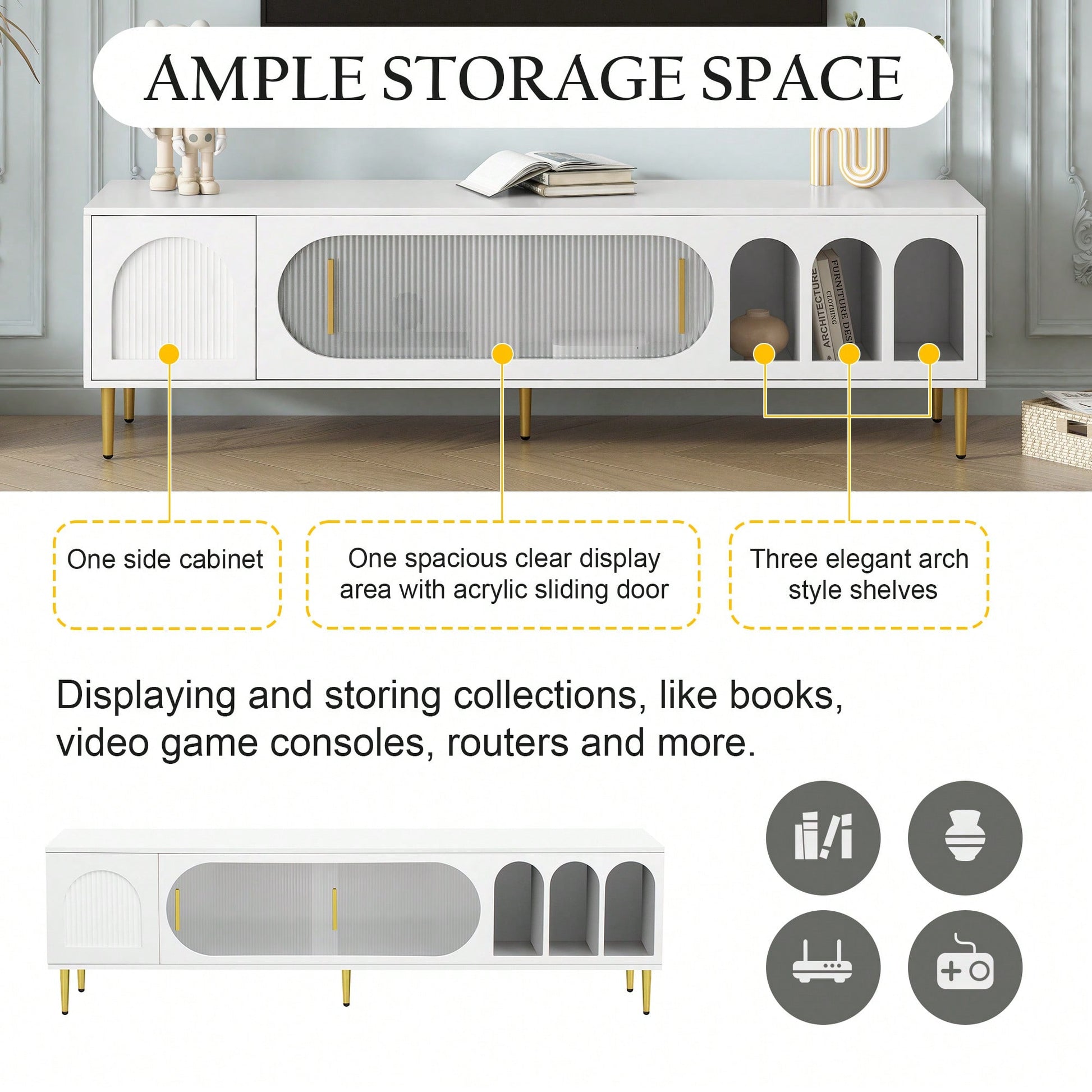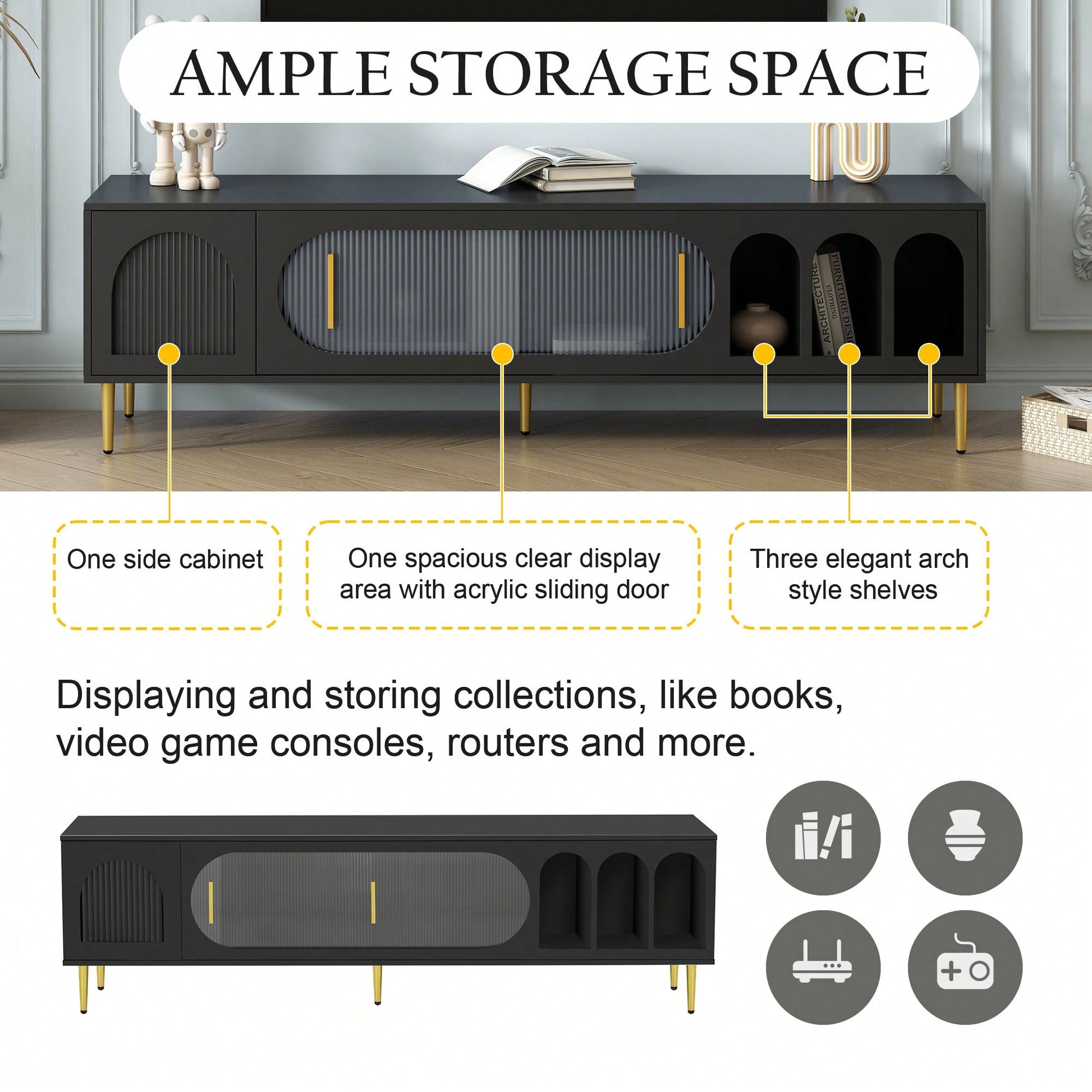 This modern TV stand is designed to accommodate TVs up to 70 inches, enhancing any living space with its sophisticated aesthetic. Featuring three semi-open arched shelf areas, it provides ample display space while the sliding transparent acrylic door adds visual interest by showcasing the items inside. The metal golden handles and legs not only offer functionality but also elevate the overall look of the piece. A hidden cabinet on the left side allows for discreet storage of clutter, while the back panel includes a storage hole for efficient cable management. Assembly is straightforward with the included instructions.