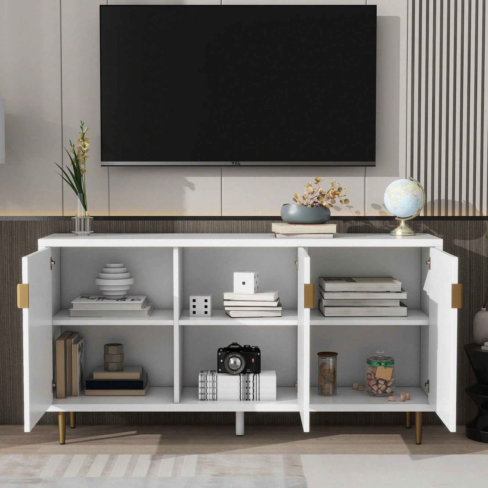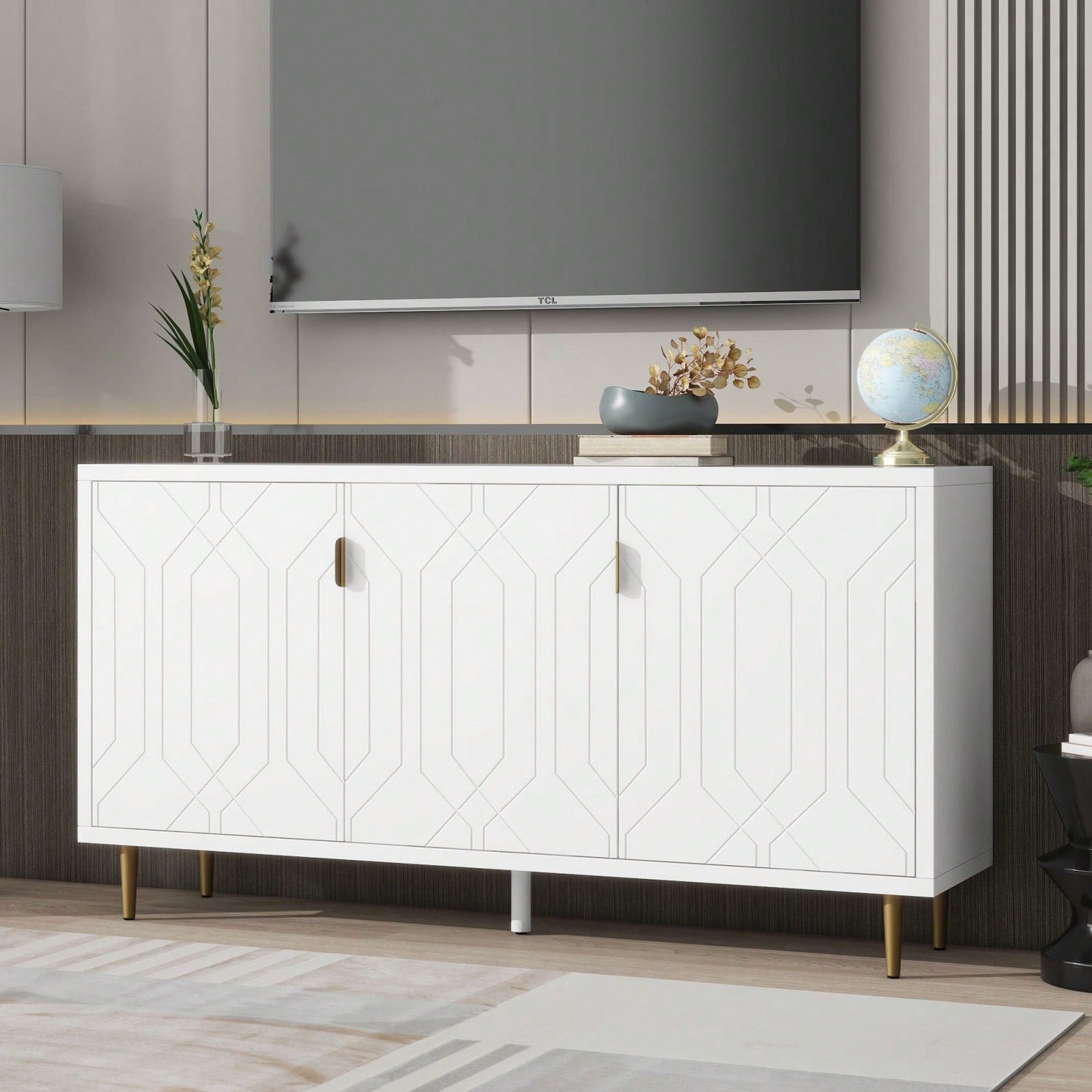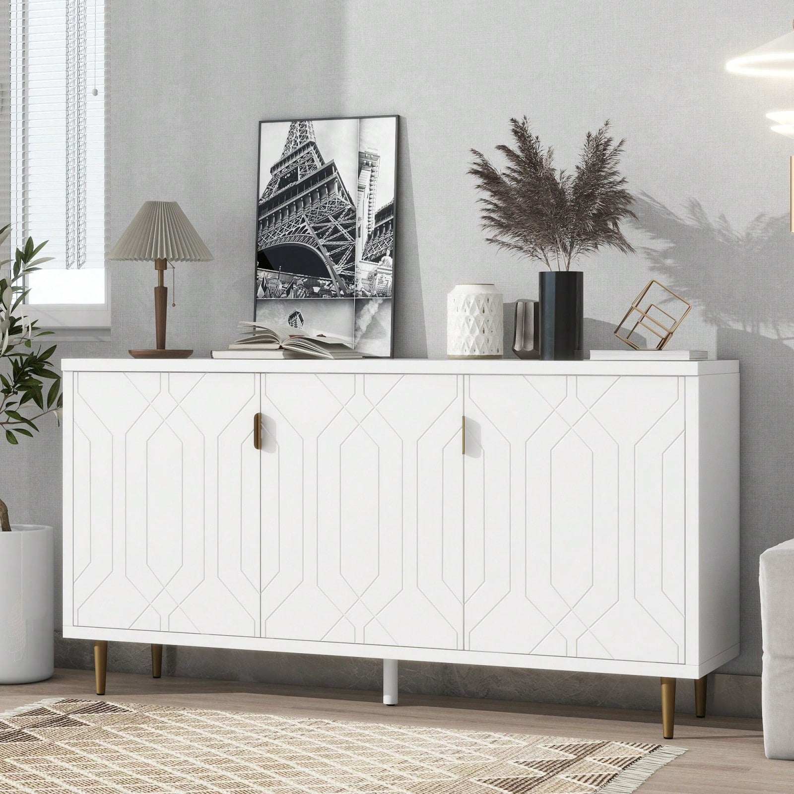 This modern TV stand with 3 doors and adjustable shelves is perfect for any contemporary modern decor. It is crafted from sturdy MDF and particle board, featuring a simple white sideboard cabinet with clean lines and sleek tapered metal legs. The cabinet is ideal for keeping DVDs, game consoles, magazines, and other items neatly organized in your living room, bedroom, dining room, hallway, or kitchen.