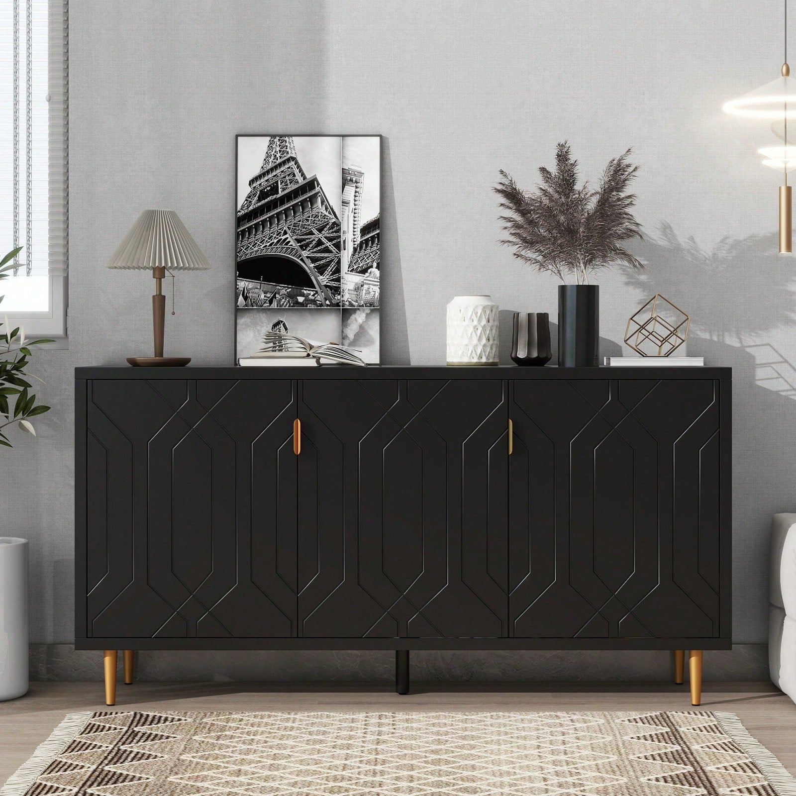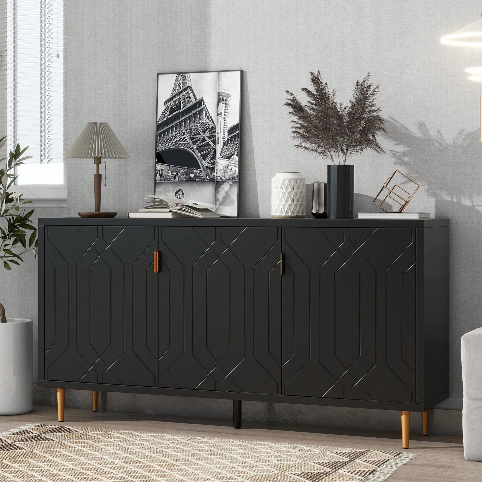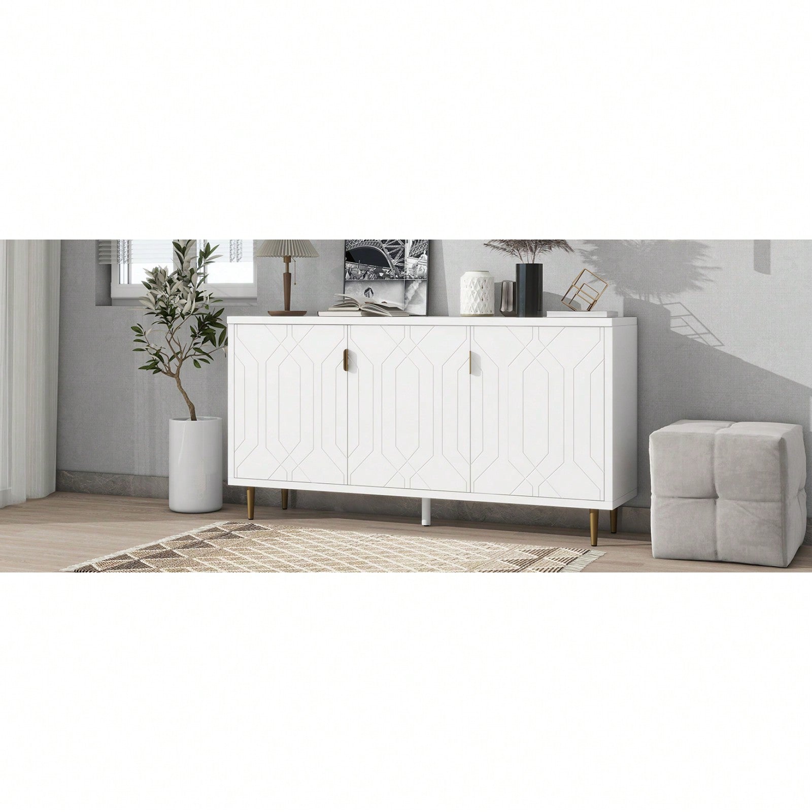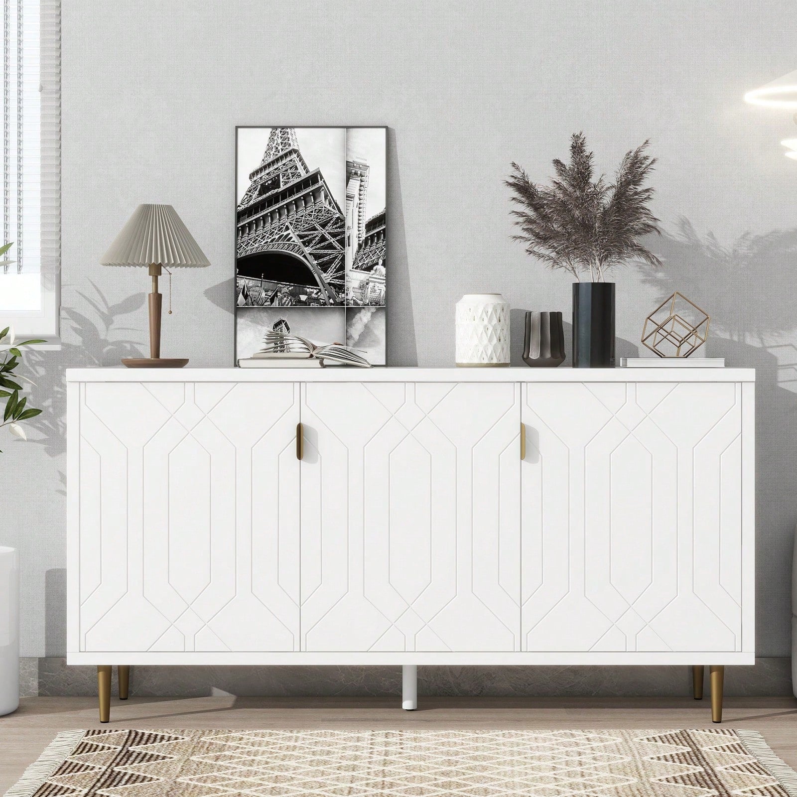 This modern TV stand with 3 doors and adjustable shelves is perfect for any contemporary modern decor. It is crafted from sturdy MDF and particle board, featuring a simple white sideboard cabinet with clean lines and sleek tapered metal legs. The cabinet is ideal for keeping DVDs, game consoles, magazines, and other items neatly organized in your living room, bedroom, dining room, hallway, or kitchen.