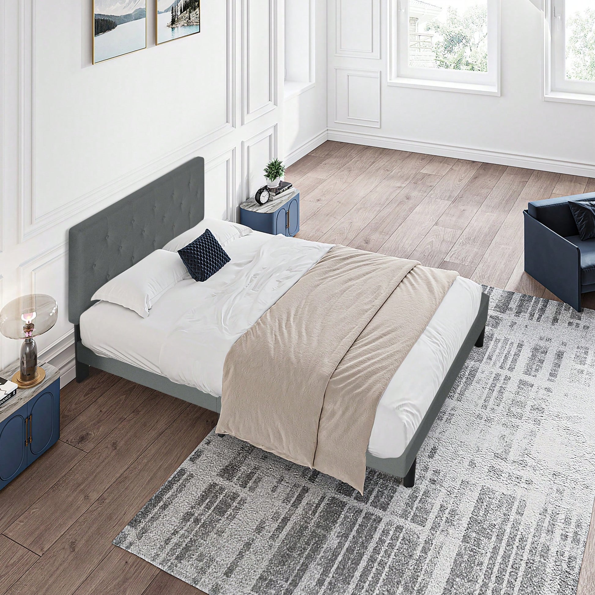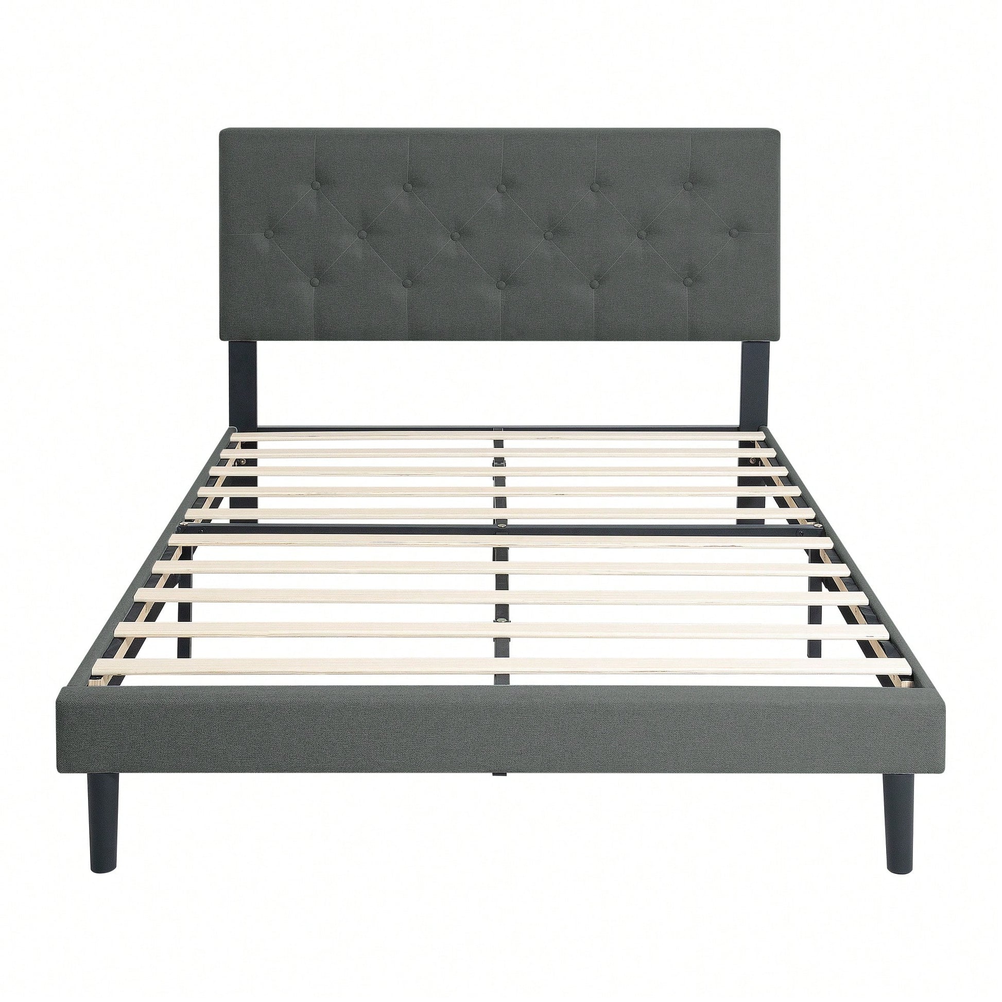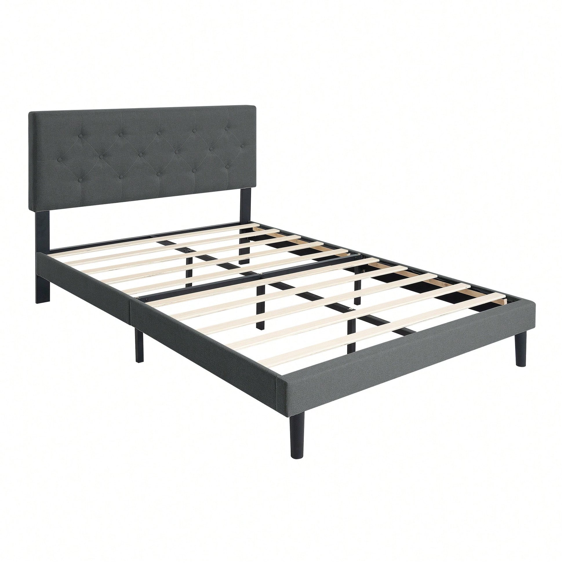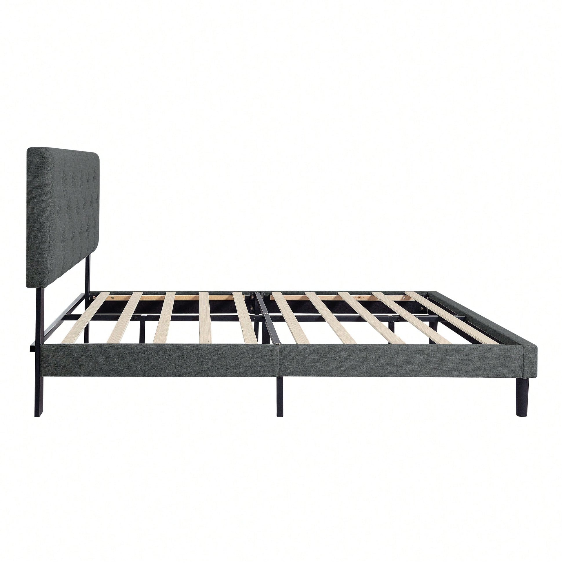 Enhance your bedroom's aesthetic with this modern upholstered platform bed frame. Featuring a chic button-tufted linen fabric headboard, it offers both style and comfort. The frame eliminates the need for a box spring, making it versatile for all mattress types. Its sturdy wood slat support structure ensures durability and stability, accommodating mattresses of 8 inches in thickness or greater. Assembly is straightforward, thanks to the included instructions, parts, and tools.
