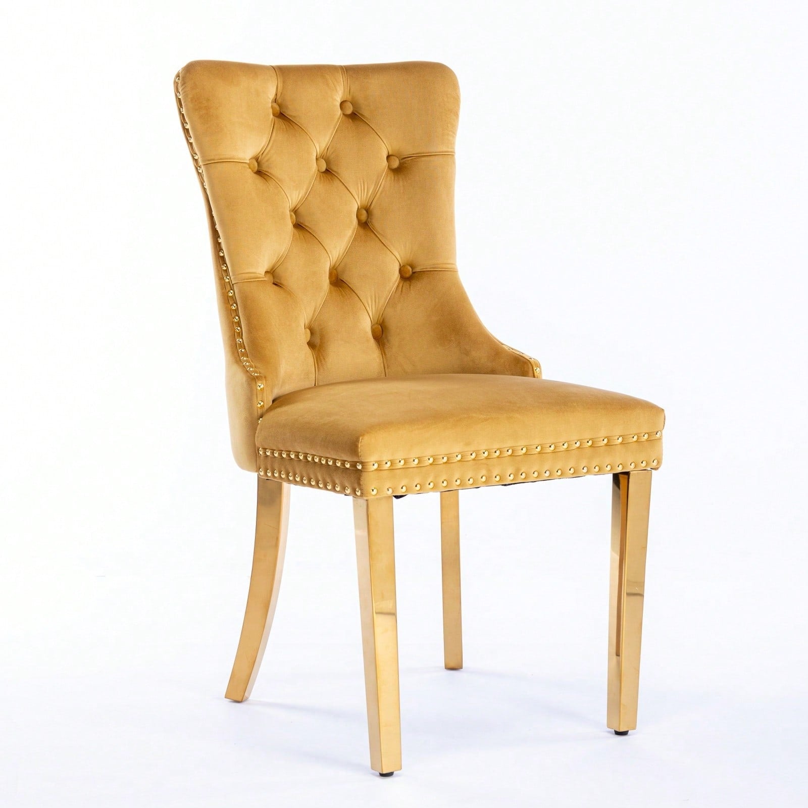 This set of two dining chairs brings a touch of modern elegance to any dining room. The chairs feature hand-made details, including hems on the backrest and decorative nailhead trim. construction includes a solid wood frame and stainless steel legs plated in gold. The comfortable cushions are designed with high-density foam and steel springs for long-lasting support. Assembly is easy with the included instructions.