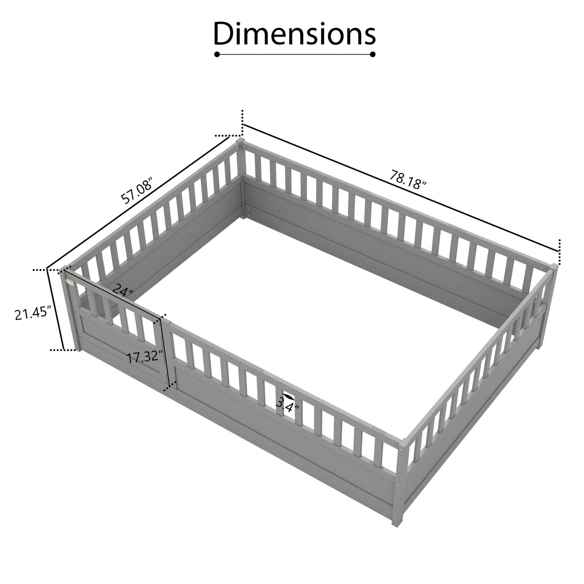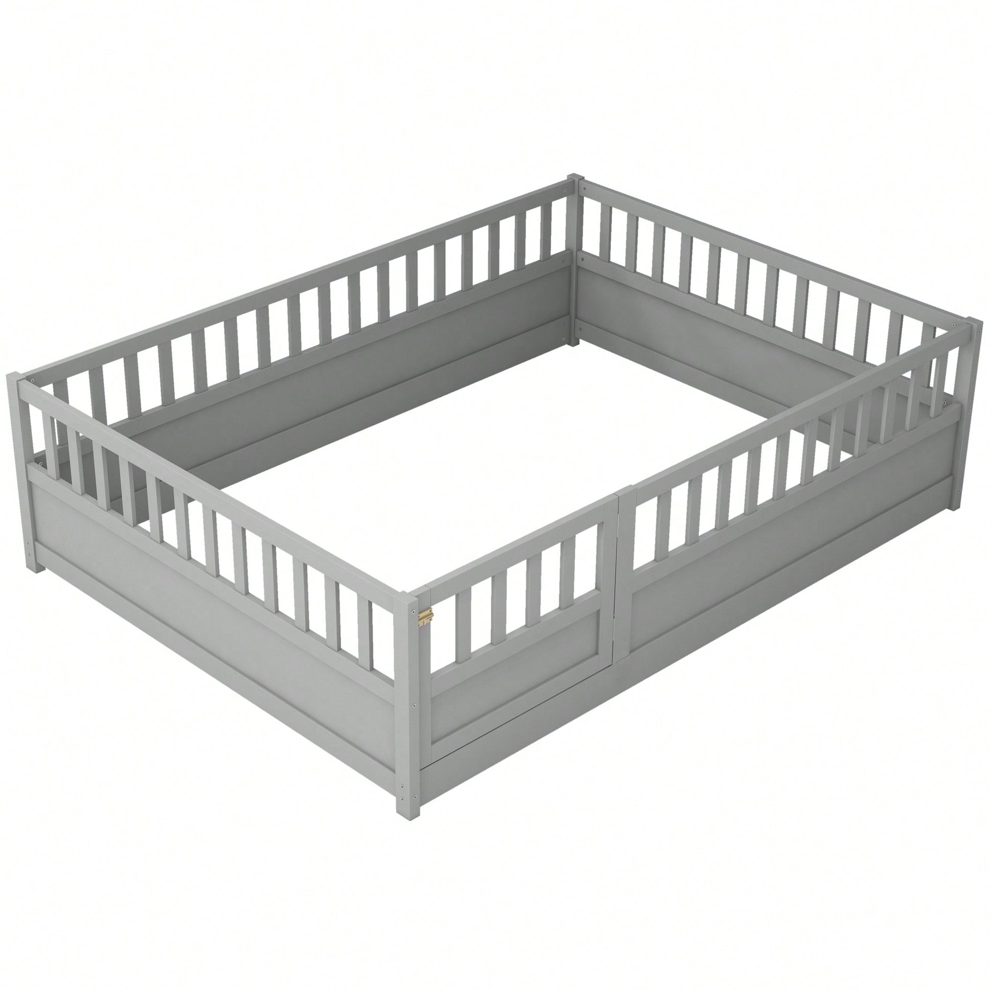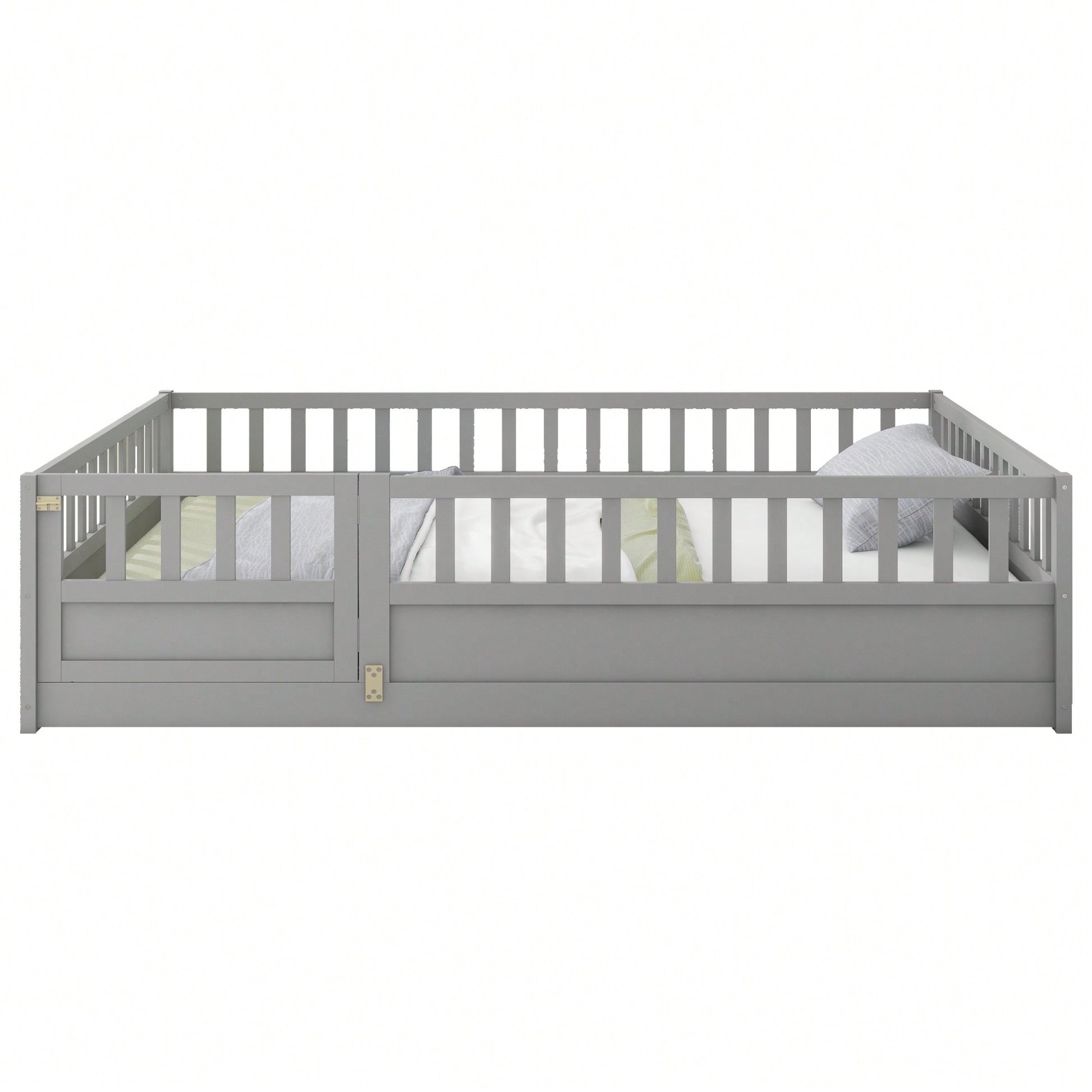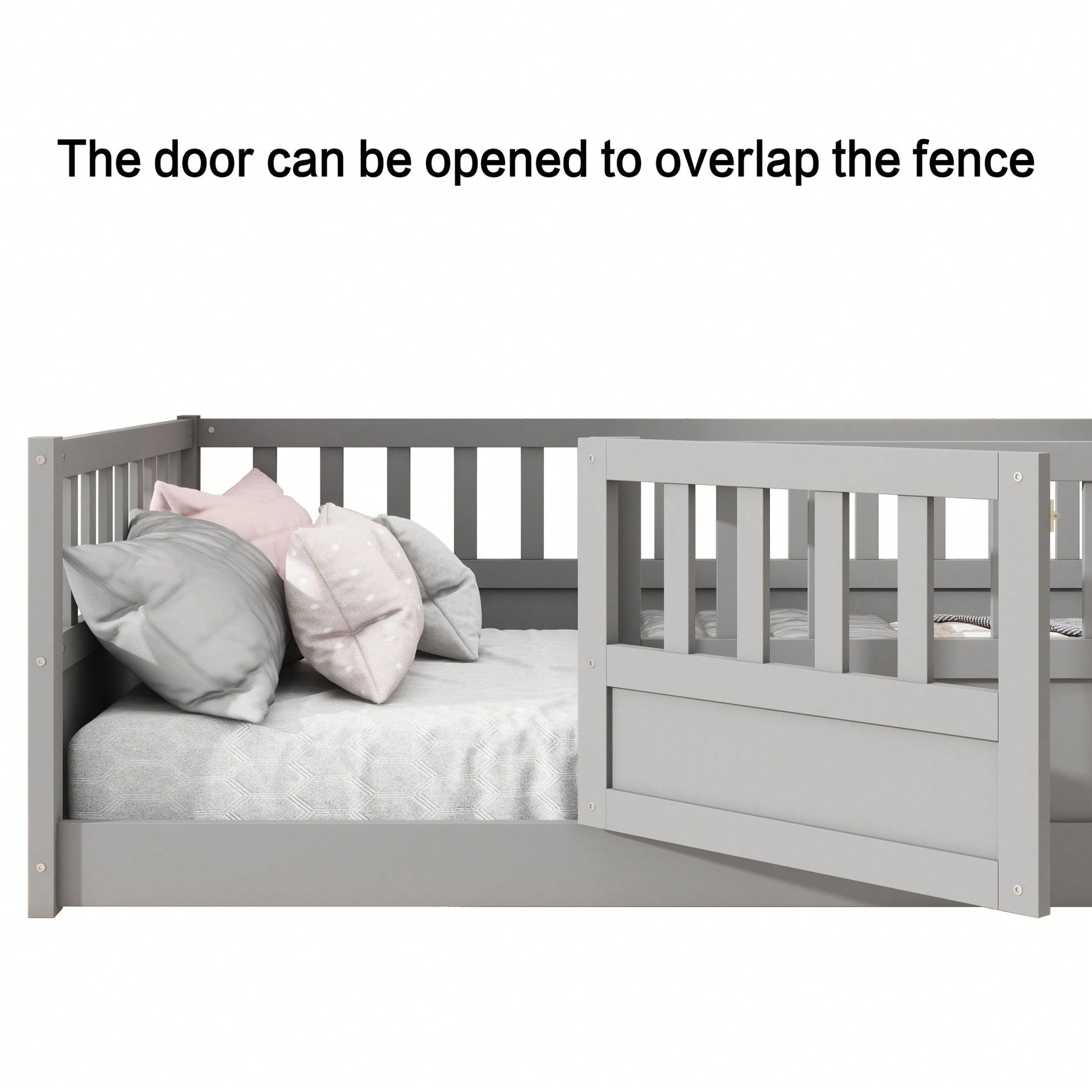 Montessori Style Full Size Children's Floor Bed With High Security Barrier And Door In Grey