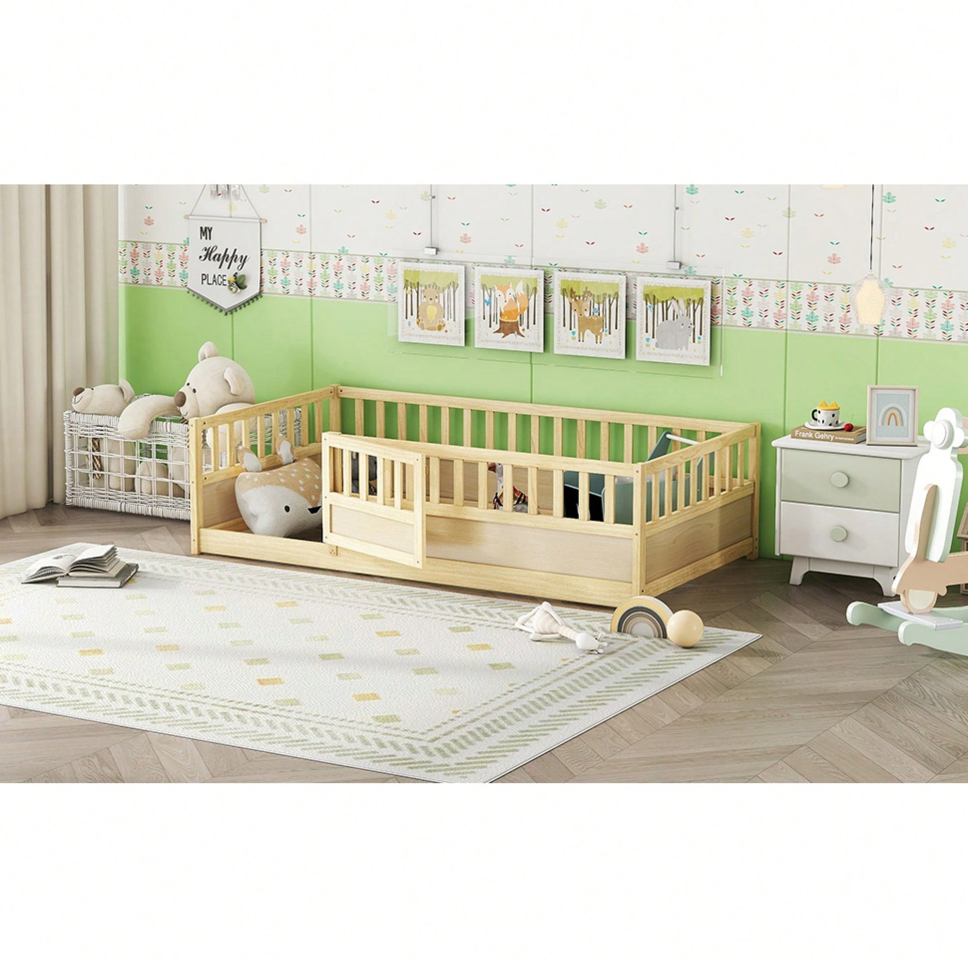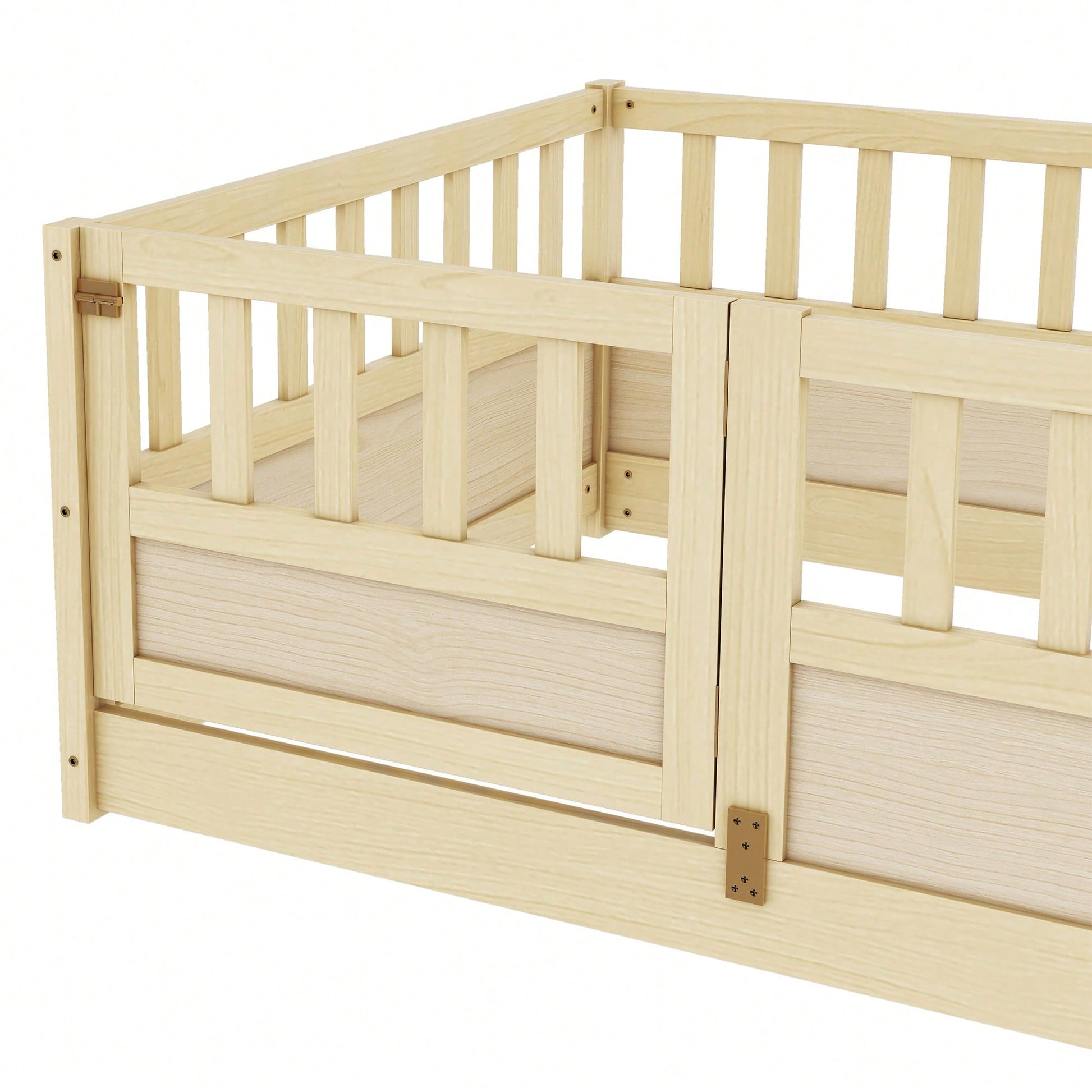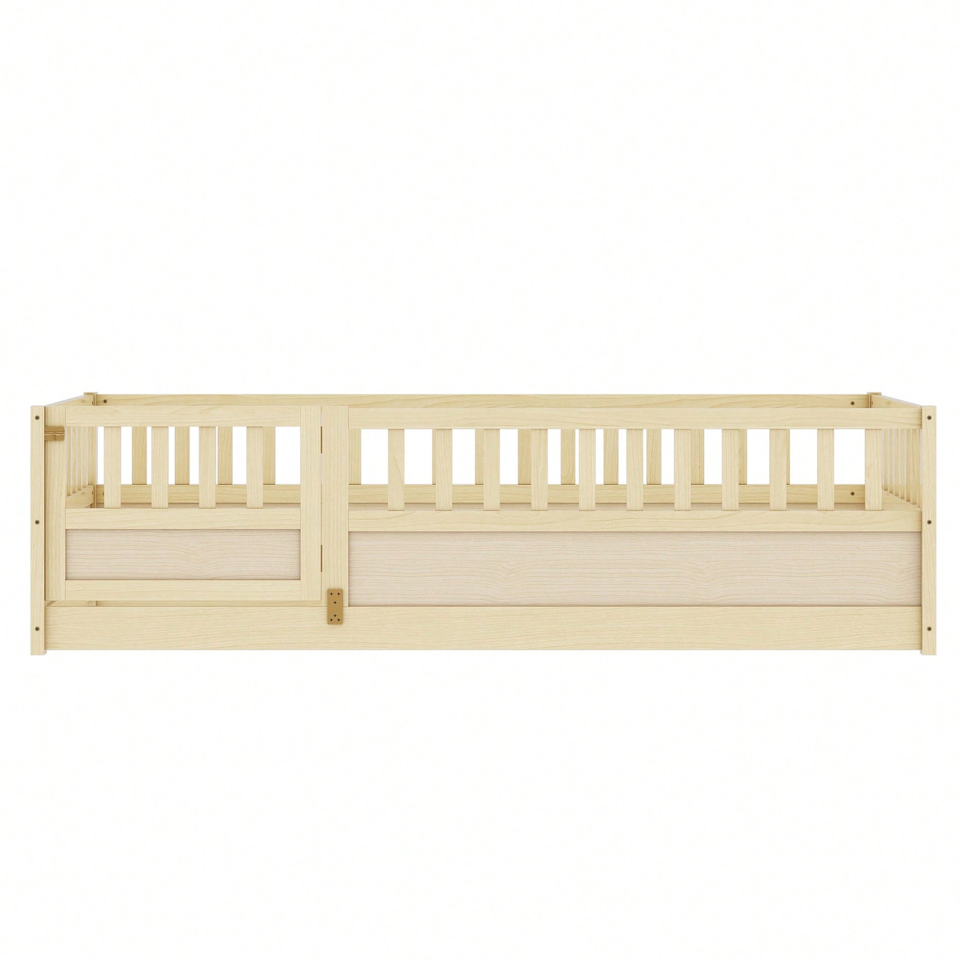 Montessori Twin Size Floor Bed With High Security Barrier And Door - Natural Wood Children's Bed Frame