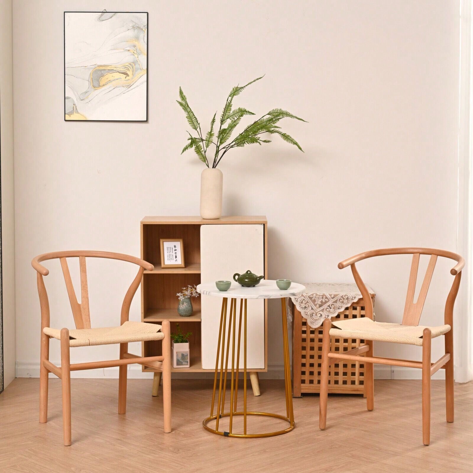 Enhance the look of your dining room or kitchen with this set of two natural solid wood wishbone design backrest chairs. Made from sturdy and durable beech wood, these chairs feature a woven cushion for added comfort. The modern and practical design of these chairs adds a touch of elegance to any space. With a weight capacity of 200lbs, these chairs are not only stylish but also functional. Assembly is required, but the end result is well worth it for the lasting beauty and reliability of these chairs.