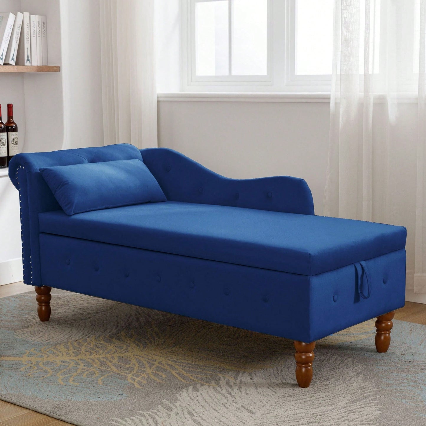 Navy Blue Plush Chaise Lounge Chair with Storage and Pillow Modern Upholstered Rolled Arm for Living Room Bedroom Office