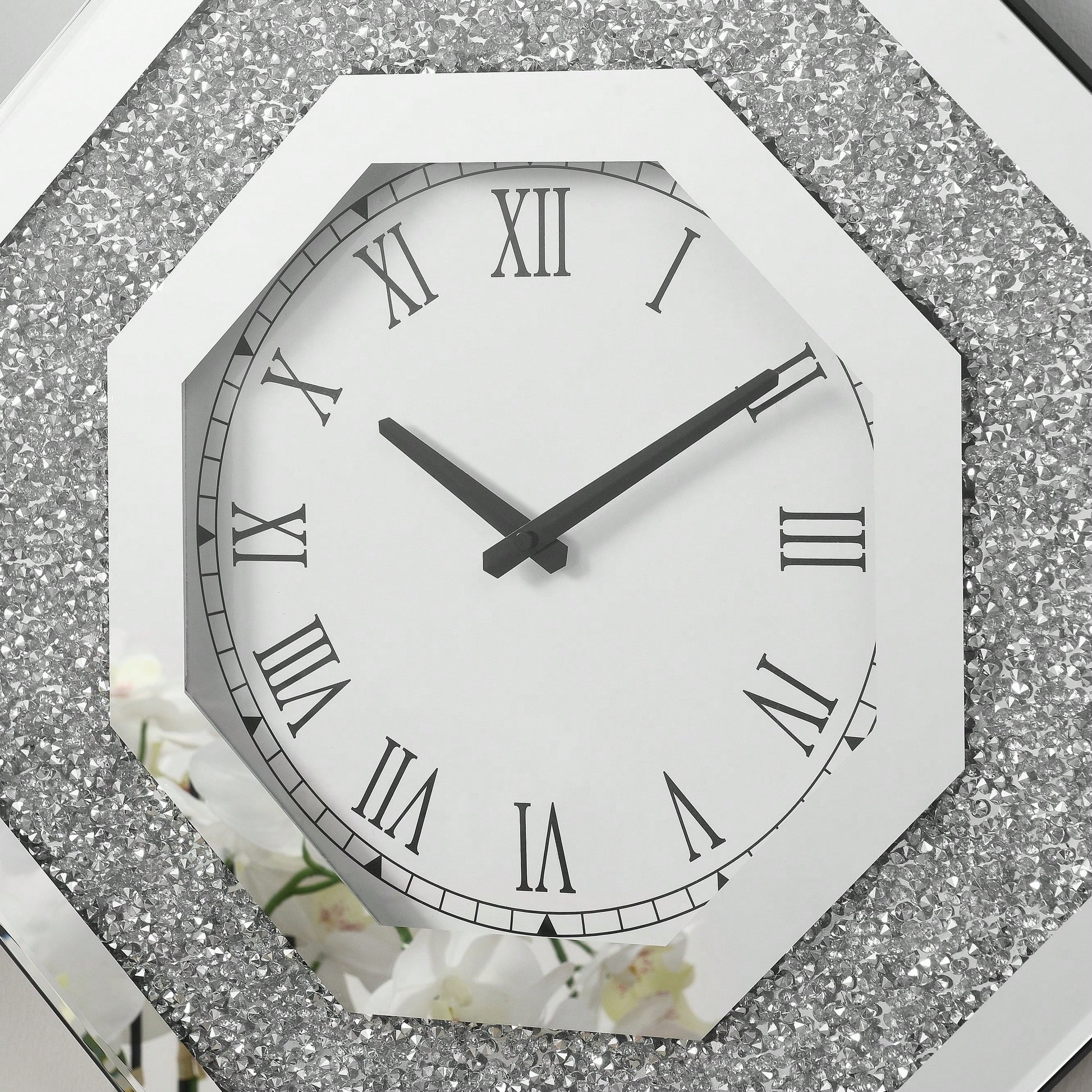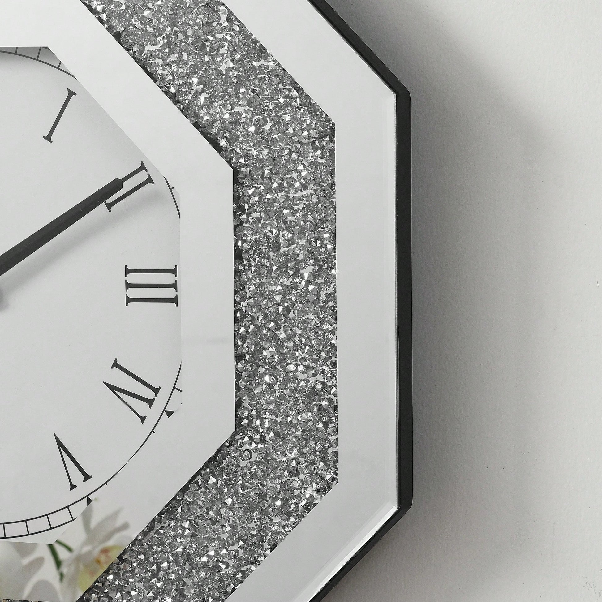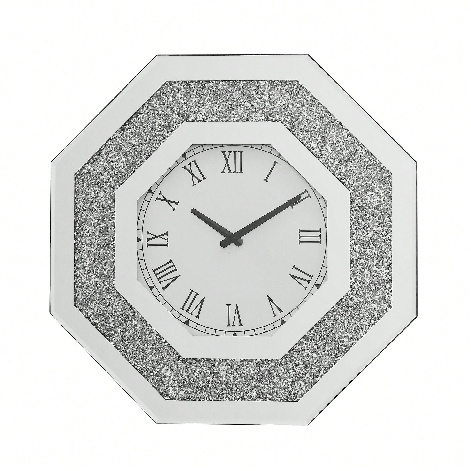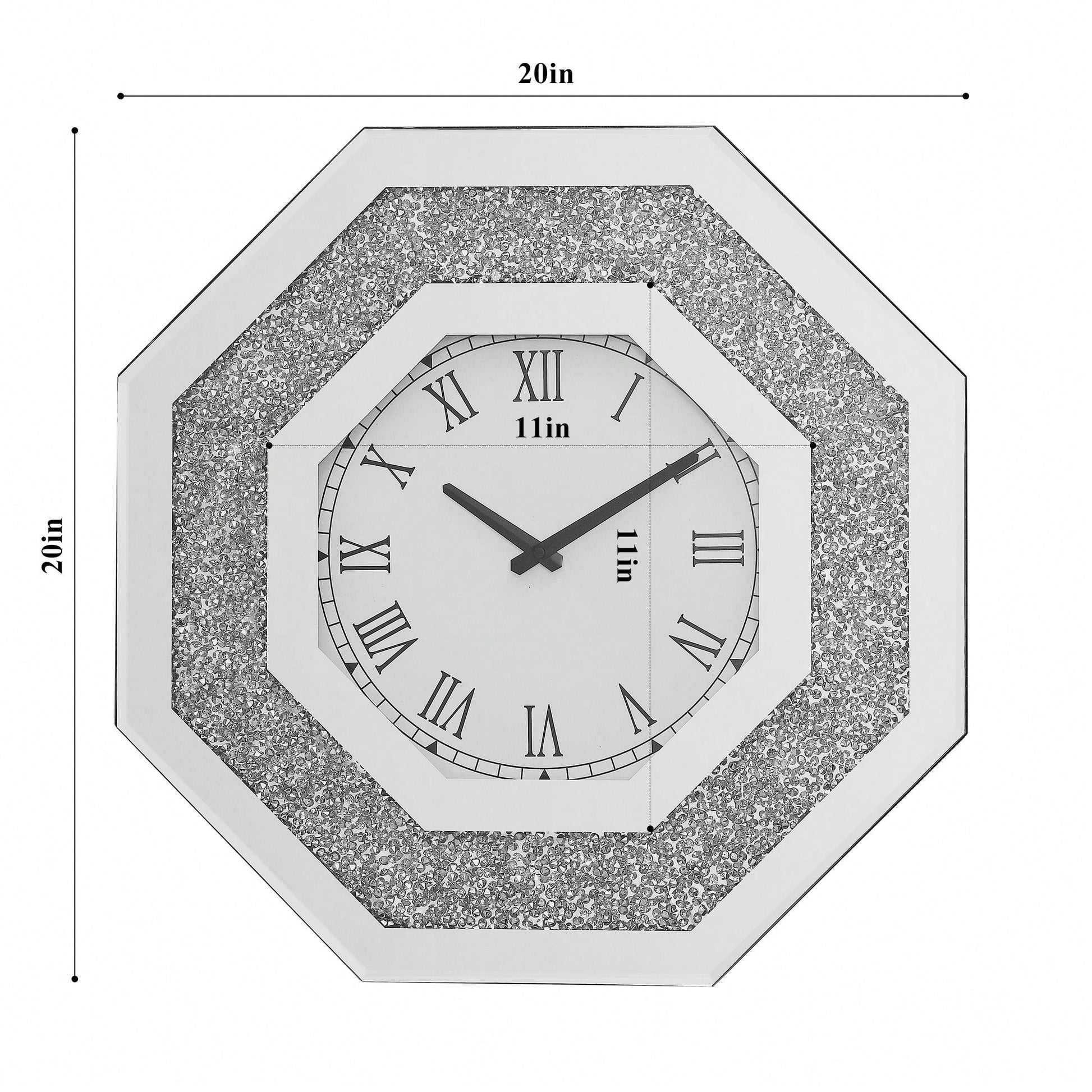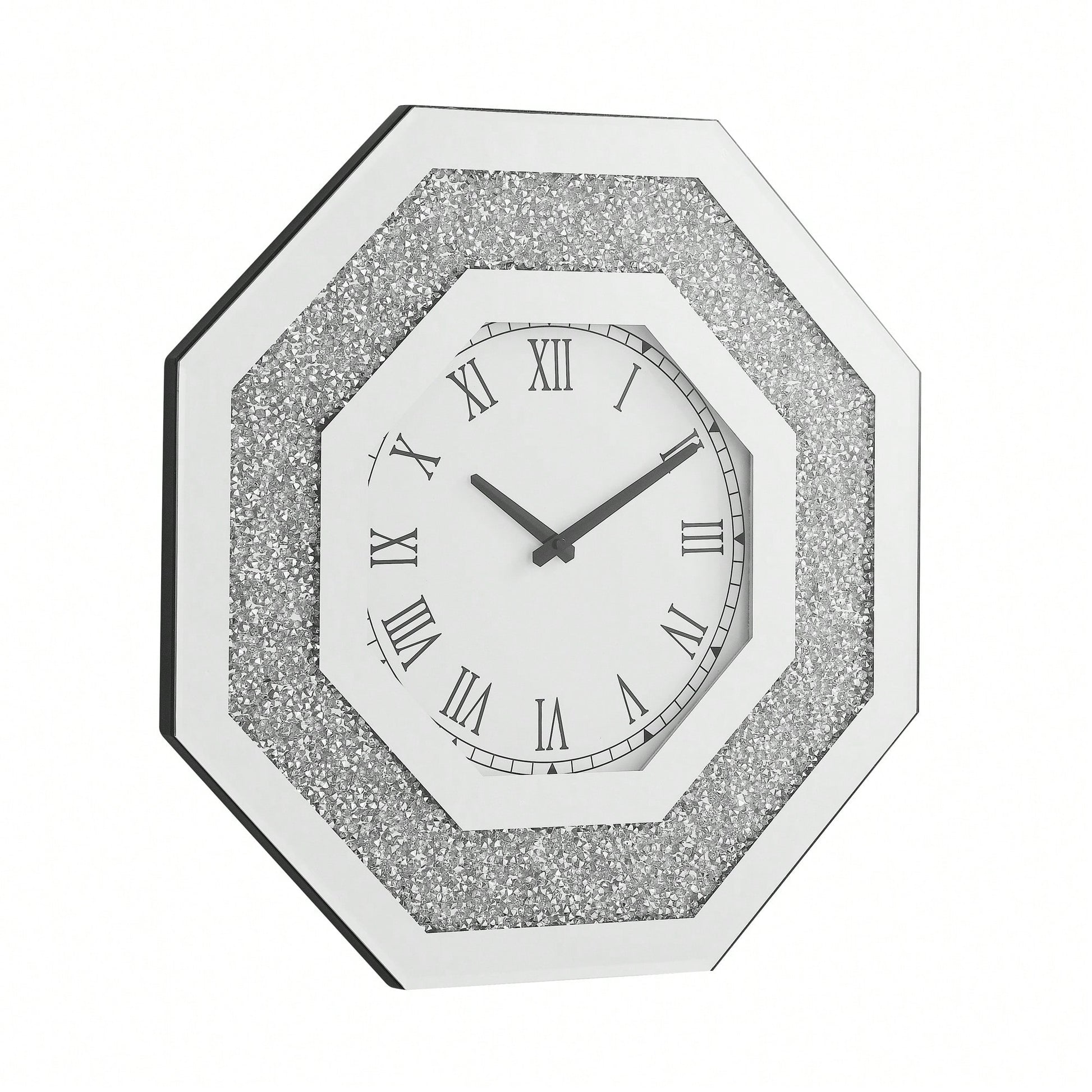 This octagonal wall clock is a stunning addition to any living space, serving as a focal point in your living room or bedroom. It boasts a chic octagonal frame adorned with sparkling floating crystal diamonds against a sleek black background. The clock face displays Roman numerals, blending simplicity with modern elegance. Its stylish design makes it an eye-catching piece that enhances the decor of any room.
