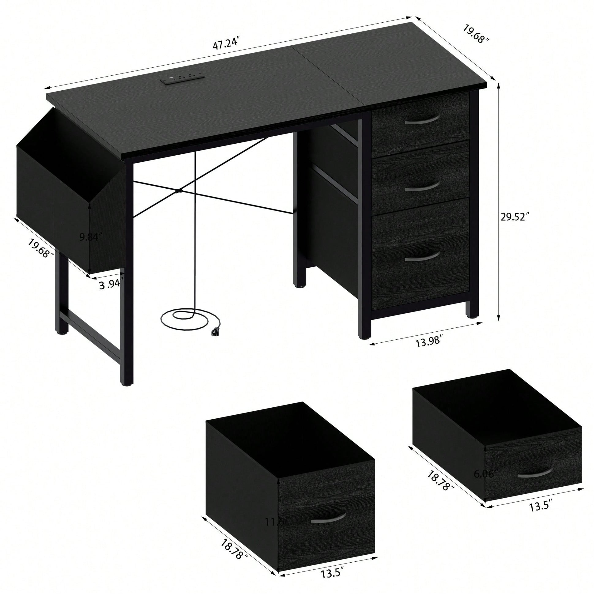 This 47-inch office desk is designed for both functionality and style, making it ideal for home offices and study spaces. It includes a hidden power outlet with two standard outlets, one USB port, and one Type-C port, allowing you to charge devices and keep your workspace organized without messy cables. The desk features three fabric drawers, providing ample storage for documents, stationery, and personal items, along with a large side pocket for easy access to essentials. Its adjustable and reversible design allows you to customize the layout to suit your needs. Built with a thickened metal X-shaped frame, this desk ensures stability and durability while maintaining a modern aesthetic. The steel adjustable foot pads help prevent wobbling on uneven floors and protect your flooring from scratches.