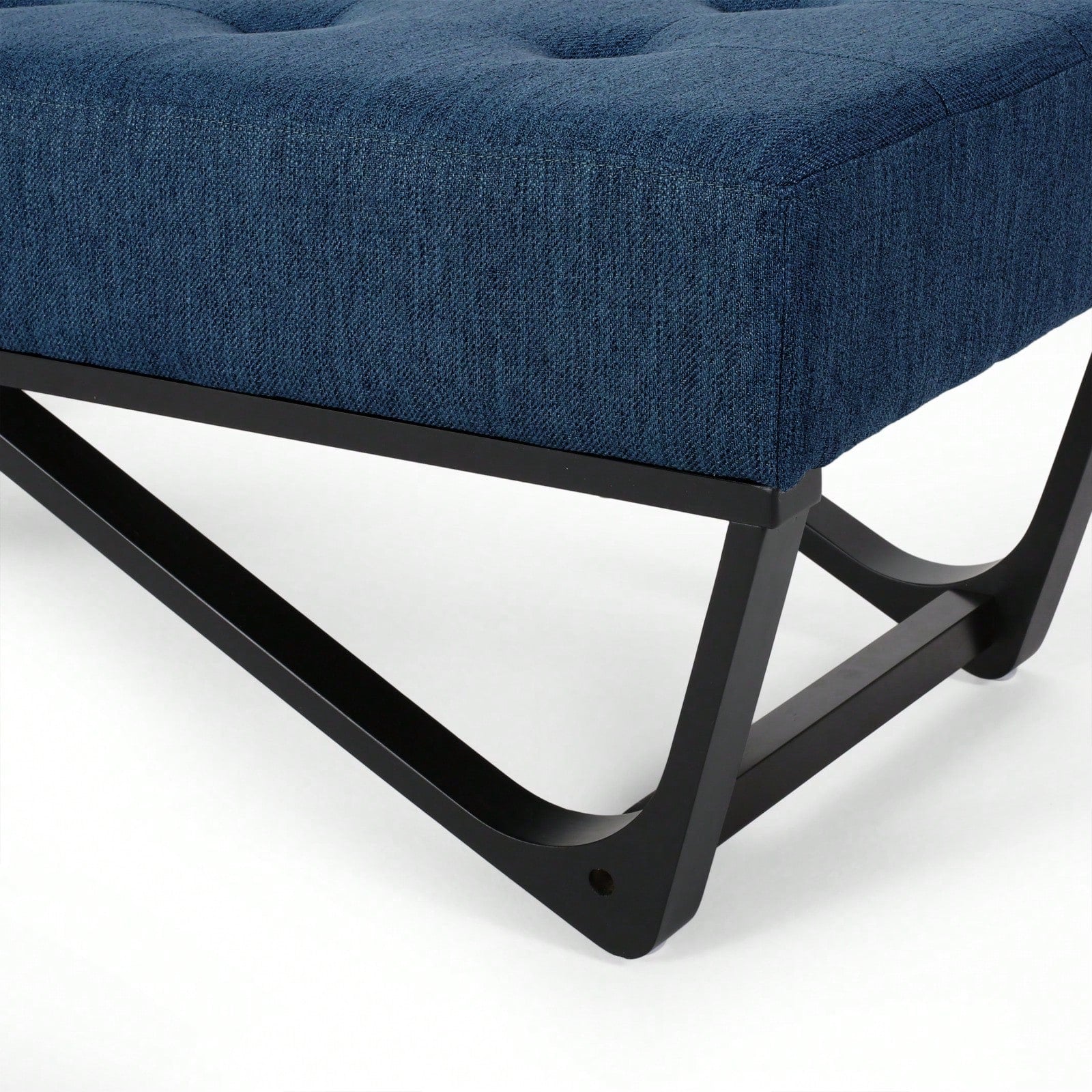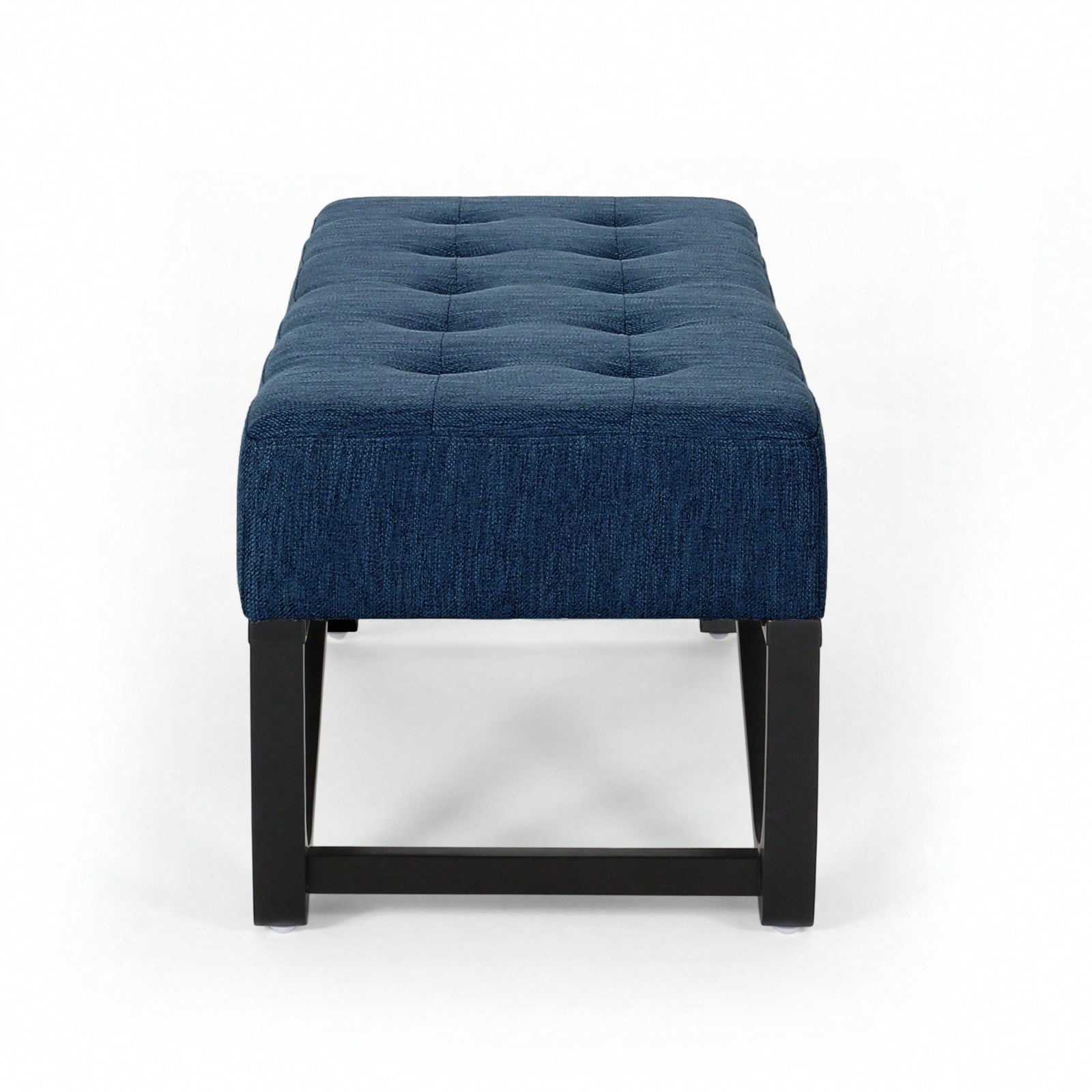 Elevate your space with elegance using this navy blue ottoman. This sophisticated bench instantly commands attention and adds a modern flair to any living room or bedroom. Its plush, button-tufted, waffle-stitched top and elegant leg frame create a chic aesthetic. The bentwood design features a smooth geometric base, enhancing its contemporary style. Experience unparalleled comfort and versatility with this ultimate home addition.