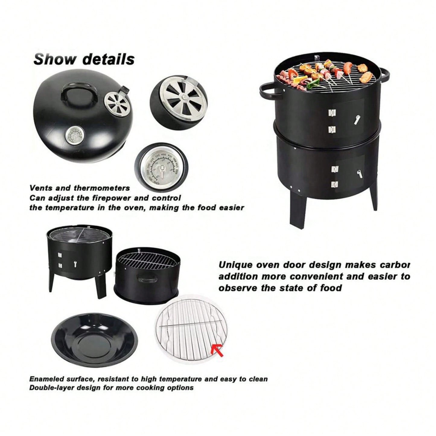 This outdoor double-layer grill is designed for charcoal wood-fired braising and smoking. It addresses the issue of oil fumes commonly associated with traditional barbecue methods by utilizing a vertical charcoal fire. The innovative design allows oil produced during cooking to fall into a designated sink, keeping it away from the charcoal and significantly reducing smoke. The evenly distributed firepower from bottom to top ensures that food is cooked uniformly, resulting in tender and delicious meat without the need for flipping skewers. This product offers barbecue enthusiasts a more enjoyable and hassle-free grilling experience.