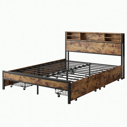 1. Key Features: - Queen size bed frame with 4 storage drawers for optimal organization - Metal platform construction with a wooden headboard and built-in charging station - Noise-free design with protective footpads to ensure a quiet sleep environment - Easy assembly with clearly labeled parts and instructions for single-person setup - Durable design featuring central support bar and heavy-duty slats for strong mattress support 2. Product Description: This queen size bed frame combines style and functionality with its metal platform structure and elegant wooden headboard. The built-in charging station includes 2 standard plug outlets and 2 USB ports, allowing for convenient access to power for your devices. The headboard features 5 storage compartments, perfect for books and decorative items. The frame includes 4 rolling drawers that provide additional storage space, making it easy to keep your bedroom organized. Designed for durability, it features a central support bar and multiple slats to ensure stability and support for various mattress types. The noise-free design prevents squeaks and protects your floors, ensuring a peaceful night's sleep. Assembly is straightforward, with all parts included in one box and clearly labeled for easy installation. Specifications: - Bed Frame Type: Queen - Storage Drawers: 4 on wheels - Charging Station: 2 outlets and 2 USB ports - Material: Metal frame with wooden headboard - Assembly: Easy, with labeled parts - Noise Reduction: Yes - Support Structure: Central support bar and heavy-duty slats