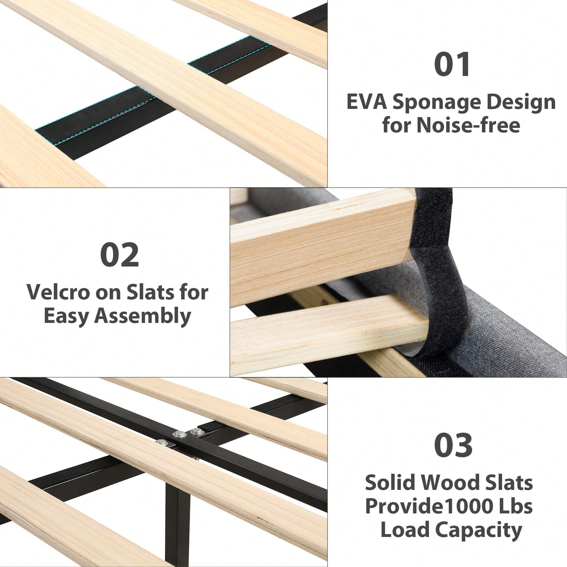 1. Features: - Queen size bed with storage headboard and 2 footboard drawers - Grey color with RGB LED lights, USB, Type-C, and power outlet - 7 scene modes, 3 speed levels, and 3 brightness modes for LED lights - Under-bed storage for luggage and other items; compatible with sweeping robots - Durable stainless steel frame with wood slats for stability and noise reduction 2. Product Description: This queen size bed features a stylish storage headboard with two drawers in the footboard, designed in a sophisticated grey color. The integrated RGB LED lights enhance the ambiance of your bedroom, offering 7 scene modes and adjustable speed and brightness. With convenient USB and Type-C ports, along with a power outlet on the headboard, you can easily charge your devices. The thoughtful design includes a side pocket for remote controls or cell phones, ensuring everything you need is within reach. The under-bed storage space is perfect for organizing luggage, shoe cases, and storage boxes, while allowing sweeping robots to maintain a clean environment. Constructed with a solid stainless steel frame and wood slats, this bed provides durability and stability, ensuring a quiet night's sleep. Assembly is straightforward with included instructions and numbered parts, making it easy to set up without additional tools. The classical neutral-toned linen fabric upholstery adds a touch of elegance, making this bed a perfect fit for modern bedrooms. Specifications: - Size: Queen - Color: Grey - LED Features: RGB, 7 scene modes, 3 speed levels, 3 brightness modes - Ports: 1 USB, 1 Type-C, 1 power outlet - Frame Material: Stainless steel with wood slats - Assembly: Includes instructions and numbered parts