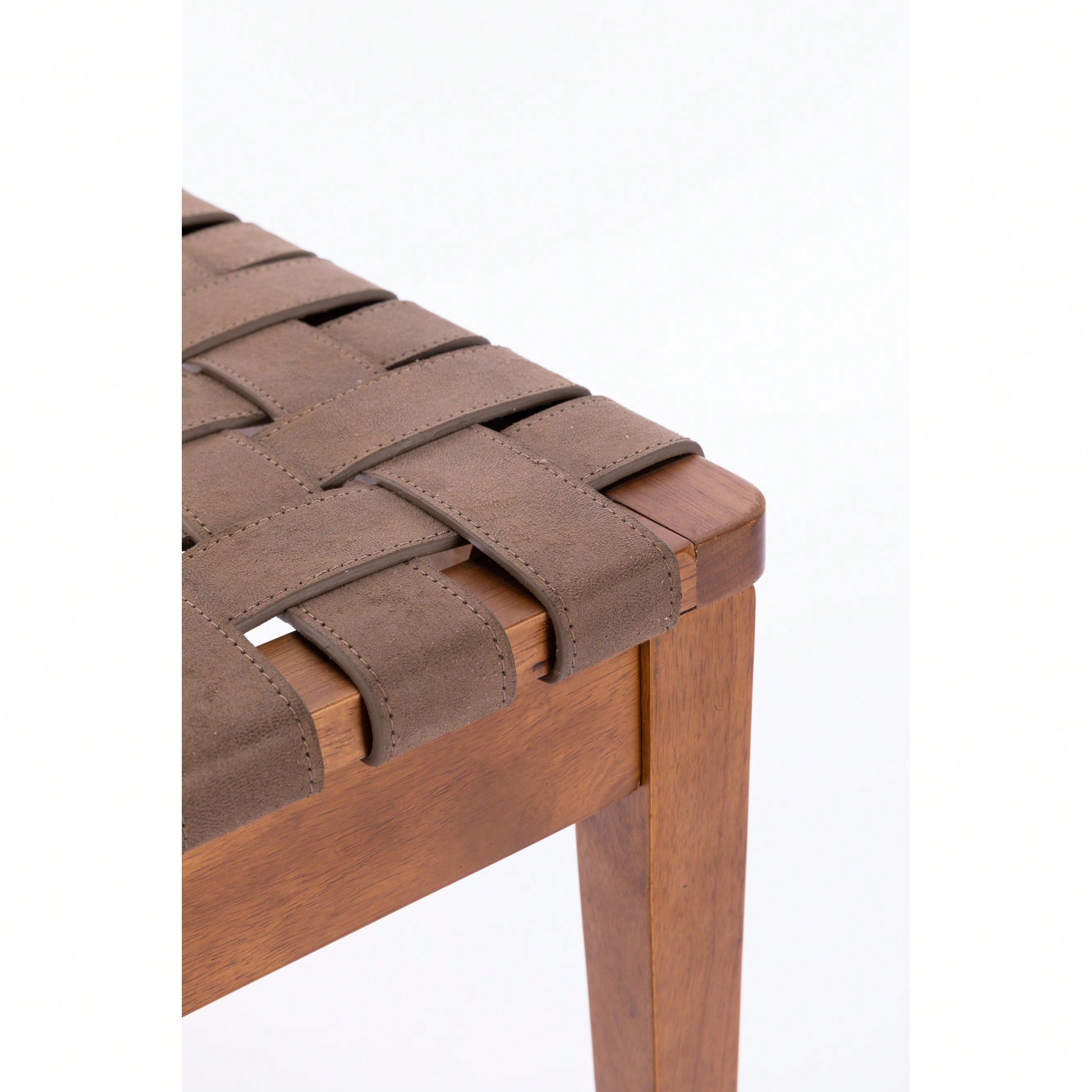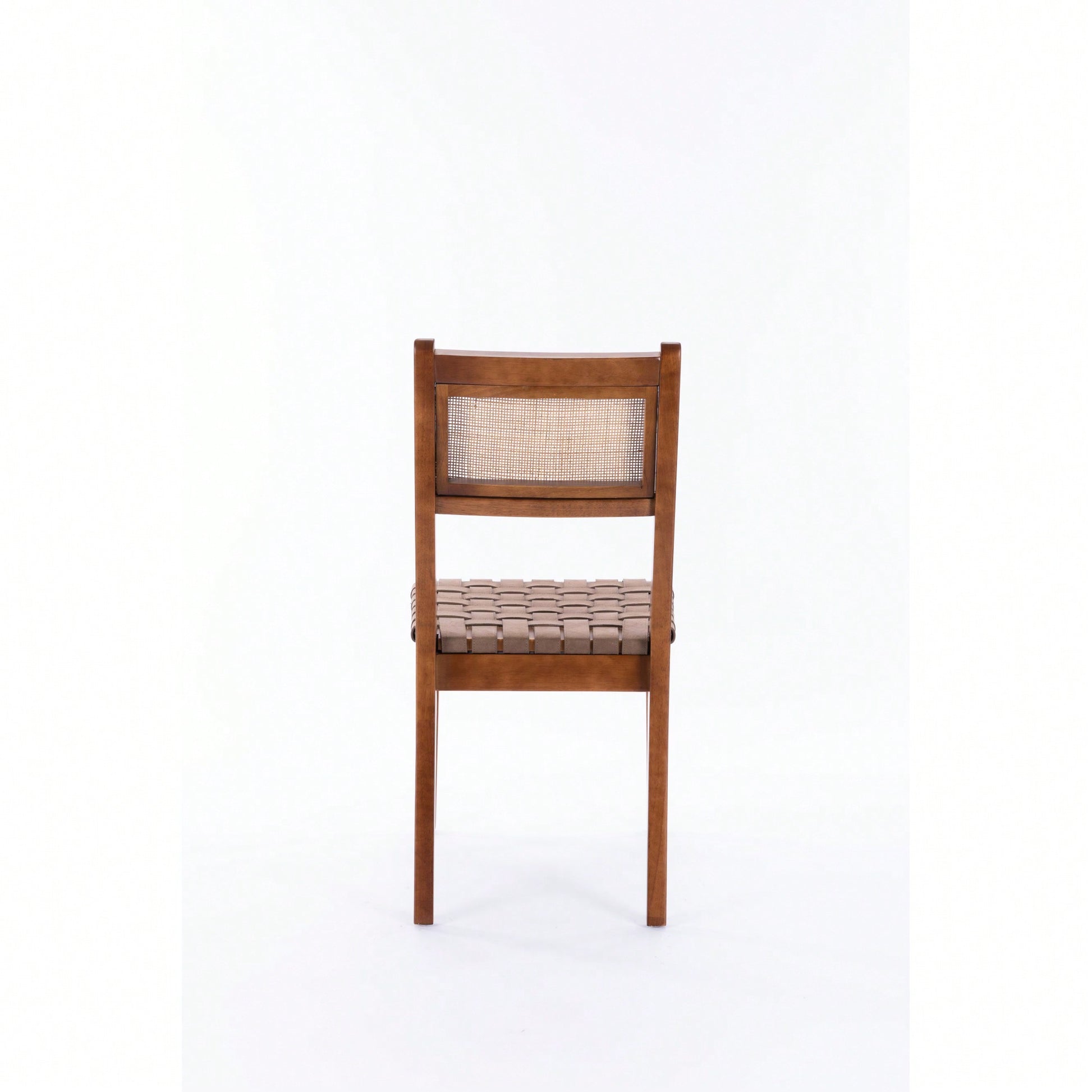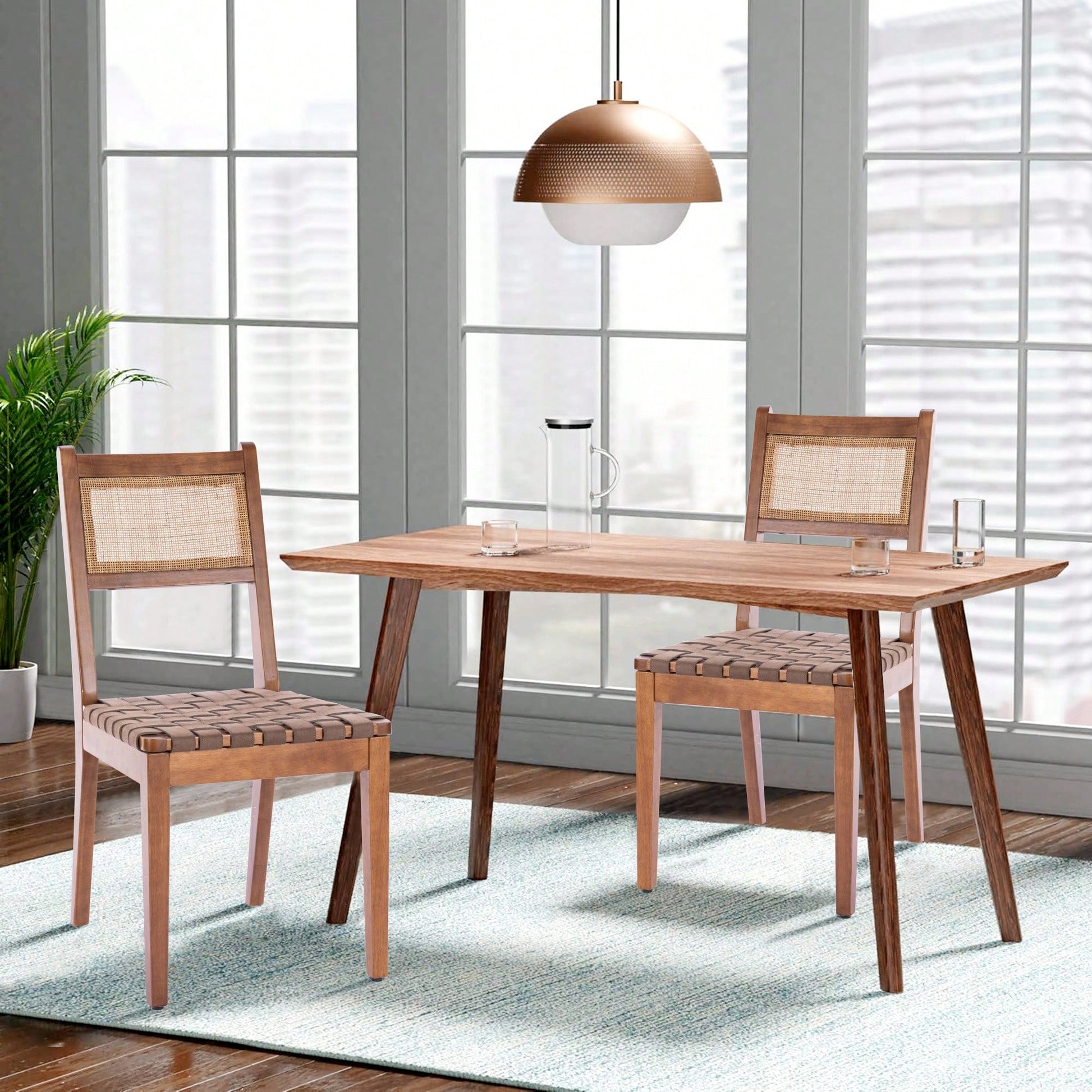This set of two kitchen and dining chairs features a modern design with woven faux leather straps and a rattan back. The soft-to-touch faux leather is complemented by a durable solid wood frame, ensuring stability and longevity. These chairs are perfect for various settings, including dining rooms, kitchens, and living spaces, making them a versatile addition to your home. Their breathable seat design enhances comfort while adding a trendy flair to your interior.