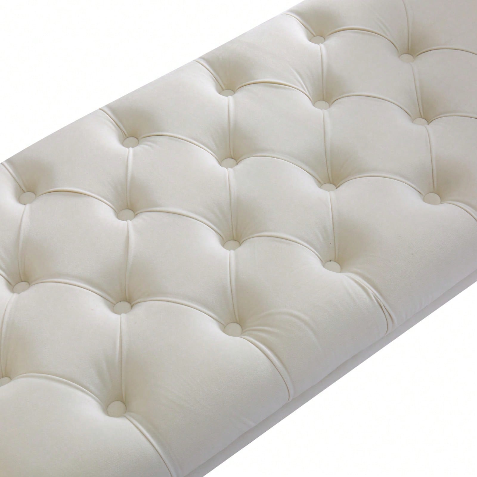 Rectangle bench in beige color for bedroom or entry space. Versatile use as seating or footrest. High-quality velvet fabric cushioning for comfort. Sturdy design with button-tufted details. Easy assembly with included instructions.