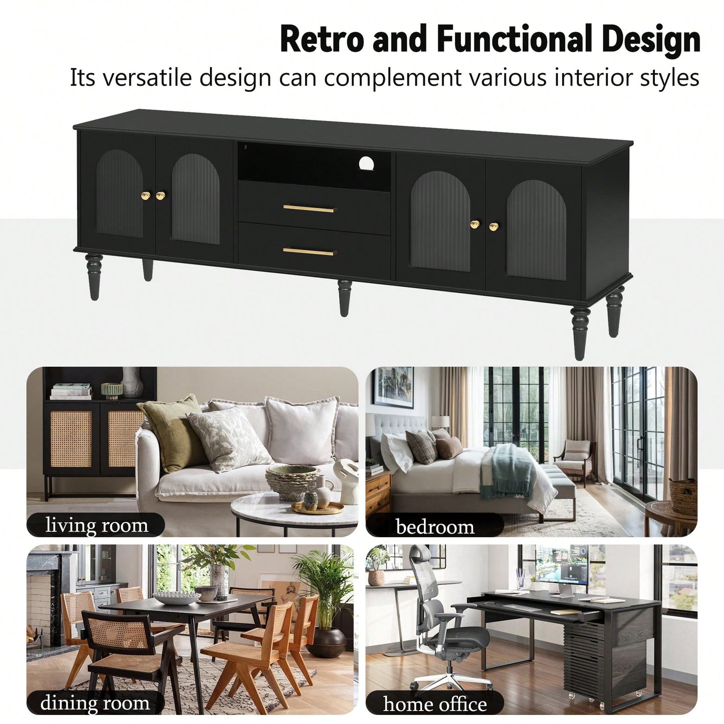 1. Key Features - Accommodates TVs up to 75 inches - Sturdy top surface for TV and décor items - Includes 2 drawers and 2 spacious cabinets for storage - Constructed from high-quality MDF and solid wood legs - Adjustable leg height up to 0.6 inches 2. Product Description This retro TV stand is designed to enhance your living space while providing ample support for large televisions. With a robust top surface, it allows for the placement of your TV along with decorative items such as vases or picture frames. The stand features two drawers and two cabinets, offering convenient storage for items you wish to keep hidden, like remote controls and board games. Made from durable MDF and solid wood, it ensures long-lasting use. The adjustable legs provide flexibility in height, while the built-in cable management hole helps maintain a tidy appearance by concealing wires. For added safety, an anti-tip device is included, and the product comes with all necessary parts and easy-to-follow instructions for quick assembly. Specifications: - TV Size Capacity: Up to 75 inches - Material: MDF and solid wood legs - Adjustable Leg Height: 0.6 inches - Storage: 2 drawers and 2 cabinets - Cable Management: Yes - Safety Features: Anti-tip device included