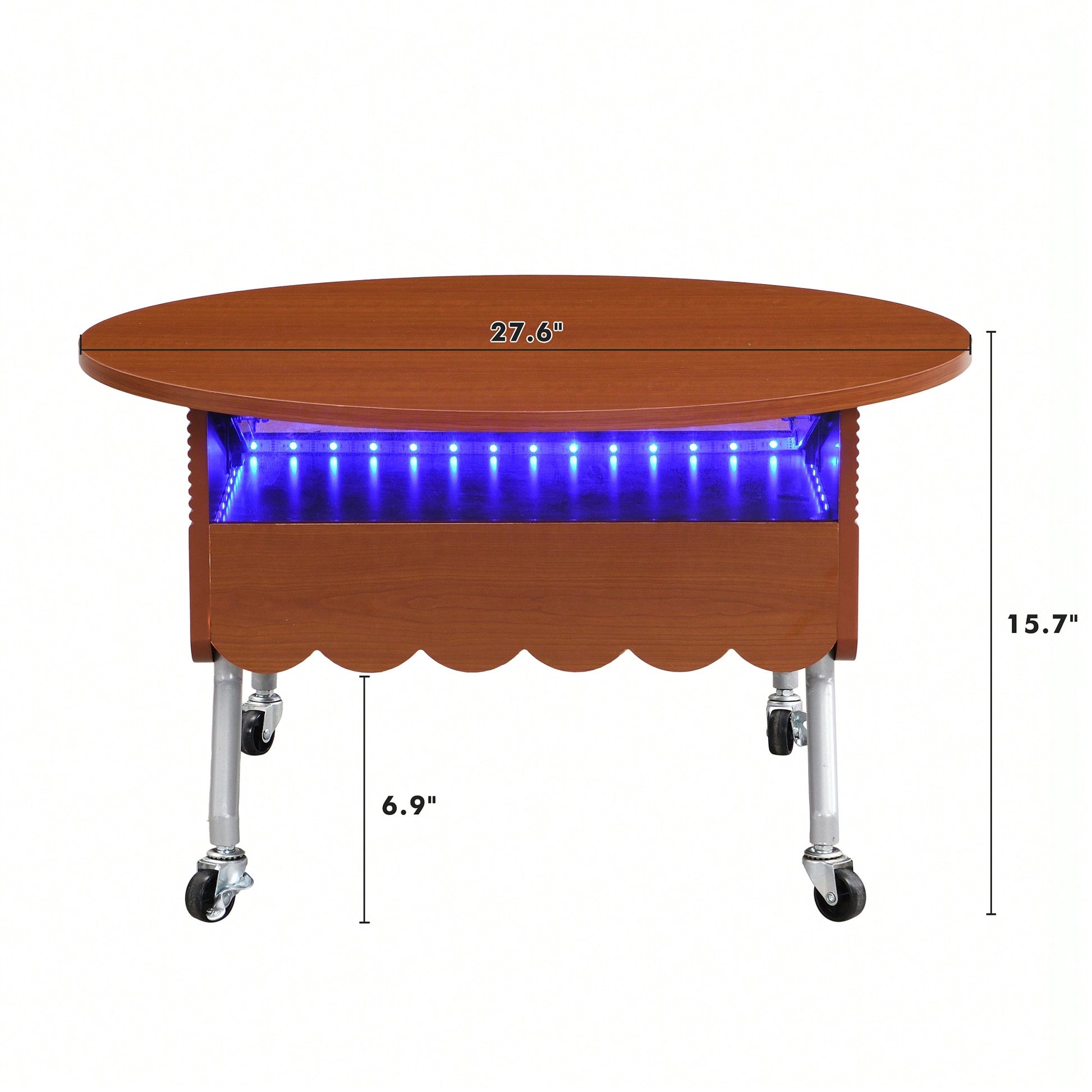 **Key Features** - Lift-top design for versatile use, ideal for working or dining - Hidden storage compartment for remote controls and personal items - Open transparent shelves for displaying decorations and easy access to essentials - Built-in multi-color LED lighting for customizable ambiance - Wheels for easy mobility and quick rearrangement **Product Description** This round lift-top coffee table combines functionality and style, making it perfect for compact living spaces. The innovative lift-top mechanism elevates the tabletop, providing a convenient surface for various activities. With a hidden storage compartment, you can keep your living area organized by storing smaller items out of sight. The open transparent shelves allow for decorative displays and easy access to daily essentials. Enhanced with multi-color LED lighting, this table adds a modern touch to your living room, creating the perfect atmosphere for relaxation or entertainment. Its sturdy metal frame ensures durability while the wheels make it easy to move around your space as needed. **Specifications** - Dimensions: 27.6 inches - Material: Metal frame - Lighting: Multi-color LED - Design: Lift-top and wheeled for mobility