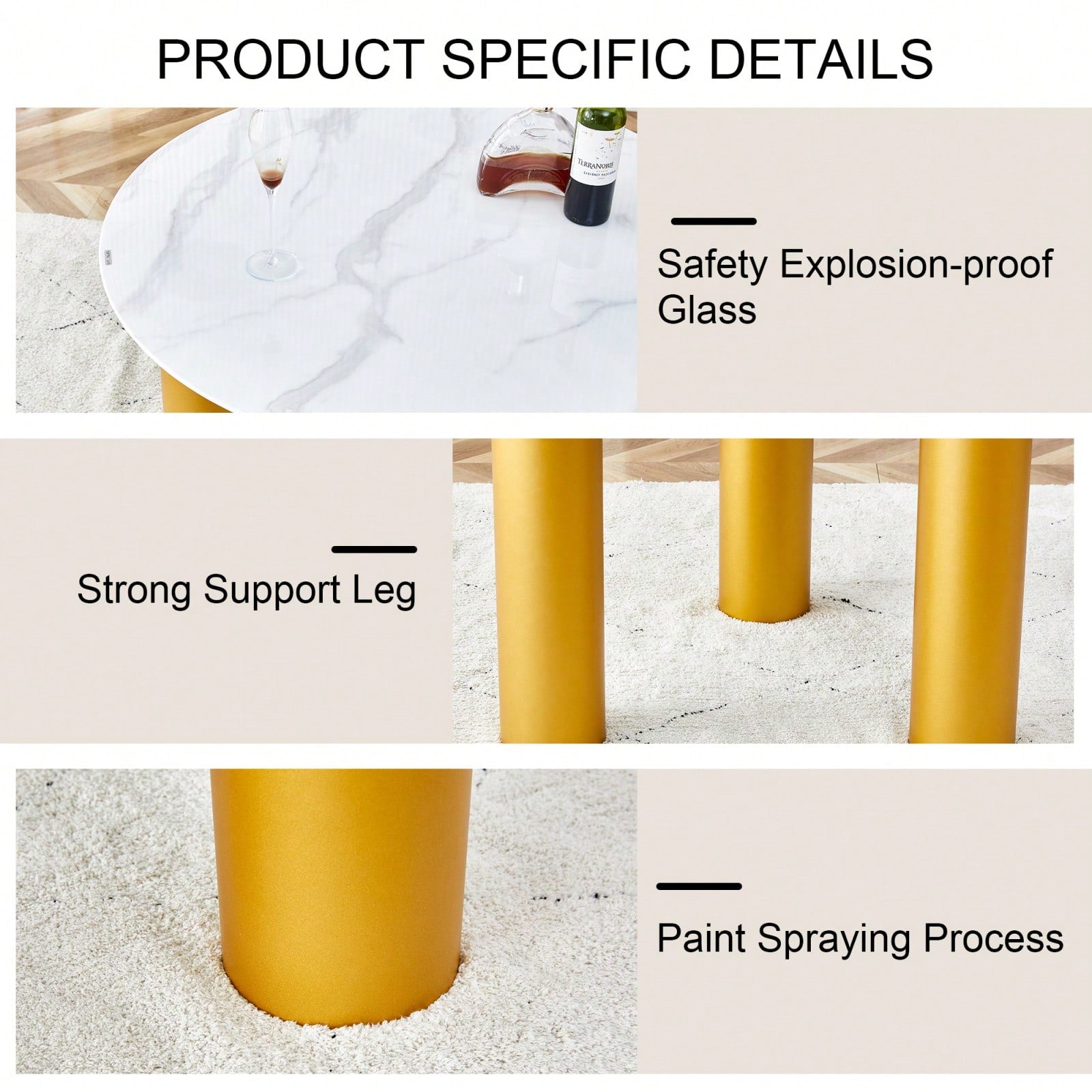 1.This round white dining table is the perfect addition to your kitchen, dining room, or living room. Featuring a tabletop with artificial marble glass stickers and golden MDF legs, this table boasts a stylish, modern aesthetic that will complement a variety of home decor styles.