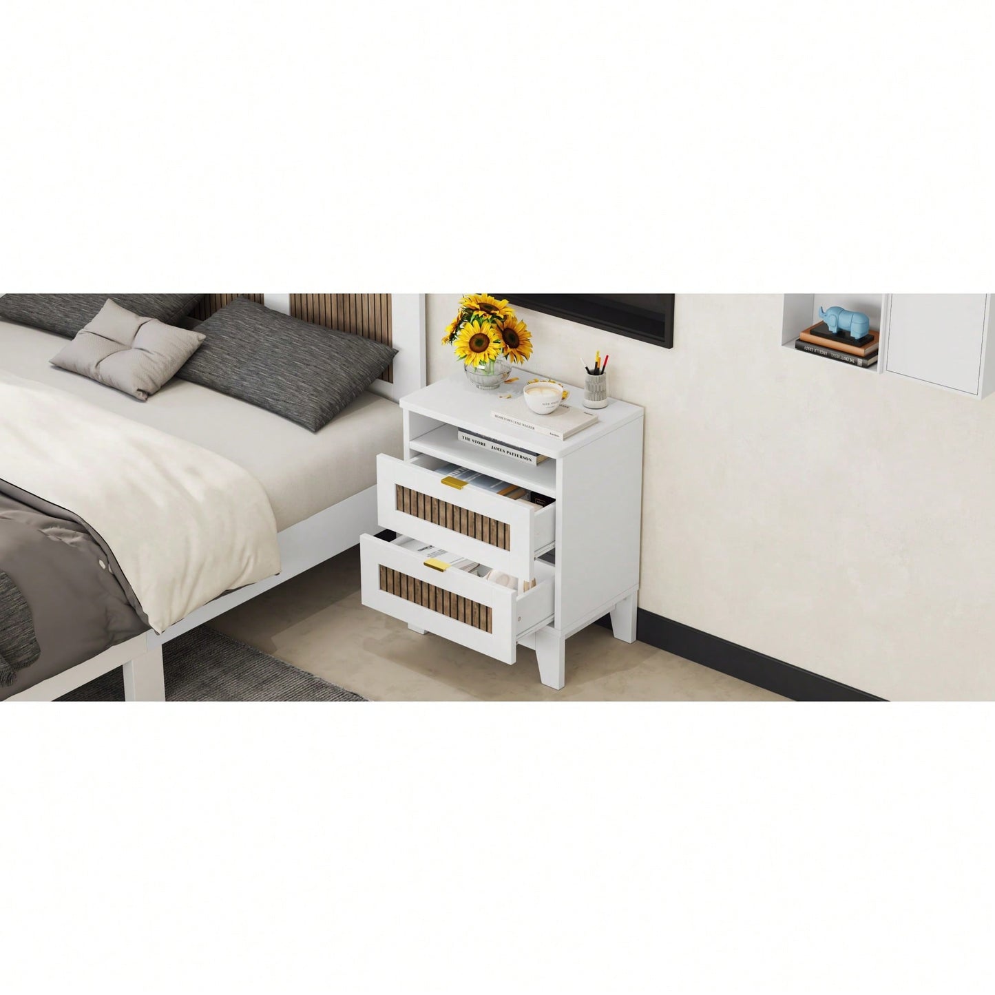Add a touch of rustic elegance to your bedroom with this 2-Drawer Farmhouse Wooden Nightstand. This beautifully designed piece combines classic farmhouse aesthetics with modern practicality, making it a perfect addition to any bedroom decor. With its charming wooden strip decoration, stylish metal handles, and sleek white finish, this nightstand serves as both a functional storage solution and a decorative accent for your home.