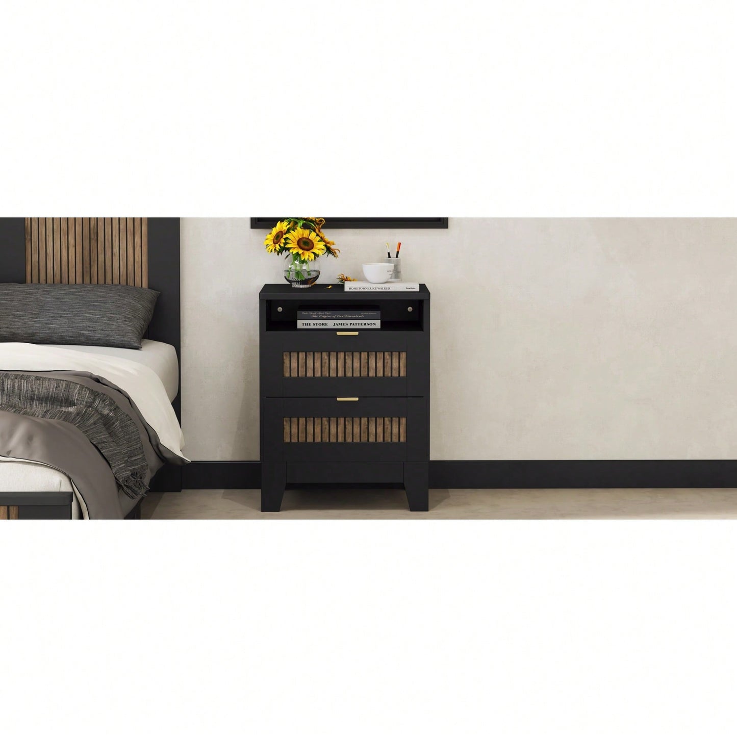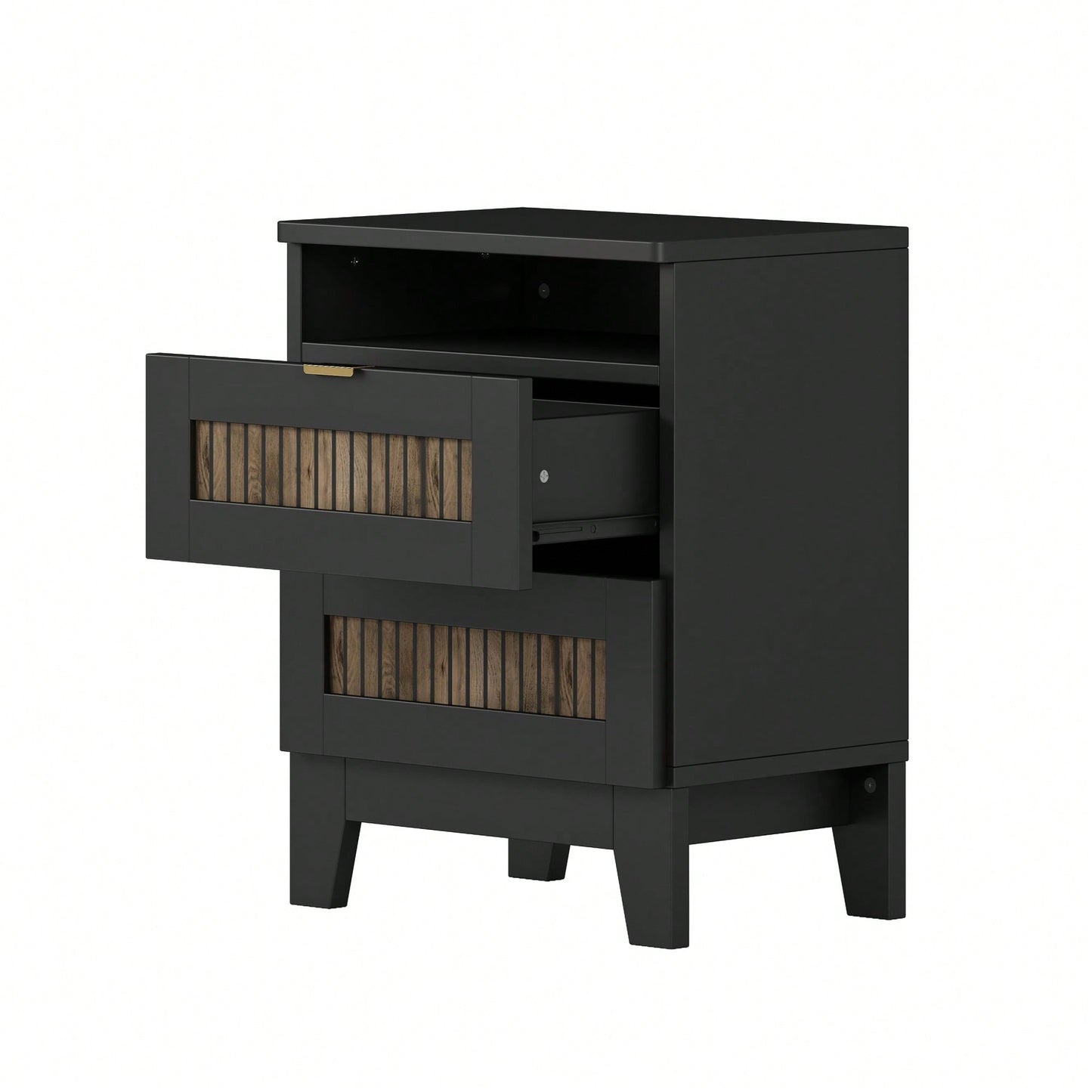 Rustic 2-Drawer Wooden Nightstand With Metal Handles And Wooden Strip Decoration For Bedroom Storage