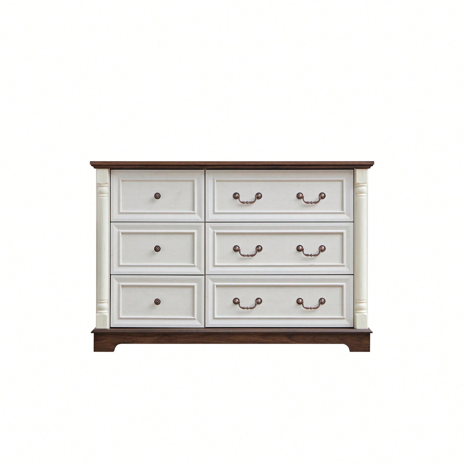 1. Key Features - Antique two-tone finish with a dimpled texture - 6 smooth-gliding drawers for ample storage - Durable solid wood construction for long-term use - Versatile design suitable for various spaces - Easy assembly with labeled parts 2. Product Description This 6-drawer dresser adds warmth and charm to any bedroom or living area. With its rustic style and sturdy wooden base, it features an antique two-tone finish that enhances its visual appeal. The dresser includes six spacious drawers, perfect for organizing clothing, blankets, or other items, helping to keep your space tidy and clutter-free. Its durable construction ensures long-lasting use without strong odors, while the padded tabletop provides additional space for decor or essentials. Ideal for bedrooms, nurseries, entryways, or living rooms, this dresser complements shabby chic aesthetics beautifully. Specifications: - Drawer capacity: 25 pounds each - Top surface capacity: 100 pounds - Material: Solid wood and manufactured wood - Finish: Dimpled neutral finish